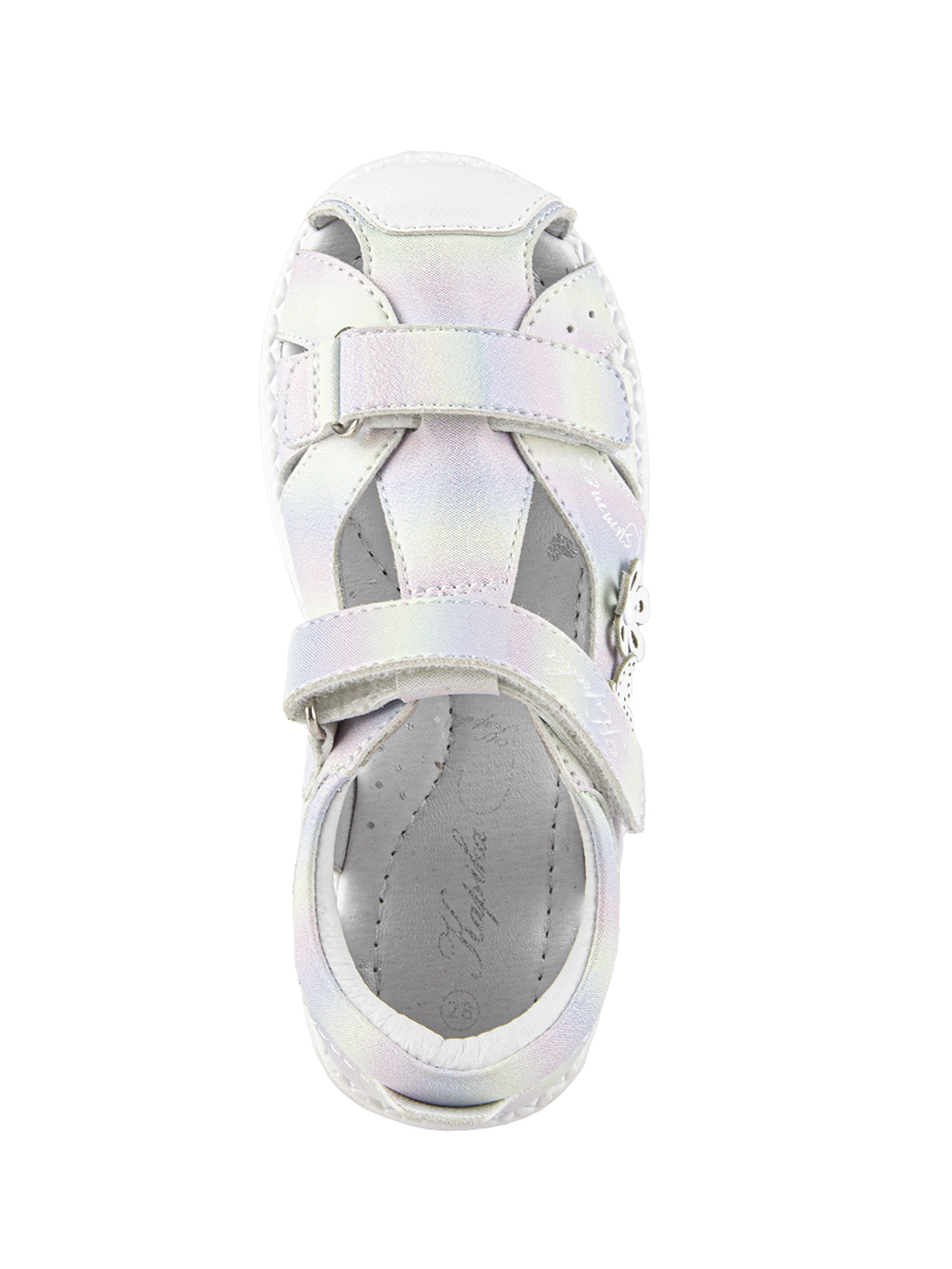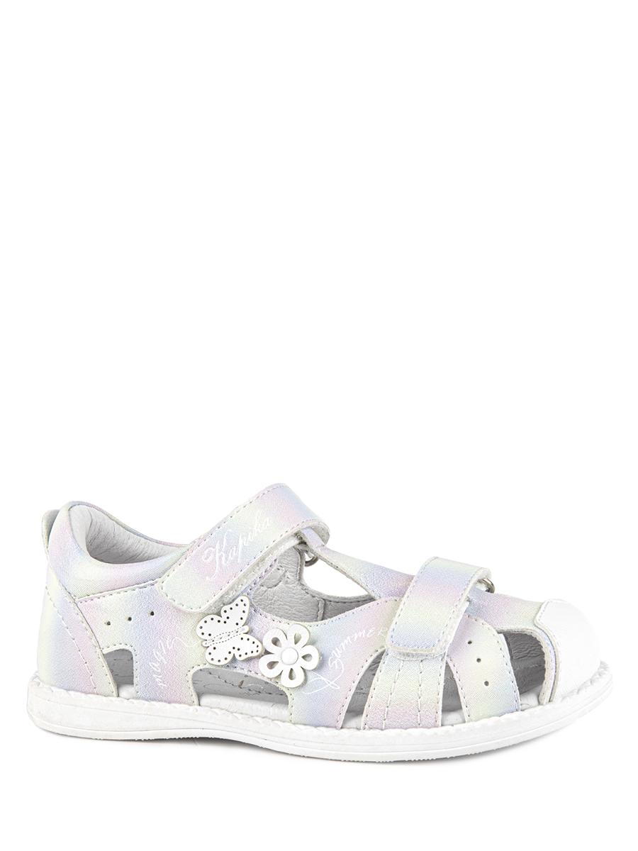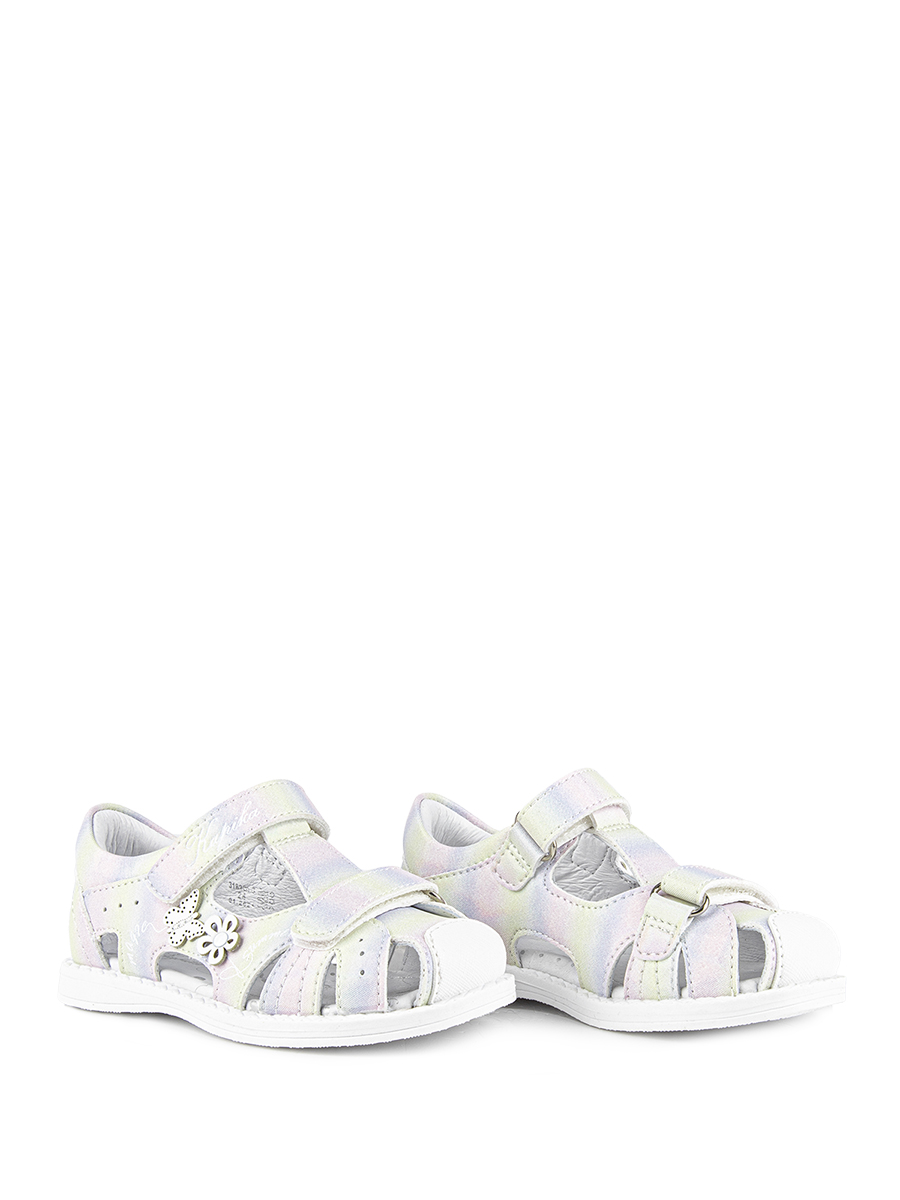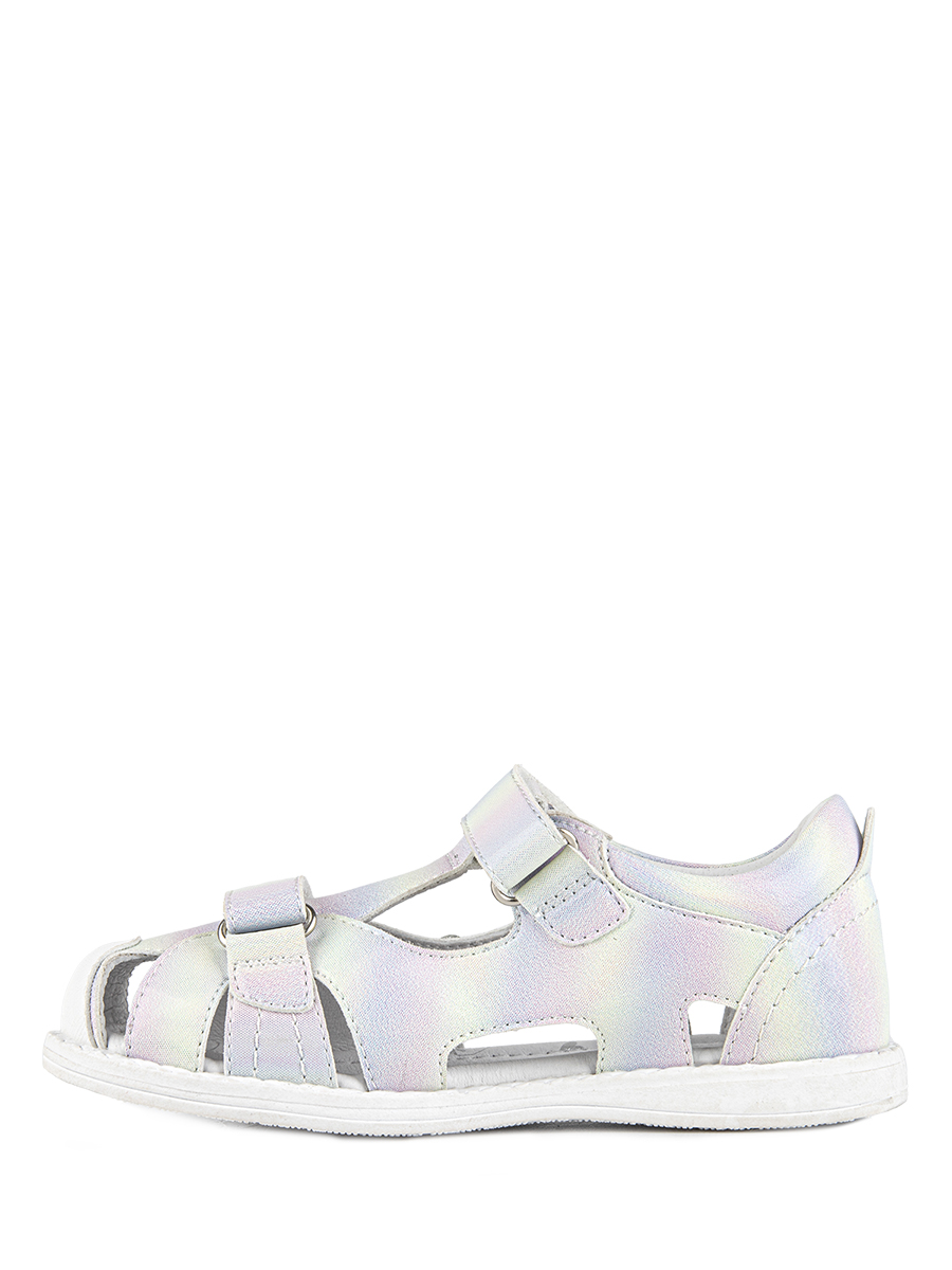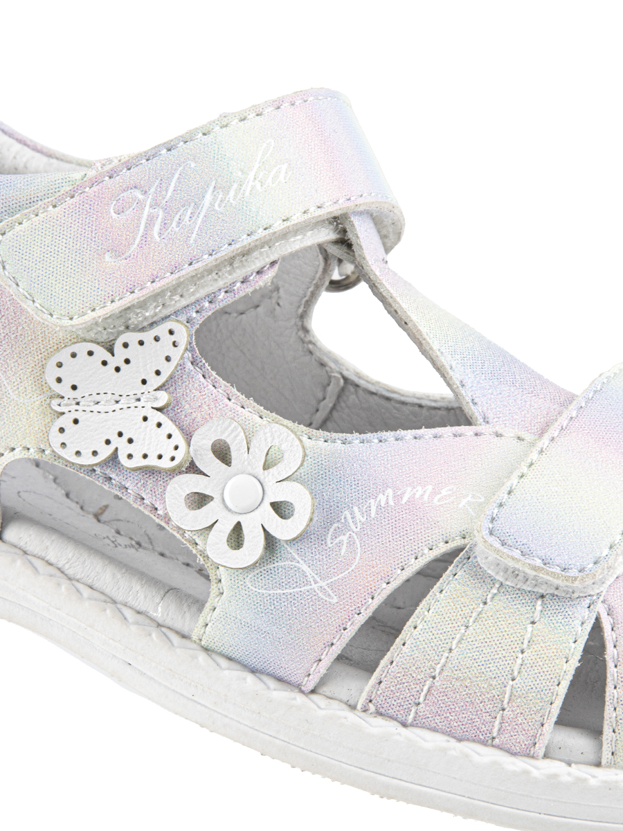 Эти сандалии для девочки изготовлены из искусственного материала для верхней части, но имеют подкладку и стельку из натуральной кожи для комфорта. Они также имеют жесткий задник и подсводник для поддержки и формирования правильной формы стопы. Подошва сделана из термопластичной резины (TPR), что обеспечивает долговечность и сцепление с поверхностью.