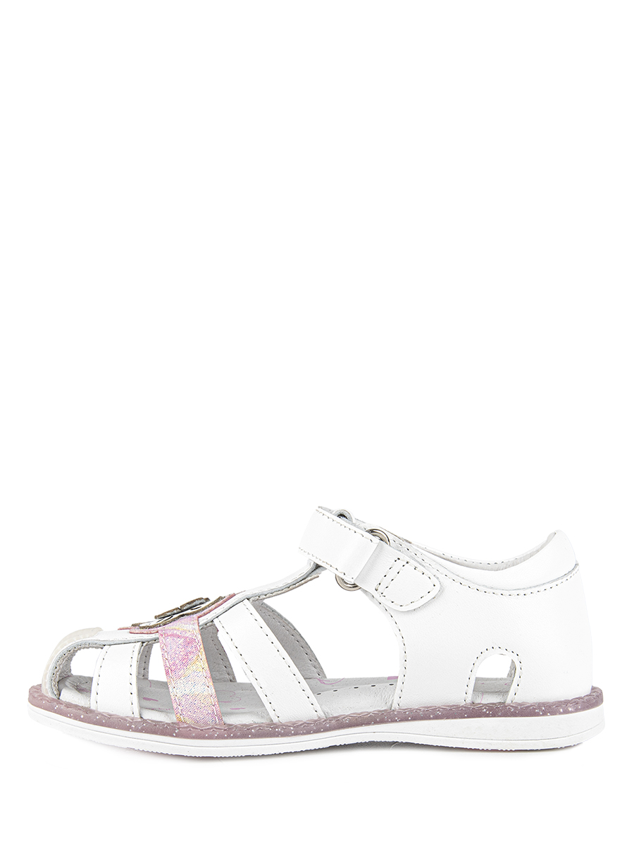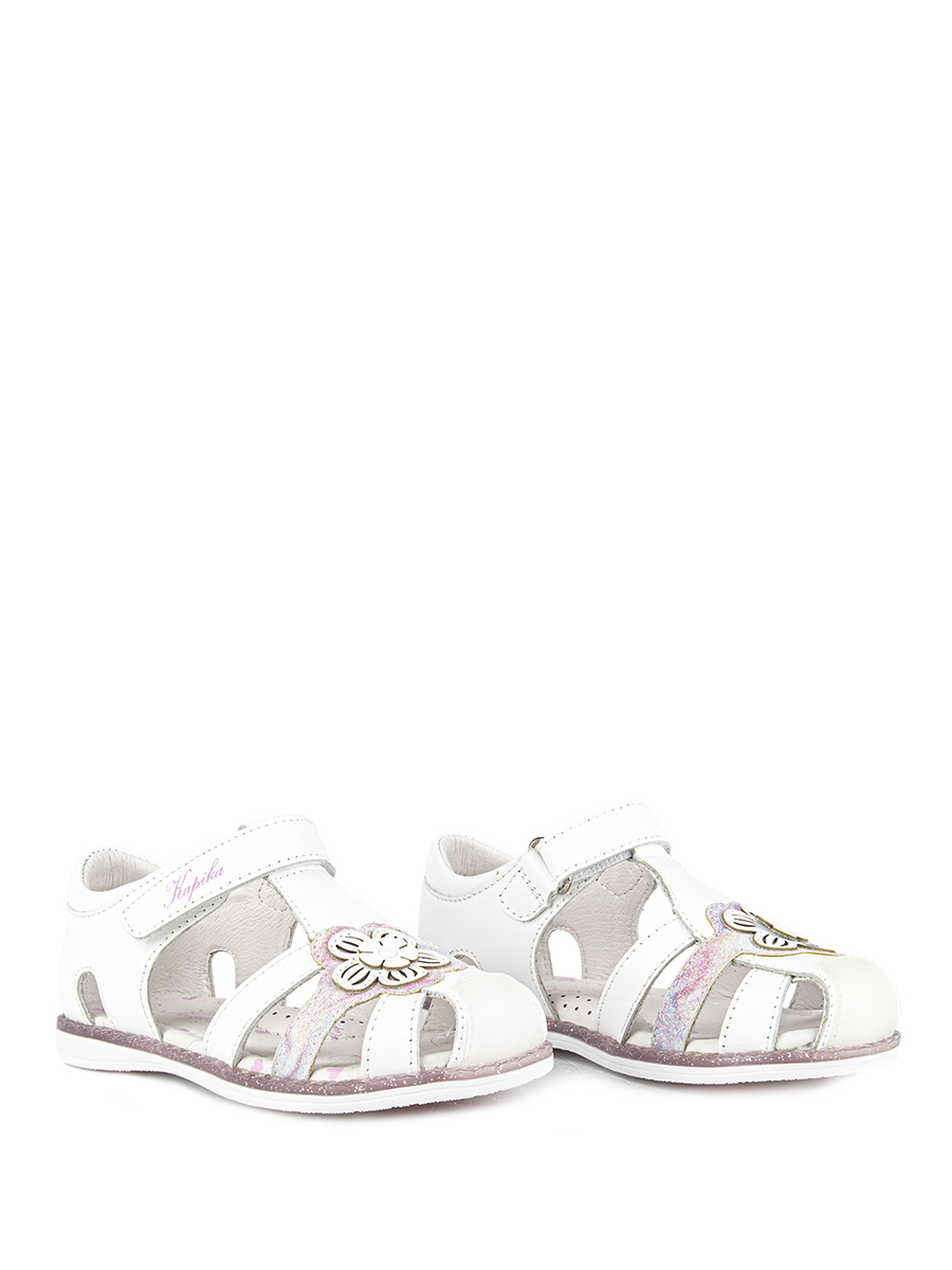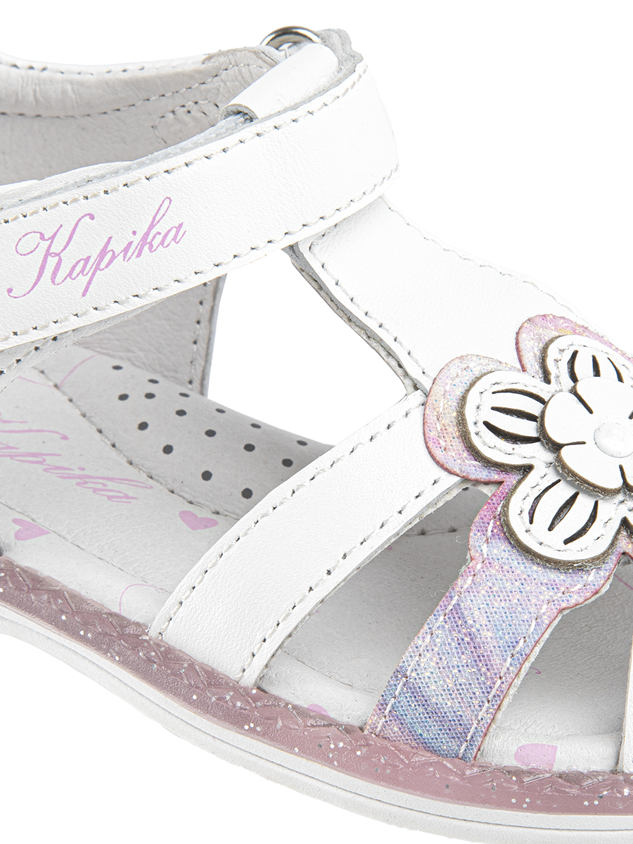 Сандалии для девочки с комбинированным материалом верха. Подкладка и стелька из натуральной кожи. Жесткий задник и подсводник обеспечивают правильную постановку стопы и комфорт. Долговечная ТЭП подошва продлевает срок службы обуви.