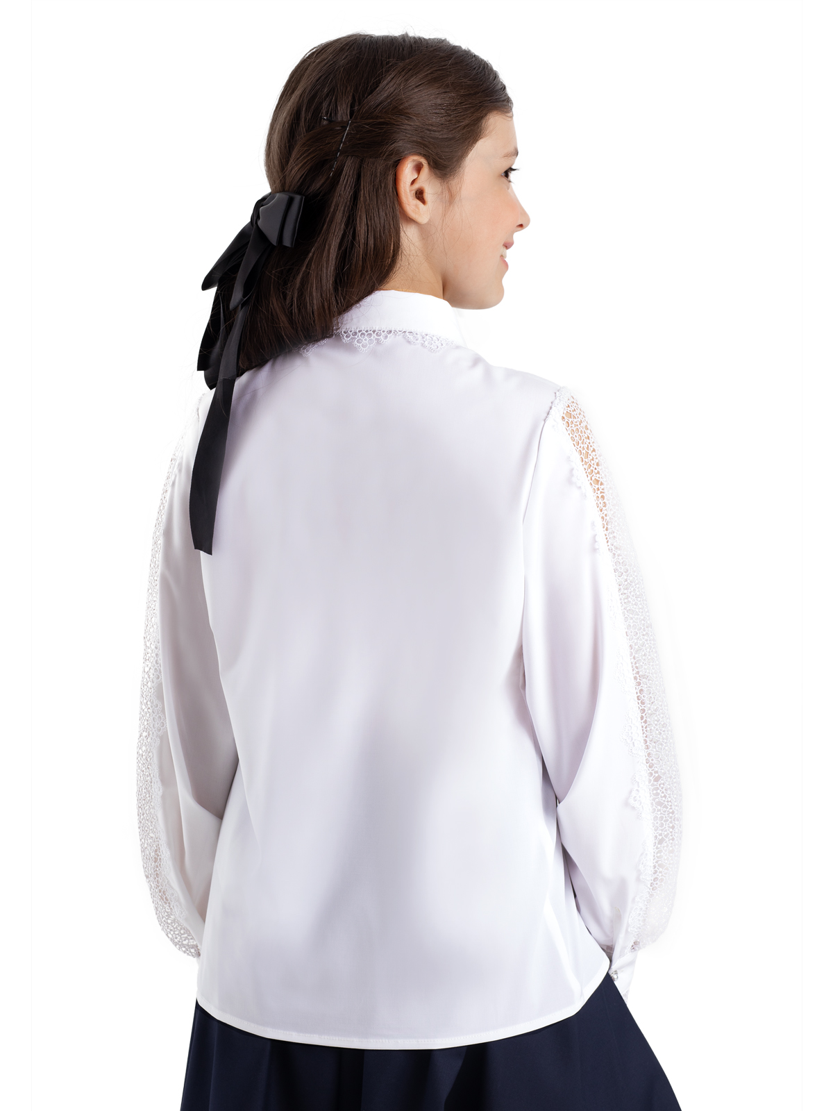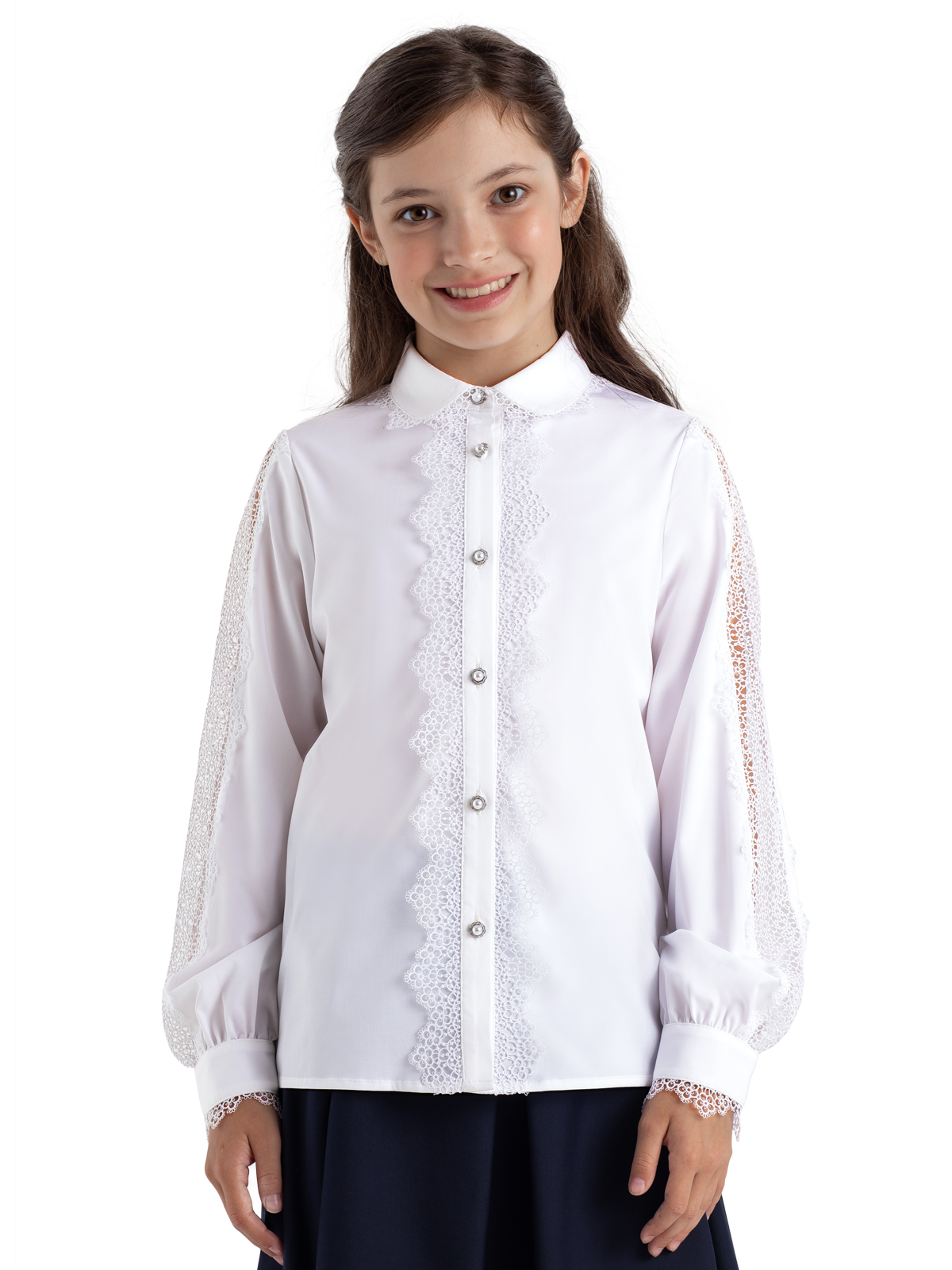 Классическая белая школьная блузка выполнена из мягкой ткани с высоким содержанием волокон бамбука. Нарядная школьная блузка свободного силуэта дополнена вставками из мягкого кружева на рукавах, воротнике, планке и манжетах, и декорированными пуговицами. Ткань мягкая и дышащая не сковывает движения, приятна к телу, мало мнется и легка в уходе.