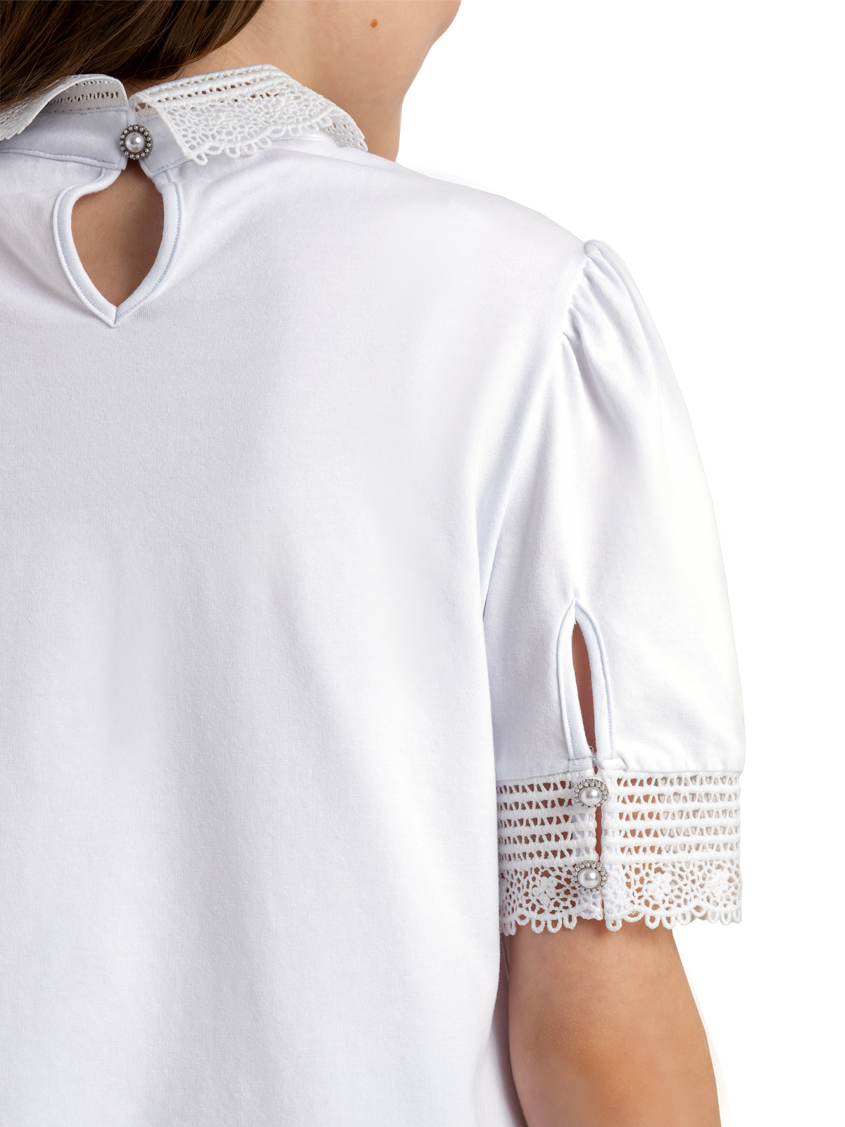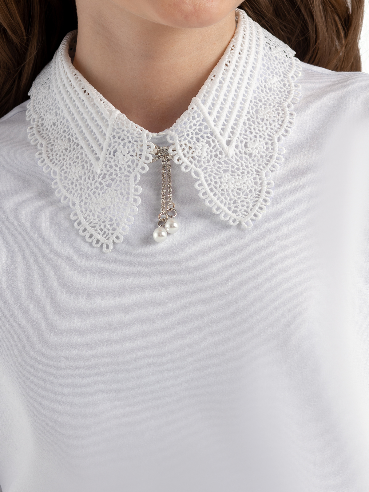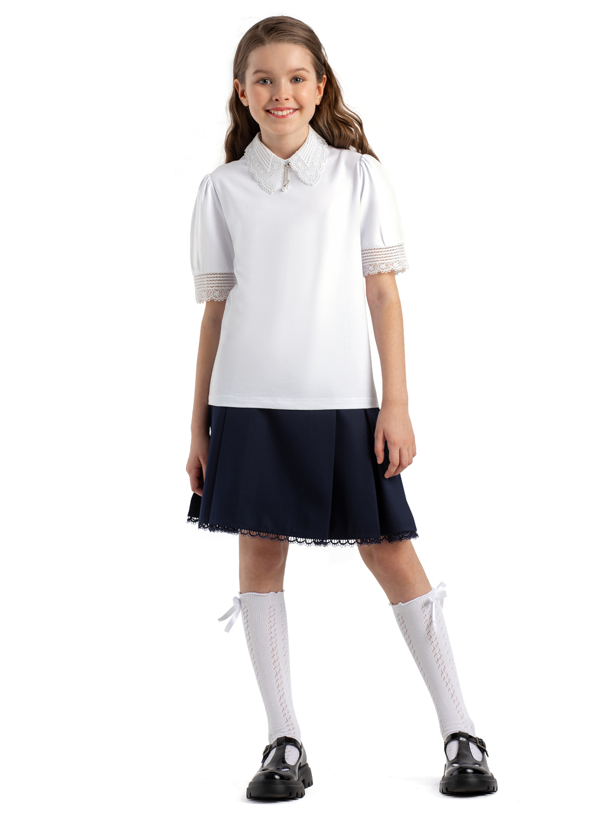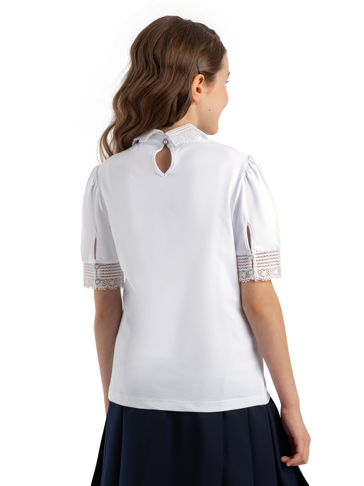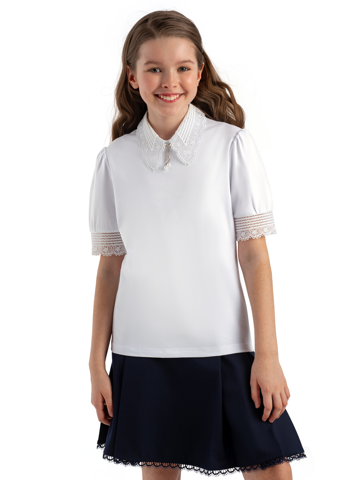 Блузка молочного цвета с коротким рукавом - стильный и функциональный элемент гардероба девочки. Ажурное кружево и съемный декор-бант создают нежный образ, а прямой силуэт, короткий рукав и застежка сзади обеспечивают комфорт в носке.Выполнена из шелковистого хлопка, блузка приятна на ощупь и проста в уходе. Маленькие жемчужные пуговицы украшают манжеты и застежку, добавляя стильный акцент. Эта универсальная блузка прекрасно сочетается с любыми низами, будь то брюки, юбки или джинсы. Девочки по достоинству оценят эту блузку, которая прекрасно подойдет как для школьных будней, так и для нарядных и даже повседневных образов.