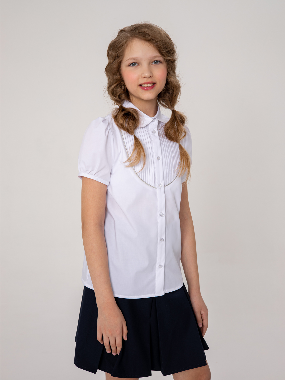Классическая белая школьная блузка с коротким рукавом выполнена из мягкой ткани с высоким содержанием волокон бамбука. Добавление эластана создает комфорт и удобство. Ткань мягкая и дышащая не сковывает движения, приятна к телу, мало мнется и легка в уходе. Вставка на груди из плиссированного текстиля дополнена кантом с люрексом.