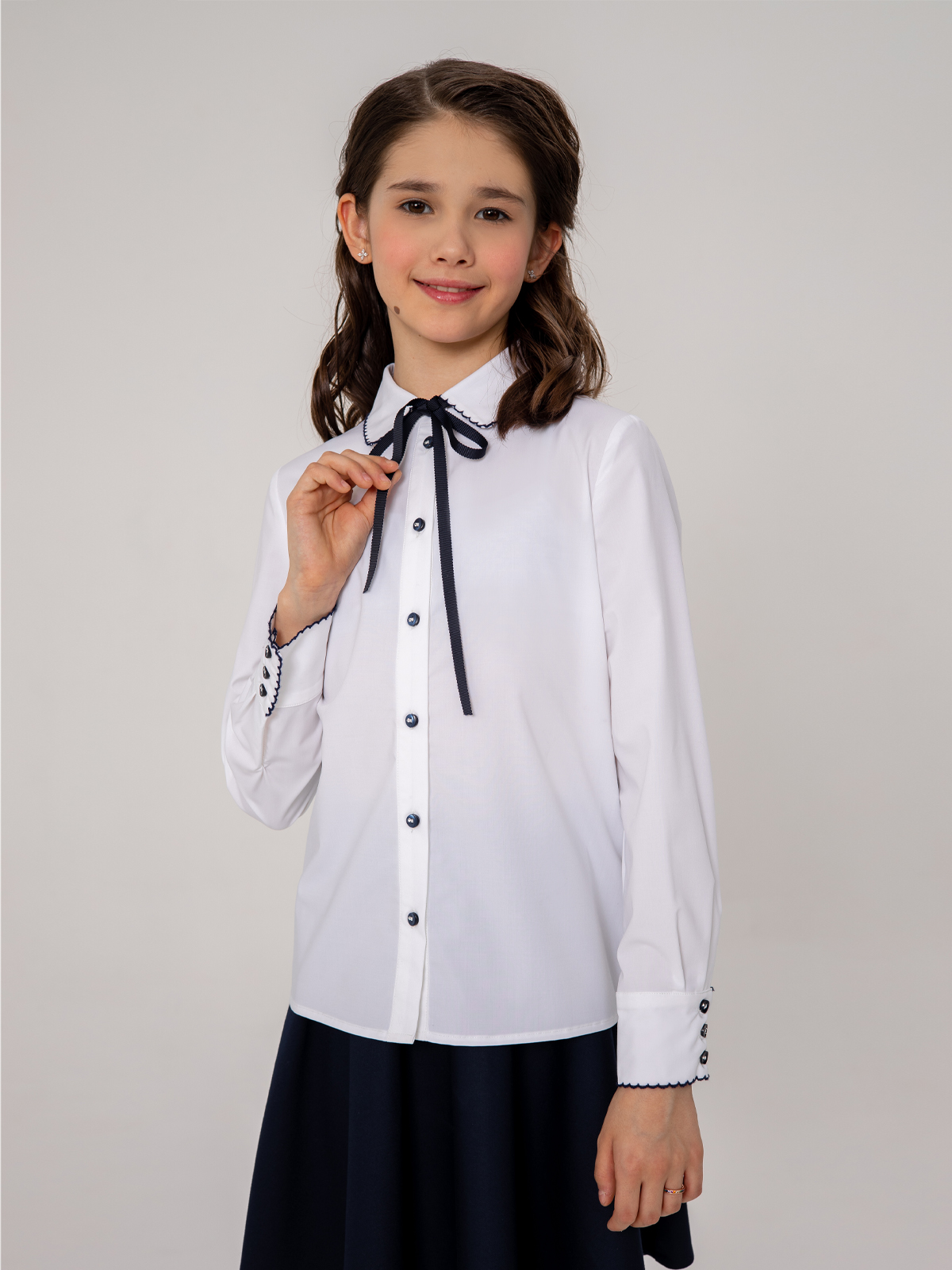 Классическая белая школьная блузка выполнена из мягкой ткани с высоким содержанием волокон бамбука. Ткань мягкая и дышащая не сковывает движения, приятна к телу, мало мнется и легка в уходе. Добавление эластана создает комфорт и удобство. Нарядная школьная блузка свободного силуэта декорирована небольшим синим бантиком, пуговицами со стразинкой и широкими манжетами.