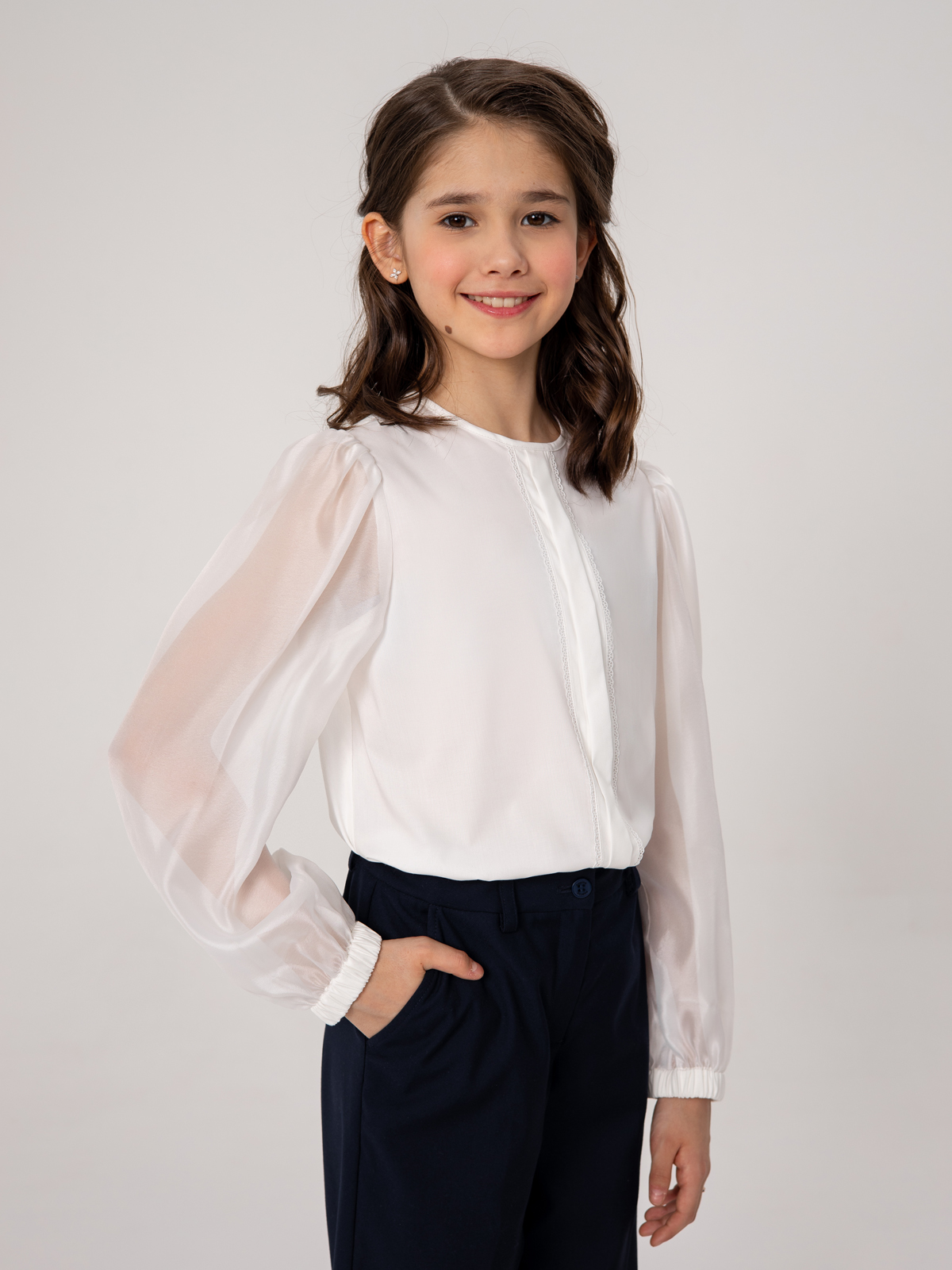 Белая блузка свободного кроя из мягкой ткани с высоким содержанием волокон бамбука. Ткань мягкая и дышащая не сковывает движения, приятна к телу, мало мнется и легка в уходе. Добавление эластана создает комфорт и удобство. Объёмные рукава выполнены из лёгкой прозрачной органзы.