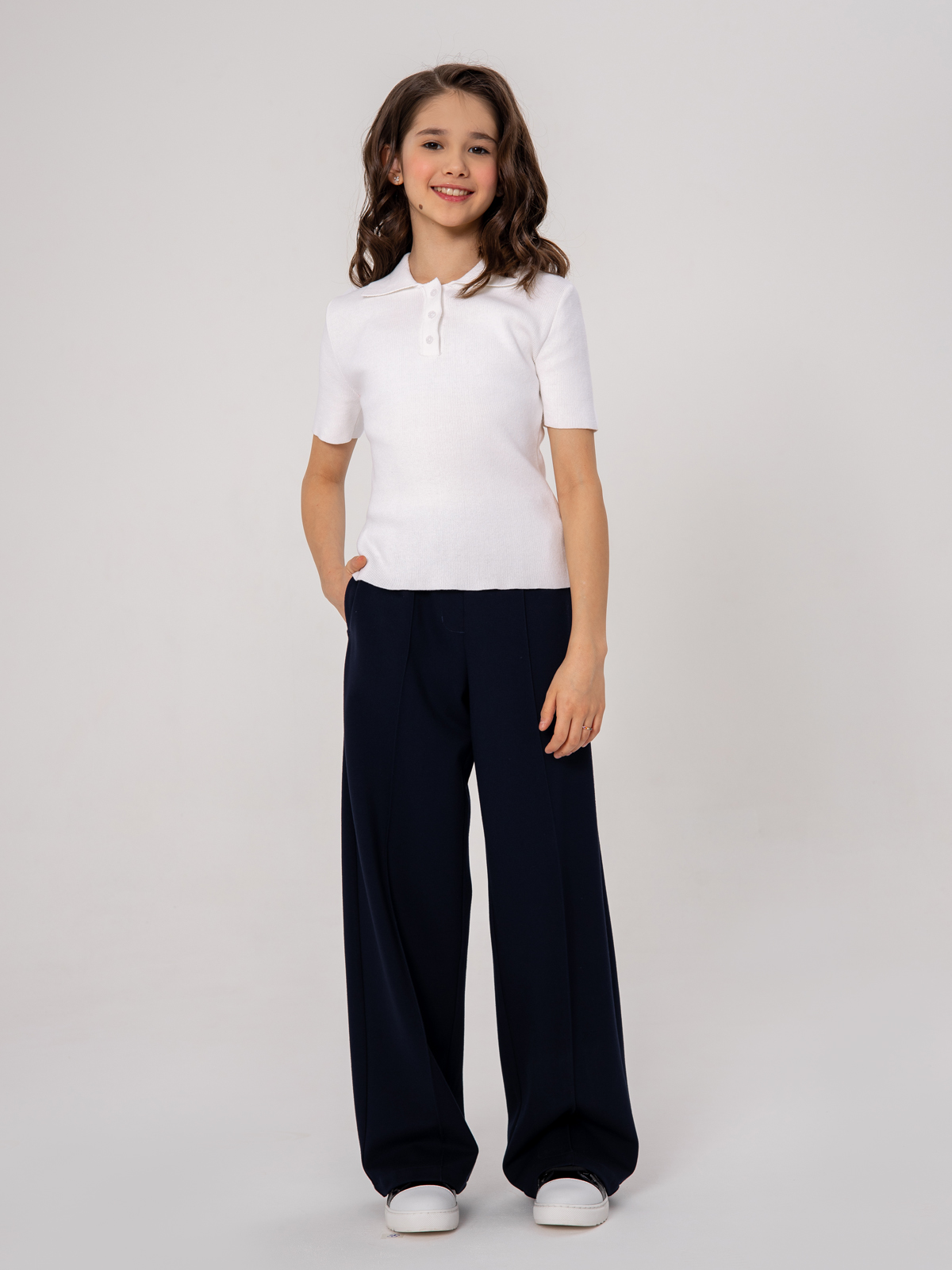 Широкие темно-синие школьные брюки выполнены из высококачественной поливискозы c небольшим добавлением эластана. Трикотажная ткань приятна на ощупь, не скатывается, сильно не мнется, износостойкая, не теряет форму и цвет после стирки. Модель брюк для школы легко надевается за счет резинки на поясе, имеет функциональные карманы.