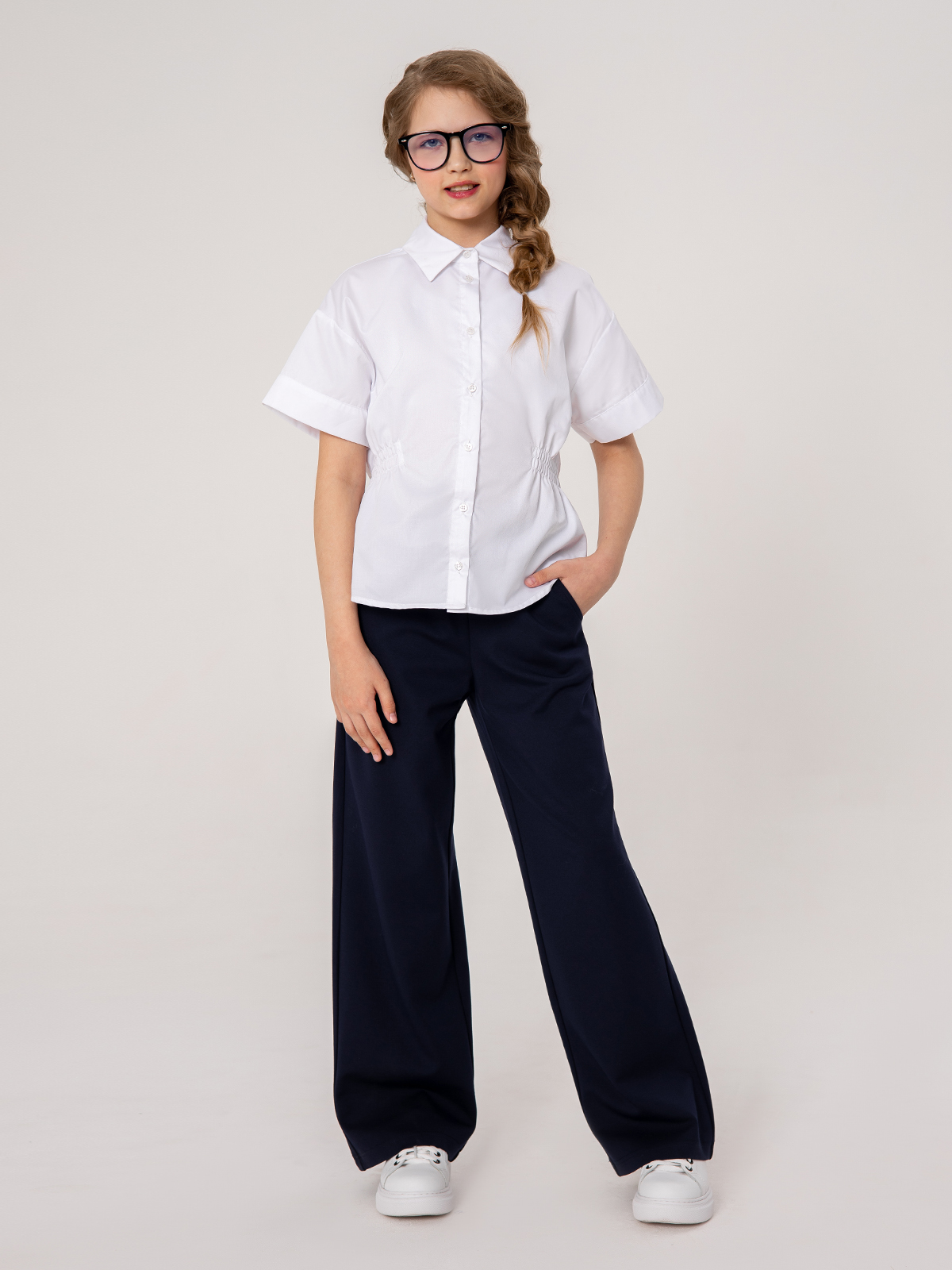 Широкие темно-синие школьные брюки выполнены из высококачественной костюмной поливискозы с высокой воздухопроницаемостью. Ткань плотная, приятная на ощупь, не скатывается, сильно не мнется, износостойкая, не теряет форму и цвет после стирки. Модель брюк для школы легко надевается за счет эластичной резинки на поясе, имеет функциональные боковые карманы.