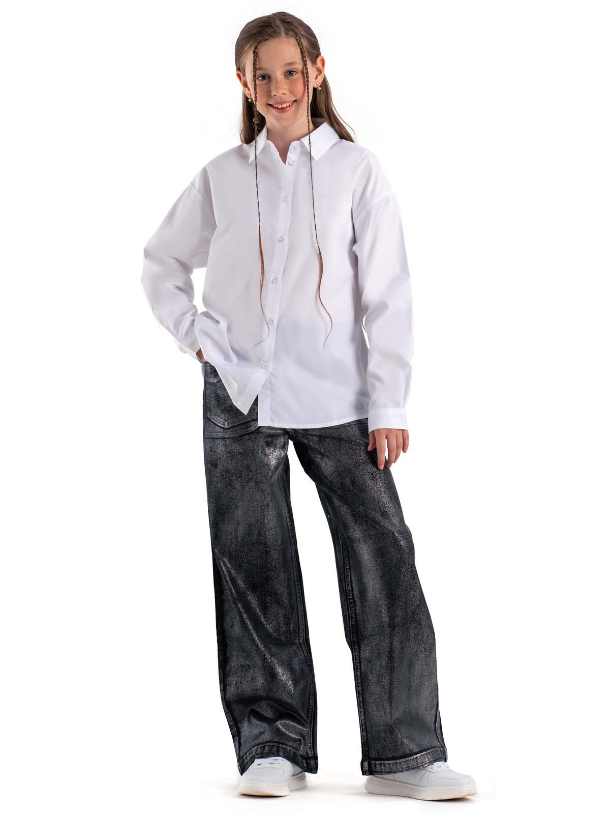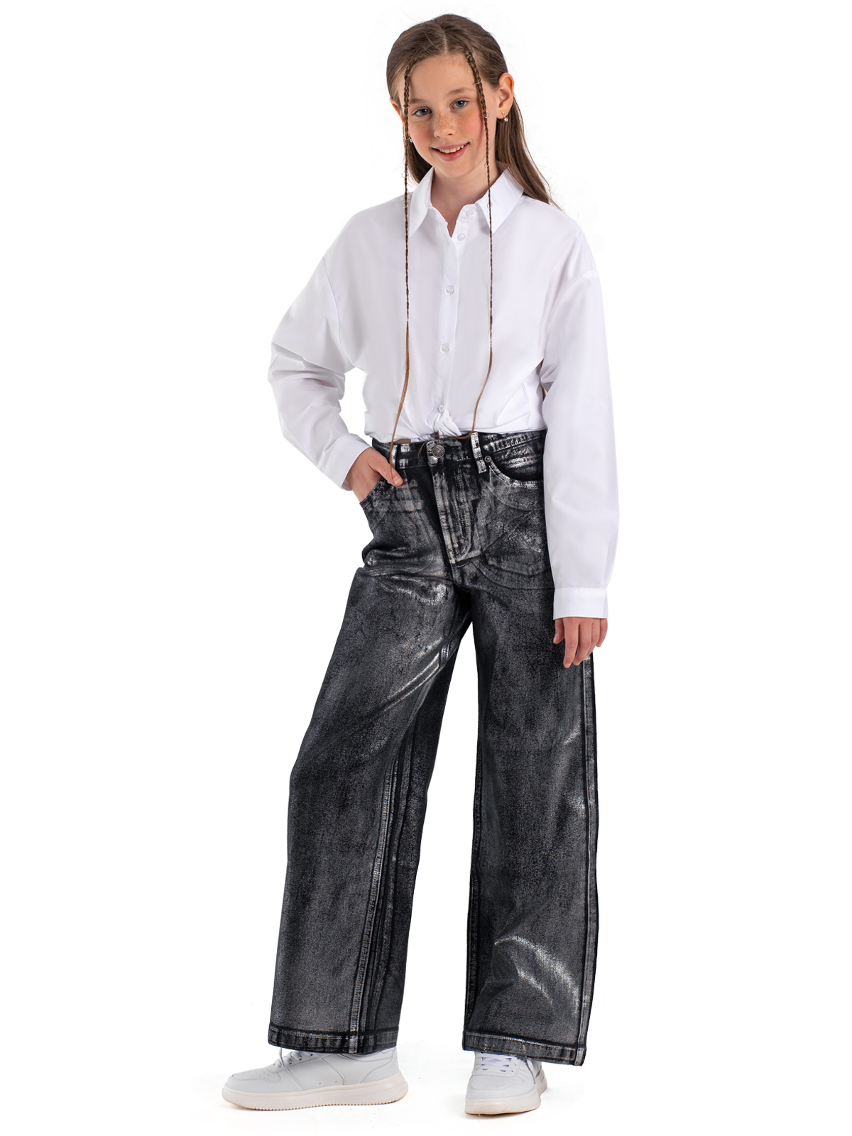 Нарядные джинсы для девочки-подростка в чёрном цвете с эффектным серебристым блеском станут настоящим украшением гардероба. Модель отличается широкими брючинами и оригинальным декоративным исполнением. Материал сочетает в себе хлопок, полиэстер и вискозу, что обеспечивает комфорт при носке и долговечность изделия. Практичная конструкция включает два удобных кармана спереди и два накладных кармана сзади. Особую элегантность модели придает изысканный серебристый эффект. Продуманный дизайн делает эти джинсы идеальным выбором для праздничных мероприятий и особых случаев. Благодаря качественным материалам изделие сохраняет форму и блеск даже после множества стирок.