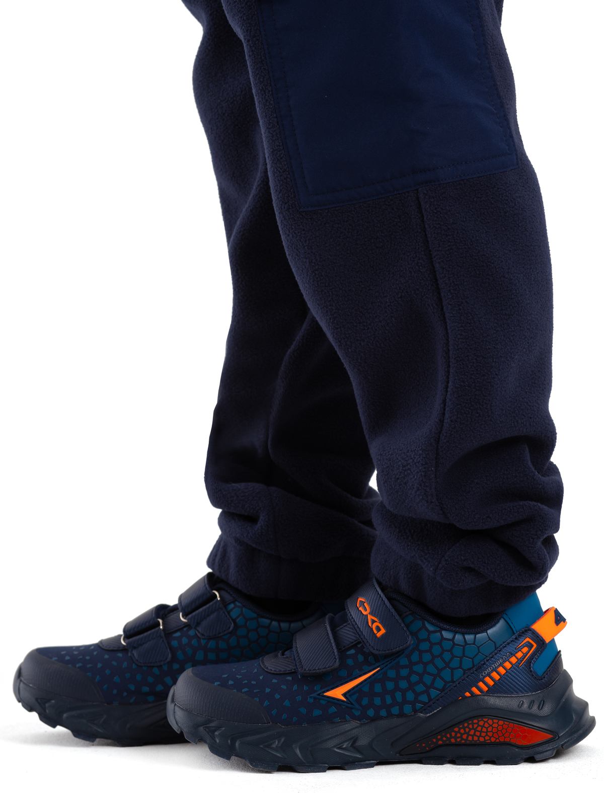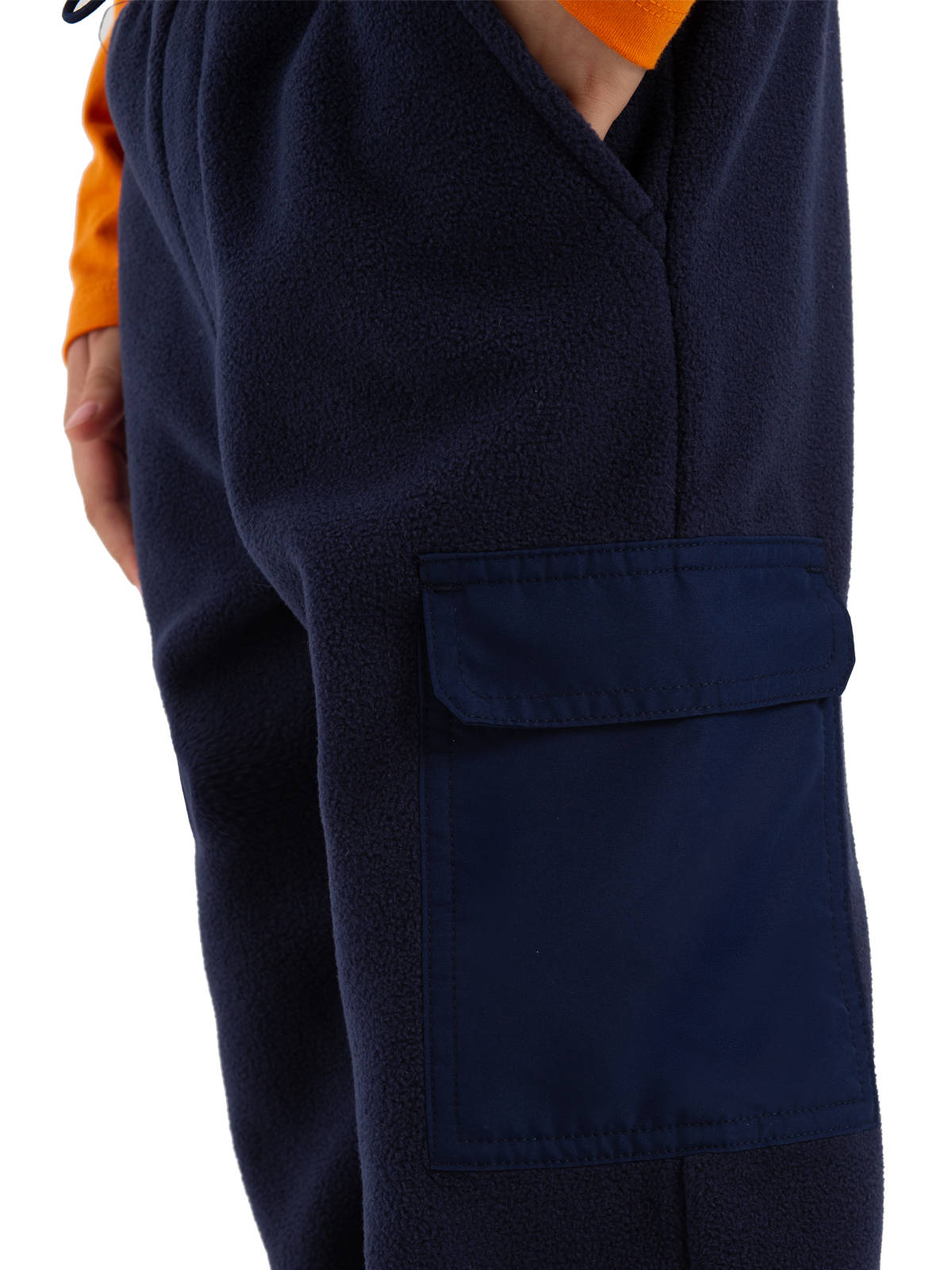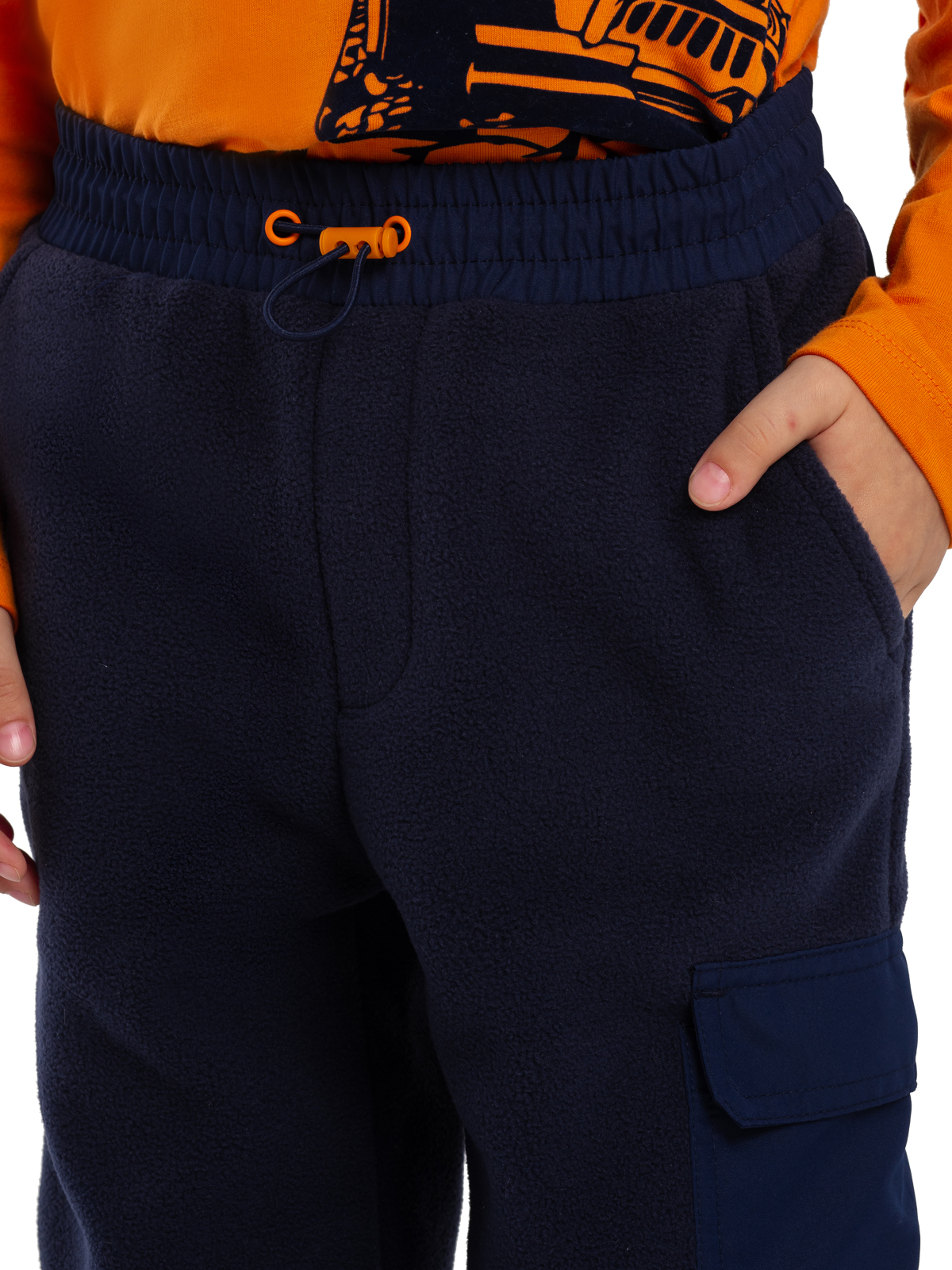 Тёплые флисовые брюки тёмно-синего цвета станут незаменимой вещью в гардеробе мальчика. Модель выполнена из качественного 100% полиэстера, который отлично сохраняет тепло и обеспечивает комфорт при носке. Практичная конструкция включает пояс на широкой резинке с кулиской для идеальной посадки, а эластичные манжеты по низу брючин надёжно защищают от попадания холодного воздуха. Контрастная фурнитура добавляет стильный акцент и делает модель более выразительной. Функциональность модели подчёркивают два удобных боковых кармана, один накладной карман сзади и дополнительный боковой карман на брючине с клапаном, где можно хранить необходимые мелочи. Брюки подходят как для повседневной носки, так и для активного отдыха.