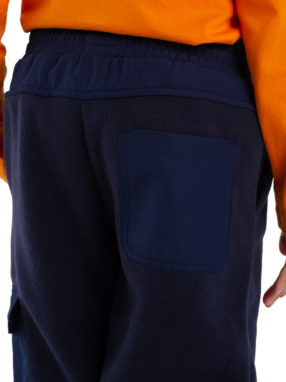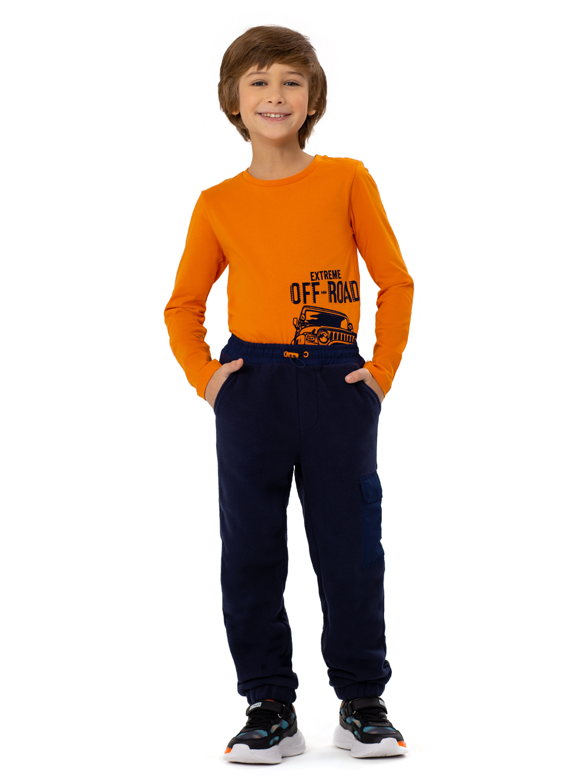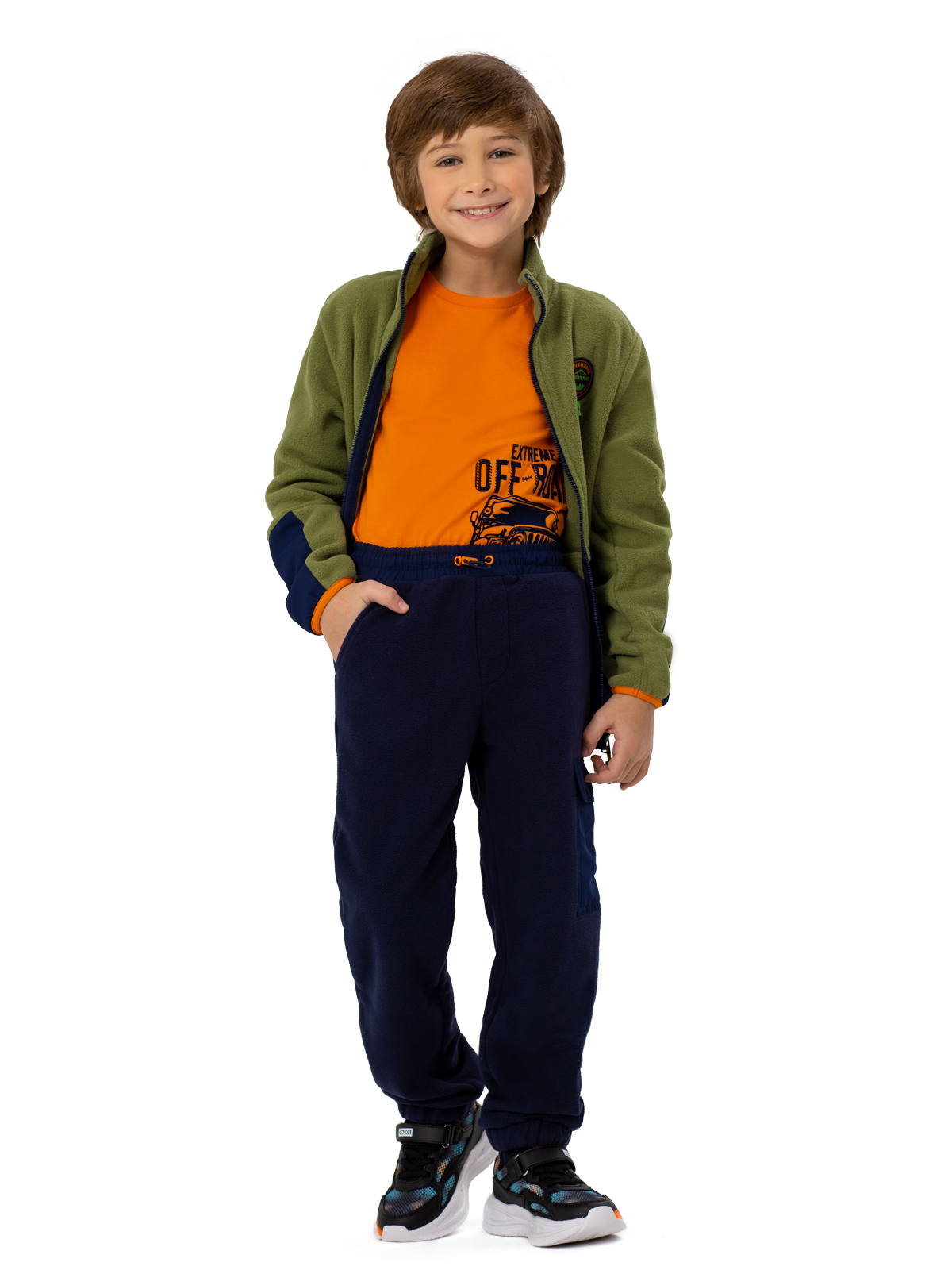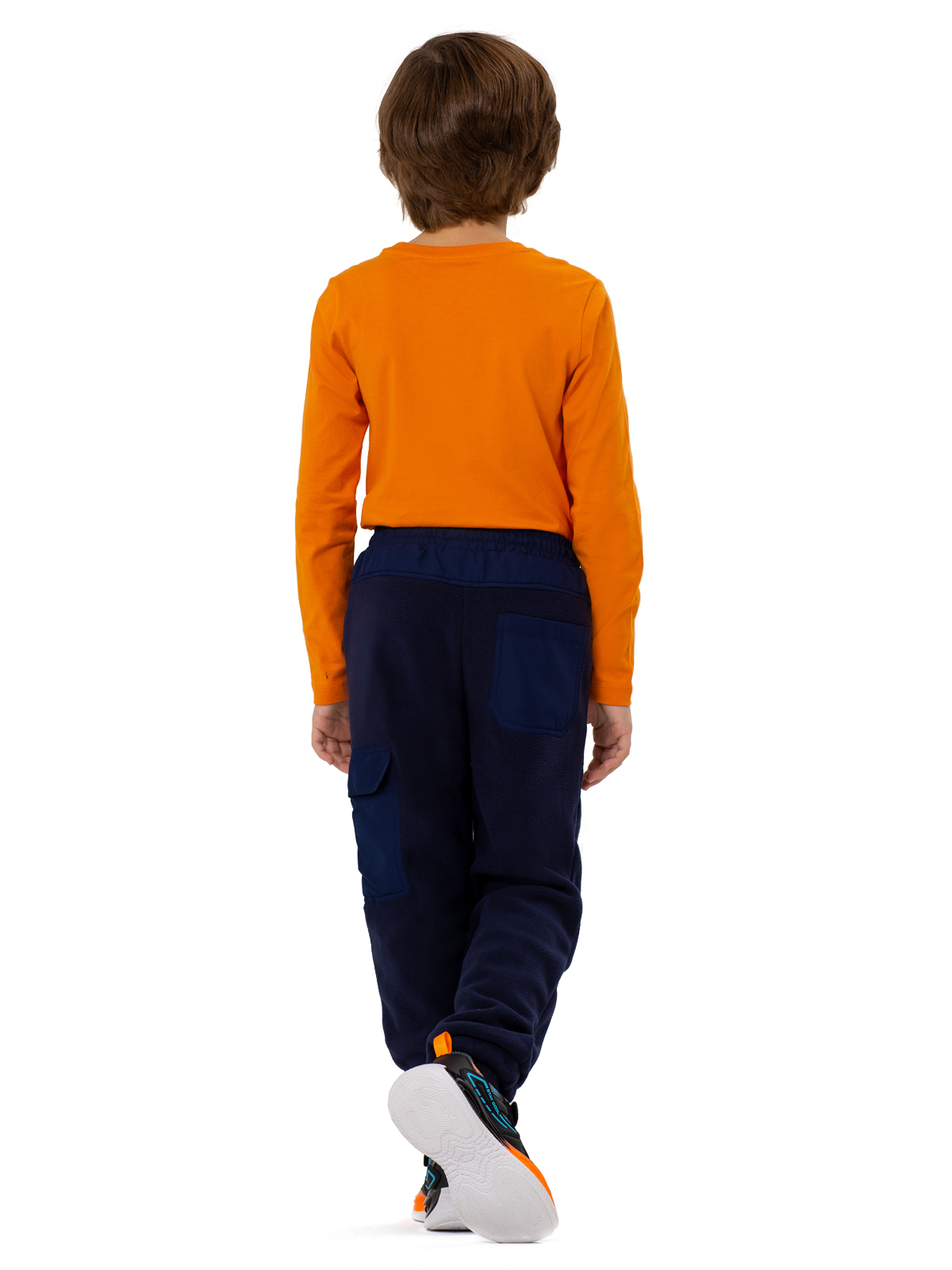 Тёплые флисовые брюки тёмно-синего цвета станут незаменимой вещью в гардеробе мальчика. Модель выполнена из качественного 100% полиэстера, который отлично сохраняет тепло и обеспечивает комфорт при носке. Практичная конструкция включает пояс на широкой резинке с кулиской для идеальной посадки, а эластичные манжеты по низу брючин надёжно защищают от попадания холодного воздуха. Контрастная фурнитура добавляет стильный акцент и делает модель более выразительной. Функциональность модели подчёркивают два удобных боковых кармана, один накладной карман сзади и дополнительный боковой карман на брючине с клапаном, где можно хранить необходимые мелочи. Брюки подходят как для повседневной носки, так и для активного отдыха.