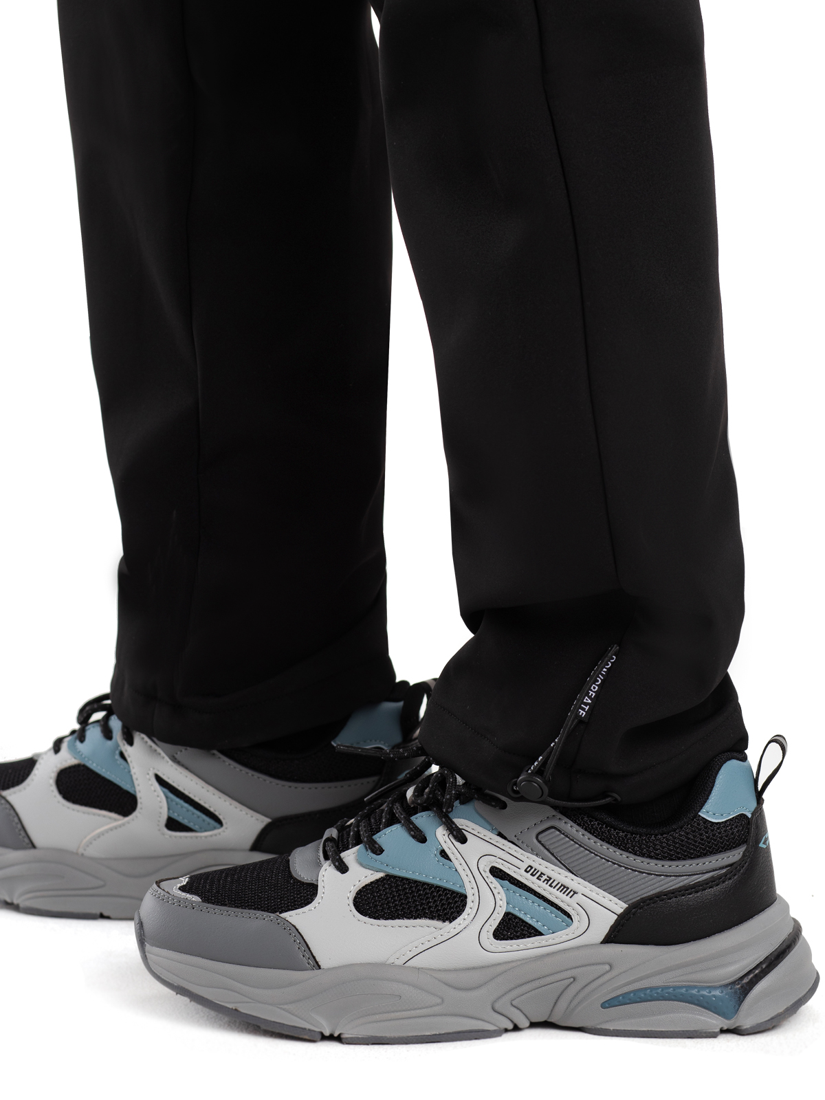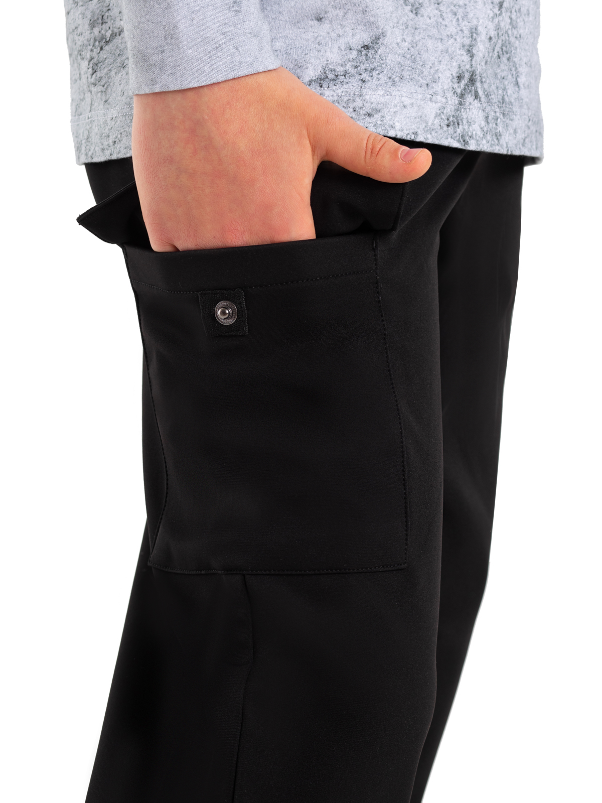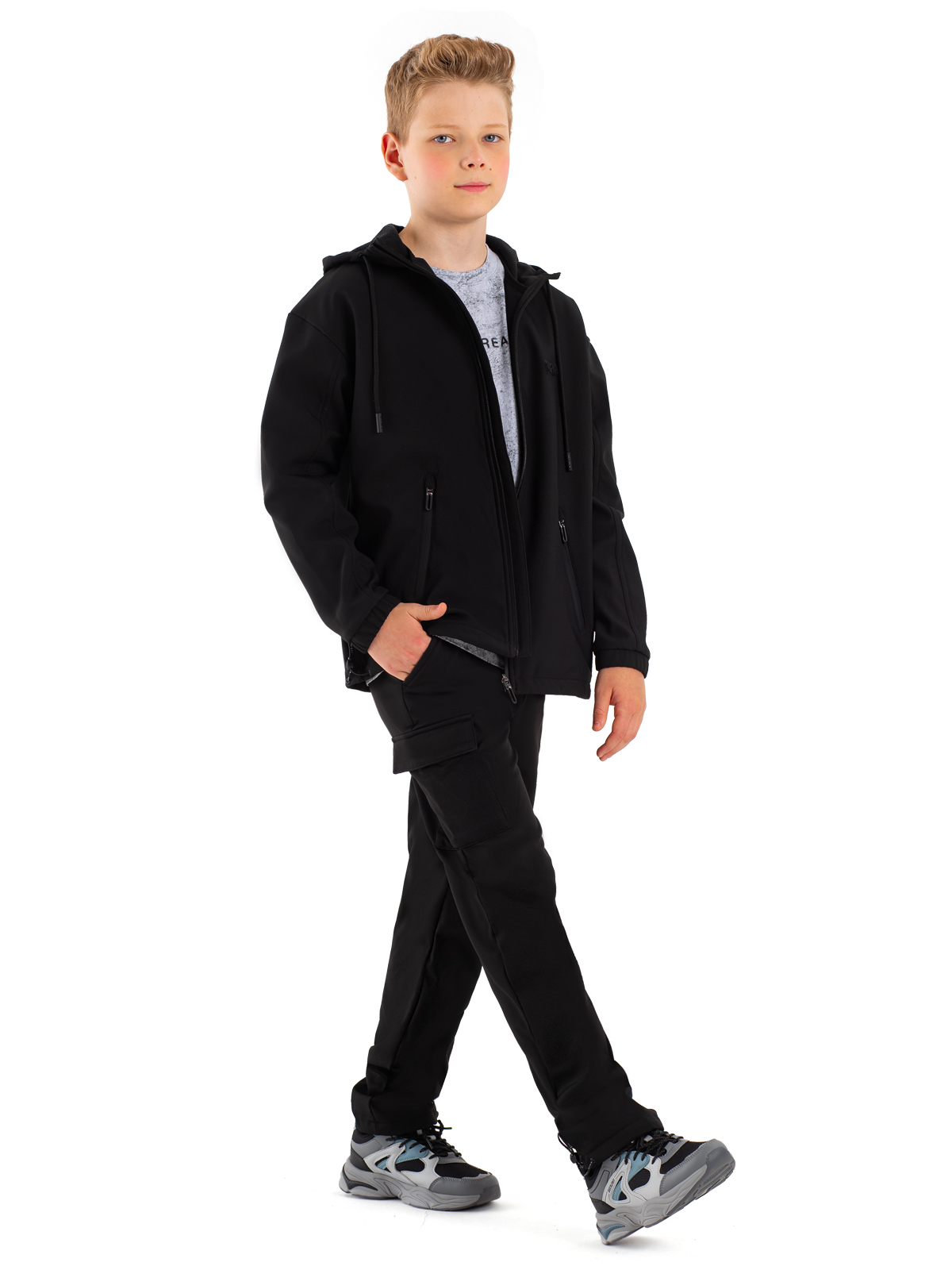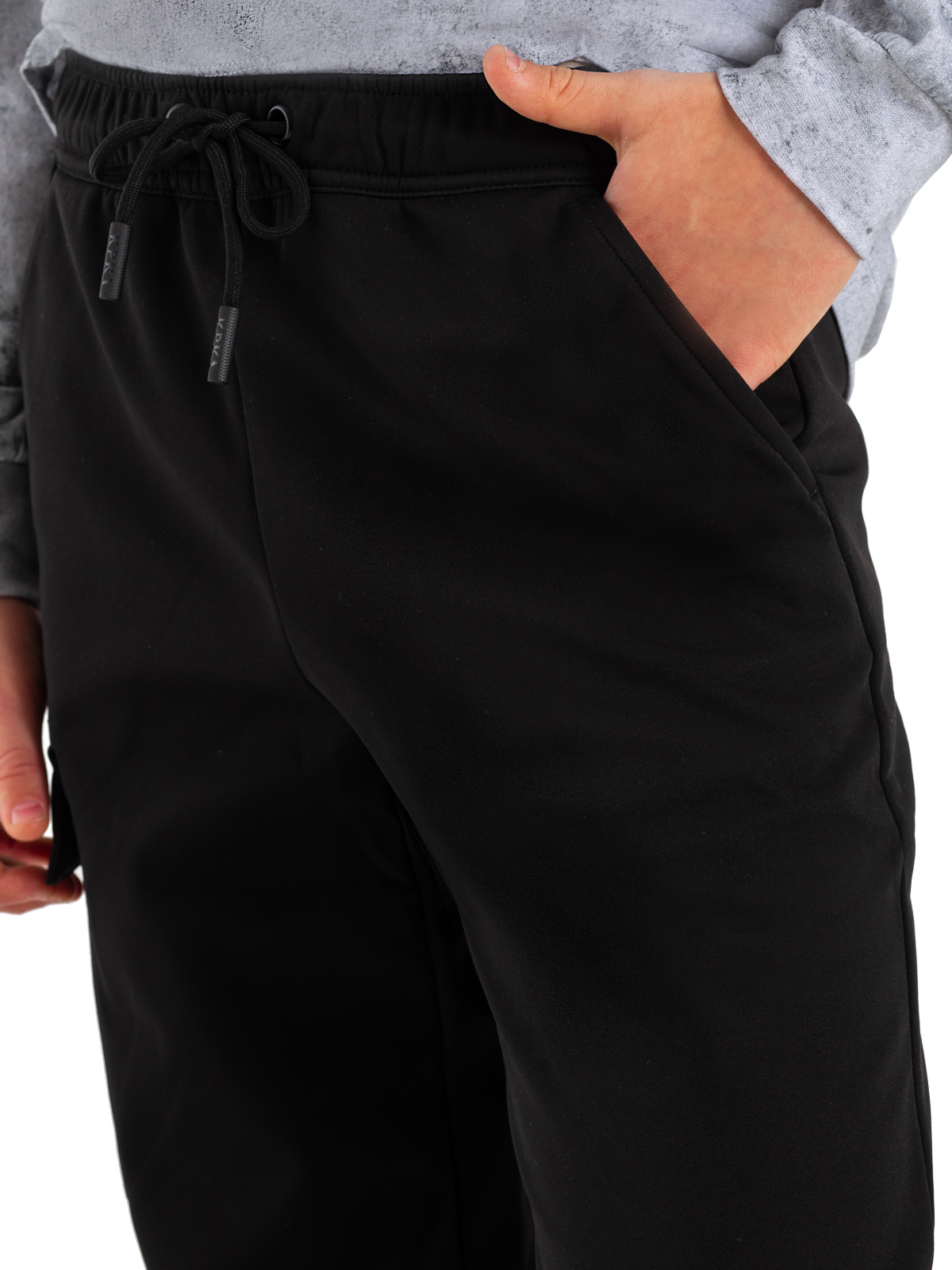 Брюки в спортивном стиле чёрного цвета из 100% полиэстера — практичный выбор для активного подростка. Модель оснащена двумя боковыми карманами и накладным карманом с клапаном на брючине для удобного хранения мелочей. Пояс на эластичной резинке со шнурком обеспечивает комфортную посадку, а кулиски по низу брючин позволяют регулировать ширину. Прочный материал обеспечивает свободу движений и отличную износостойкость.