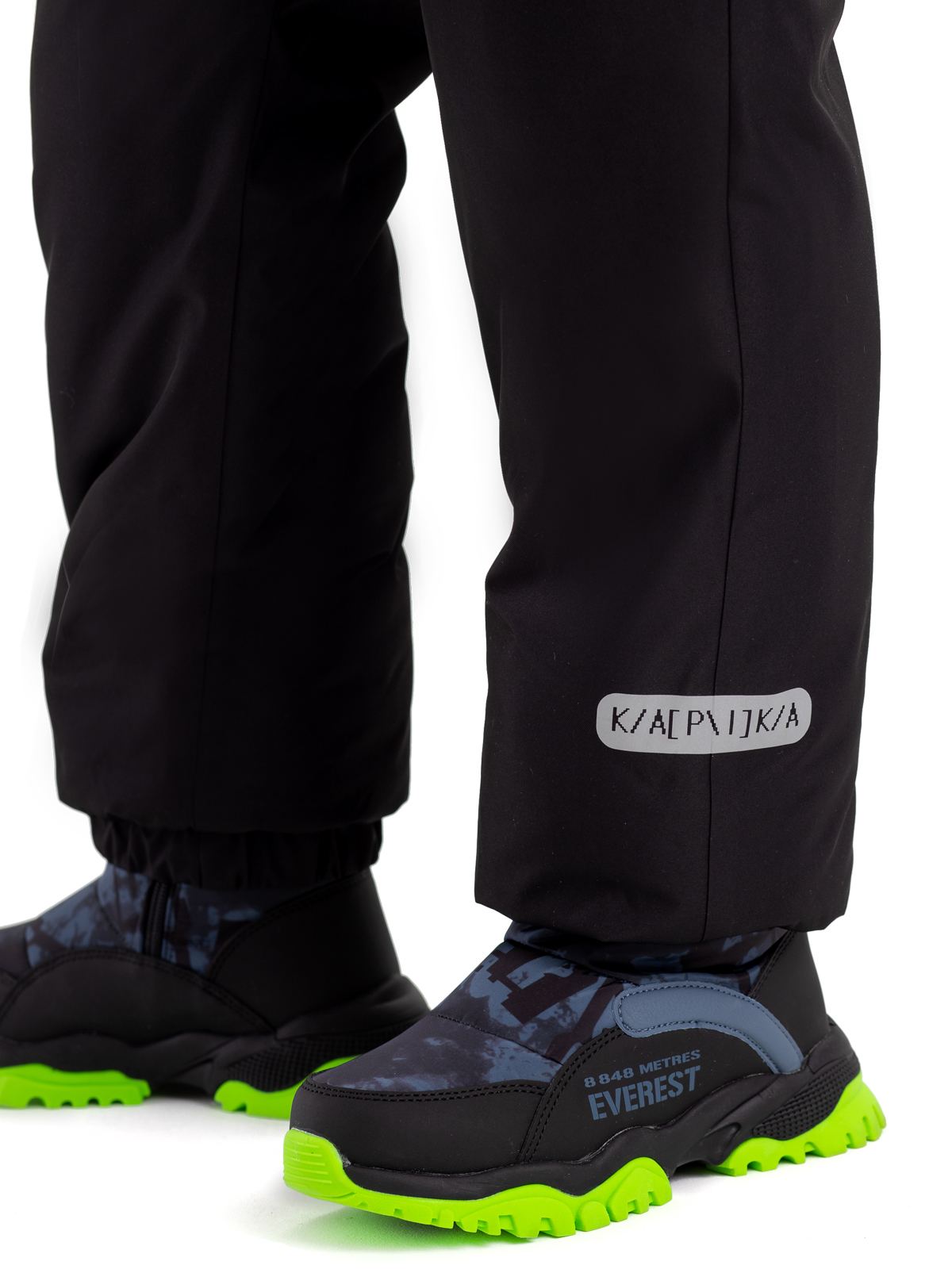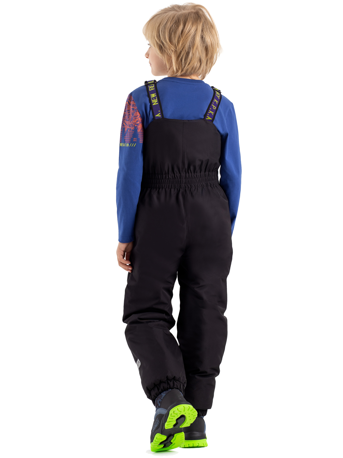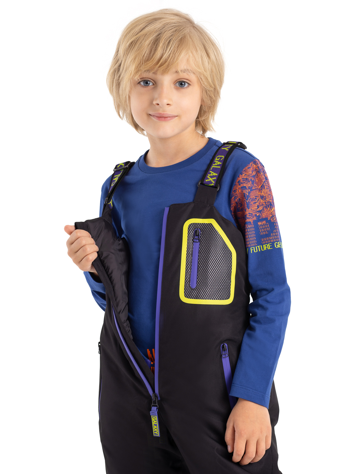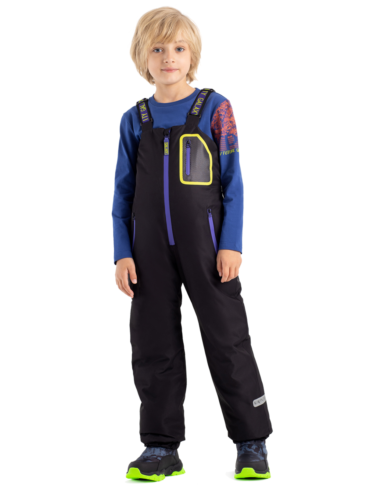 Полукомбинезон прямого силуэта с синтепоном 200 г/м2. Мембранная ткань 8000мм/5000г/м2/24ч не дает ребенку промокнуть. Модель с регулируемыми яркими бретелями из эластичной жаккардовой тесьмы. Верхняя часть полукомбинезона застегивается на водозащитную молнию с нижней ветрозащитной планкой. Функциональный карман на груди, глубокие карманы в боку также защищены водонепроницаемыми молниями. Кулиса на талии - с резинкой для удобства прилегания. Верхняя внутренняя часть полукомбинезона на флисе, нижняя часть на подкладке. По низу полукомбинезона резинка для удержания тепла внутри. Светоотражающий декоративный принт по низу изделия обеспечивает защиту ребенка в темное время суток.