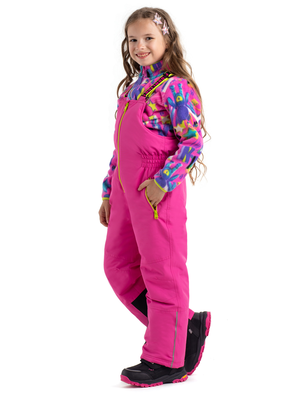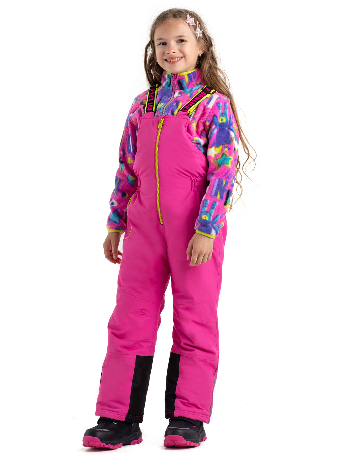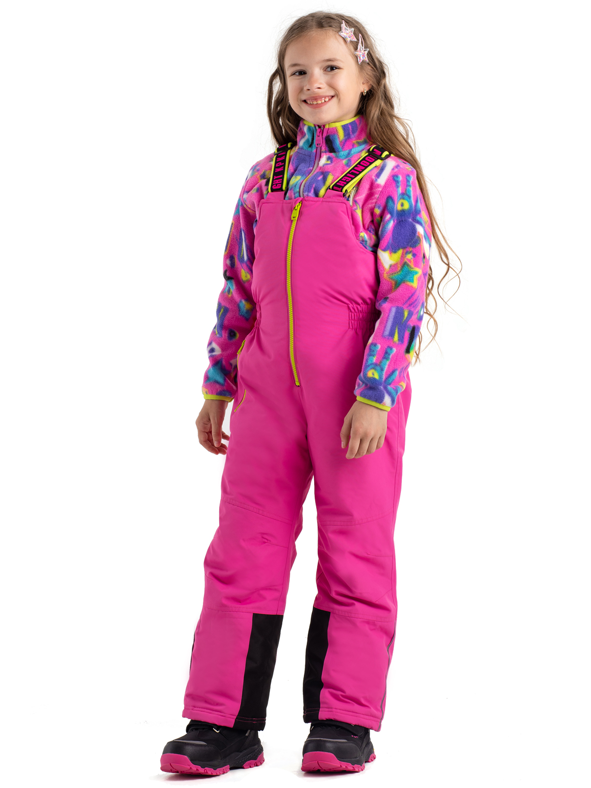Яркий полукомбинезон прямого силуэта с синтепоном 200 г/м2. Мембранная ткань 8000мм/5000г/м2/24ч не дает ребенку промокнуть. Модель с регулируемыми яркими бретелями из эластичной жаккардовой тесьмы. Верхняя часть полукомбинезона утеплена флисом. Кулиса на талии - с резинкой для удобства прилегания. Контрастные вставки из прочной ткани «Оксфорд» по низу брючин, глубокие карманы по бокам защищены «молниями». Штаны оснащены специальной подкладкой и ветрозащитной манжетой на резинке с латексом. защищающей кожу от низких температур, ветра и попадания снега. Нашивные светоотражающие элементы по низу изделия обеспечивают защиту ребенка в темное время суток.