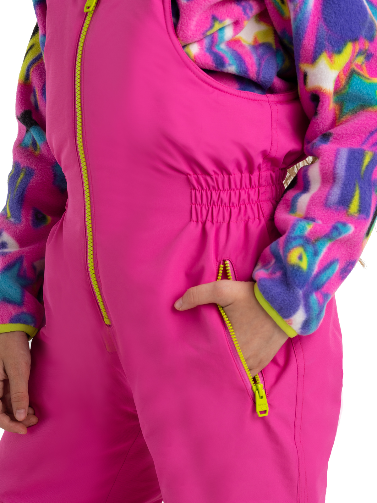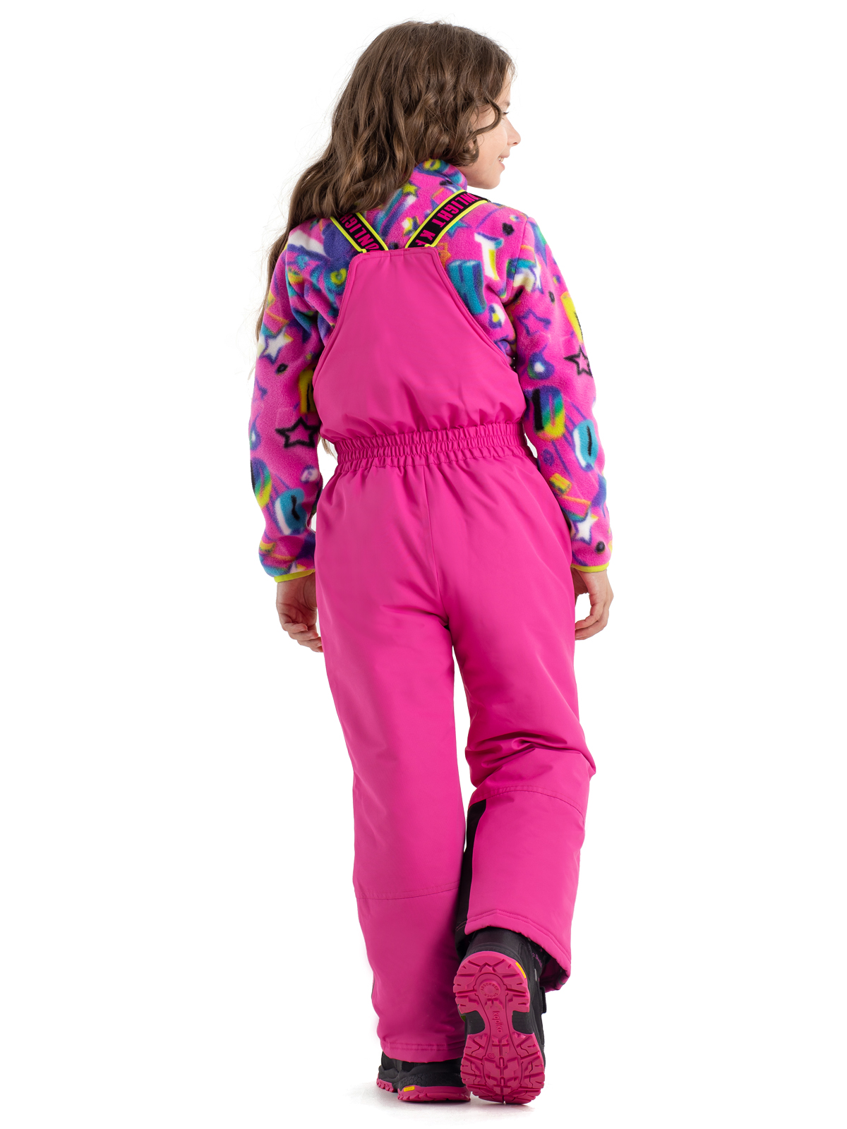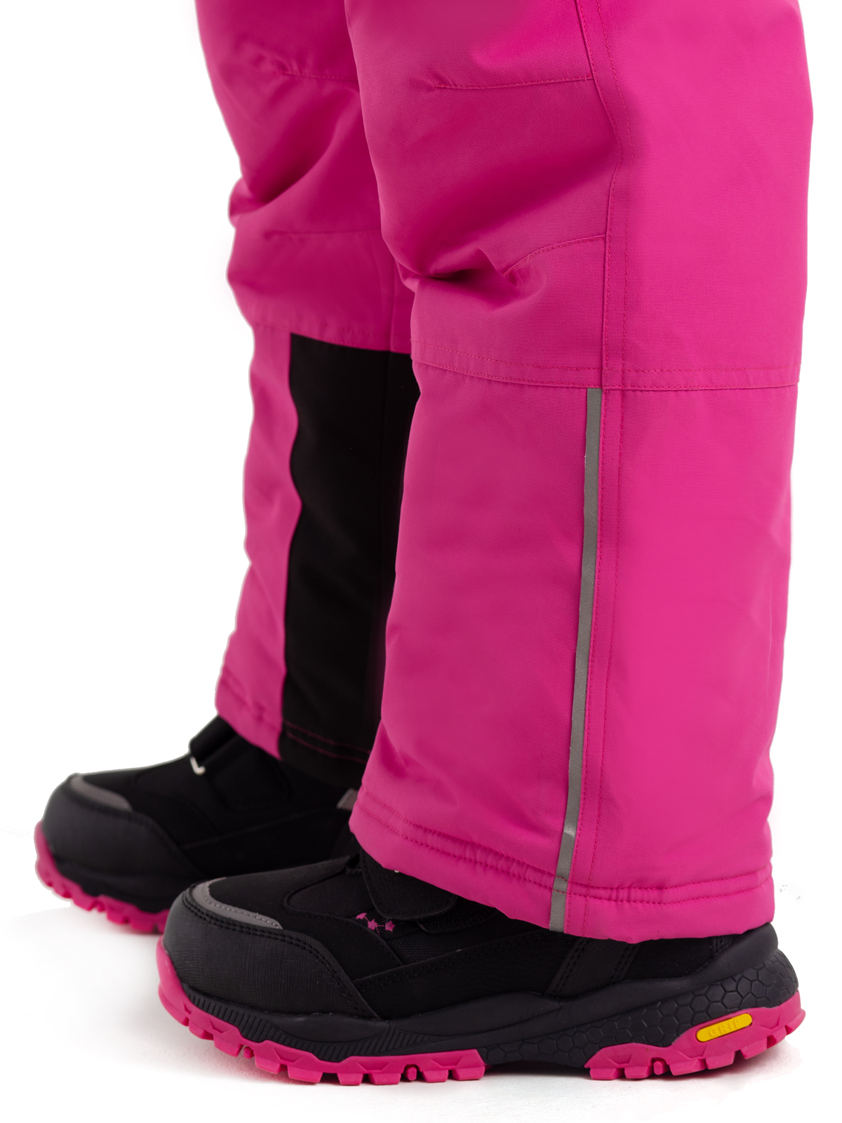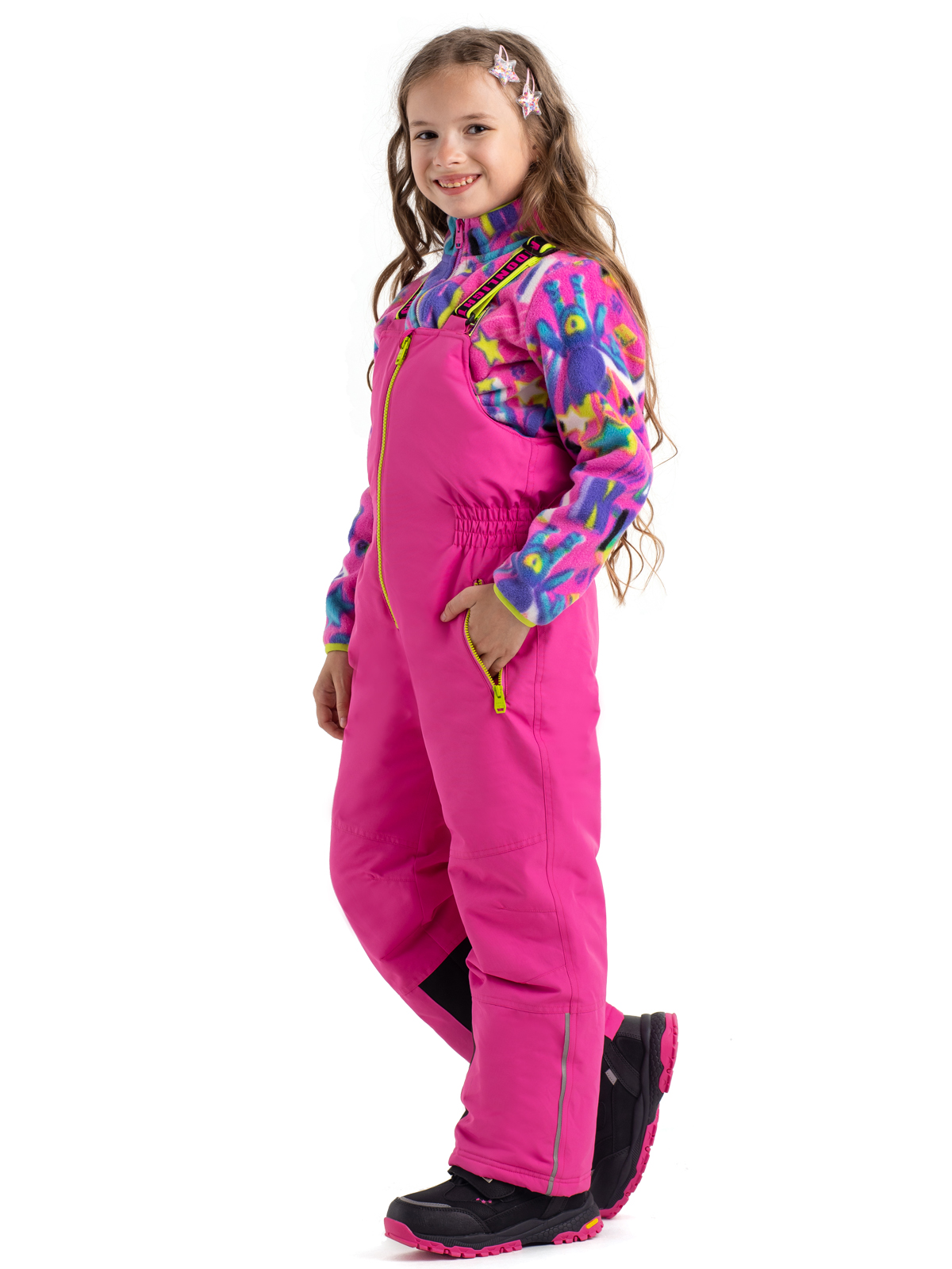 Яркий полукомбинезон прямого силуэта с синтепоном 200 г/м2. Мембранная ткань 8000мм/5000г/м2/24ч не дает ребенку промокнуть. Модель с регулируемыми яркими бретелями из эластичной жаккардовой тесьмы. Верхняя часть полукомбинезона утеплена флисом. Кулиса на талии - с резинкой для удобства прилегания. Контрастные вставки из прочной ткани «Оксфорд» по низу брючин, глубокие карманы по бокам защищены «молниями». Штаны оснащены специальной подкладкой и ветрозащитной манжетой на резинке с латексом. защищающей кожу от низких температур, ветра и попадания снега. Нашивные светоотражающие элементы по низу изделия обеспечивают защиту ребенка в темное время суток.
