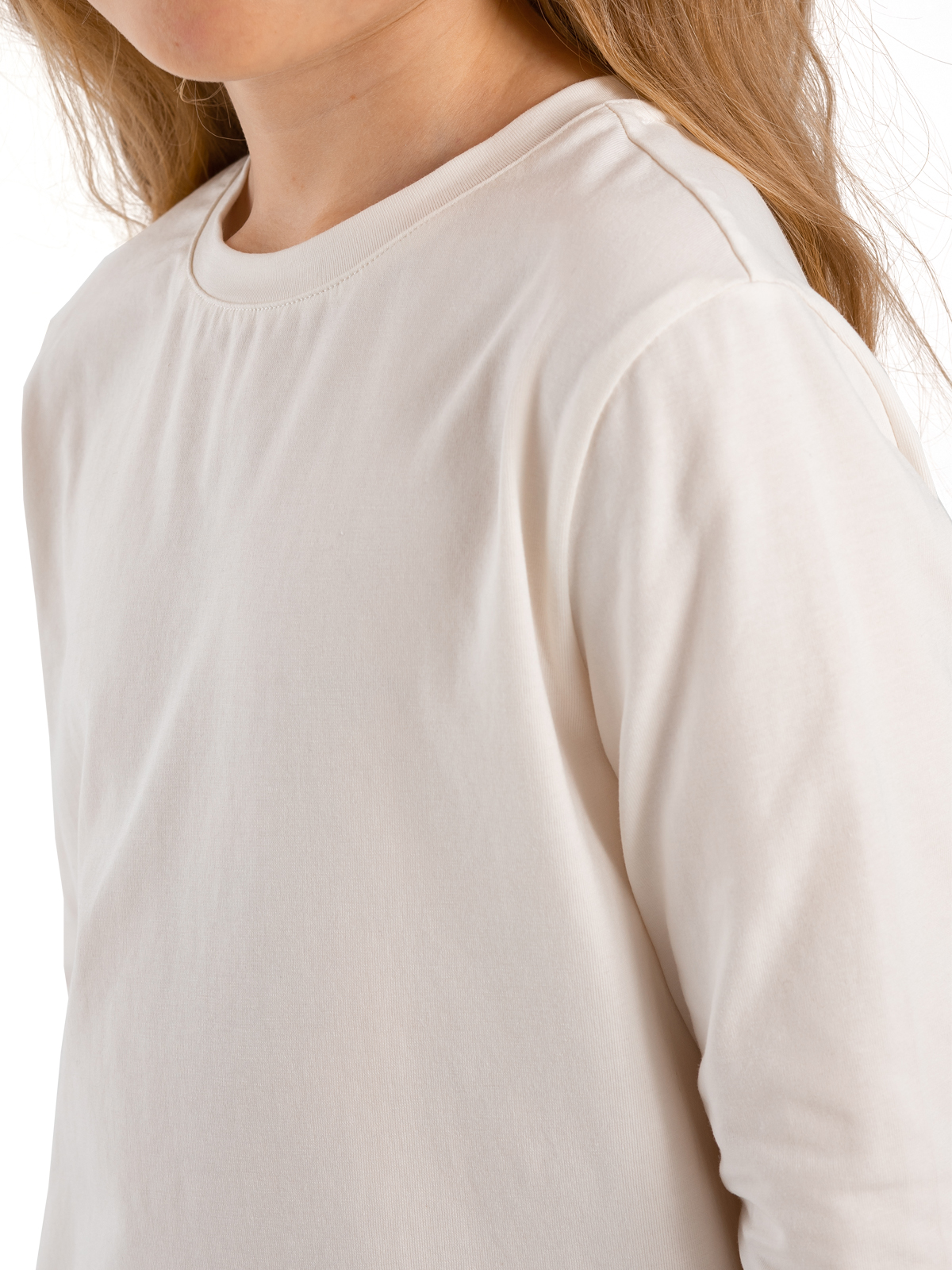 Стильный лонгслив молочного цвета для девочки выполнен из мягкого хлопка с добавлением эластана. Модель отличается элегантной широкой оборкой по нижнему краю из основной ткани. Комфортный материал обеспечивает свободу движений и приятные тактильные ощущения. Универсальный дизайн позволяет создавать как повседневные, так и нарядные образы — лонгслив гармонично сочетается с юбками, брюками и другой одеждой.