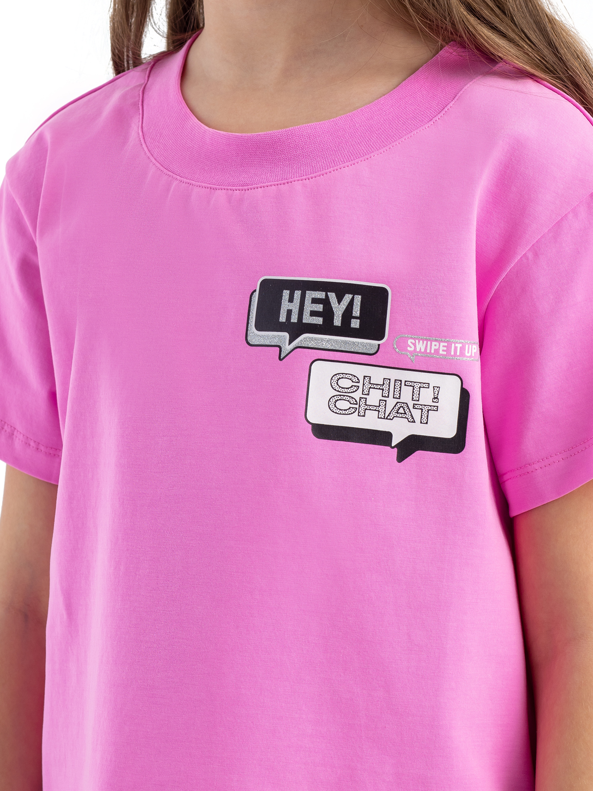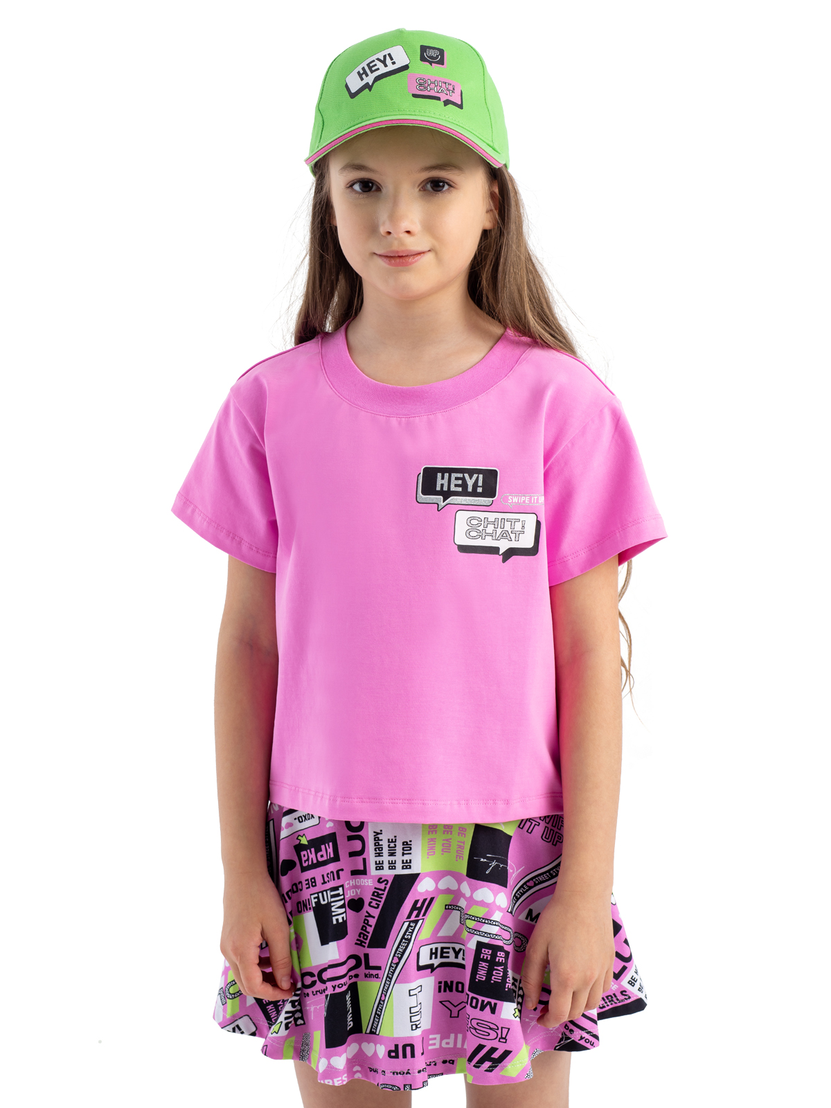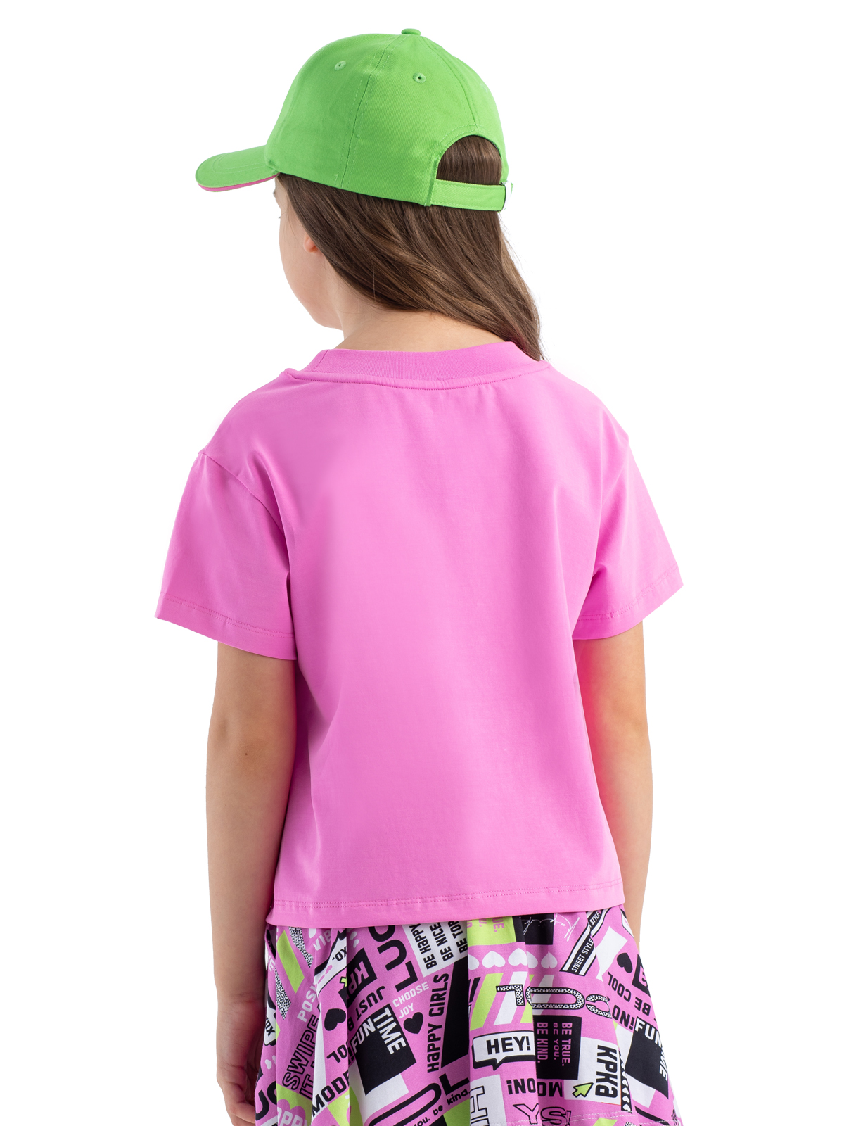 Яркая укороченная футболка для девочки из высококачественного хлопка декорирована шрифтовым принтом с добавлением глиттера. Горловина усилена широким мягким рибом. Благодаря трендовому неоново-розовому цвету футболка станет любимой вещью в гардеробе вашего ребенка.