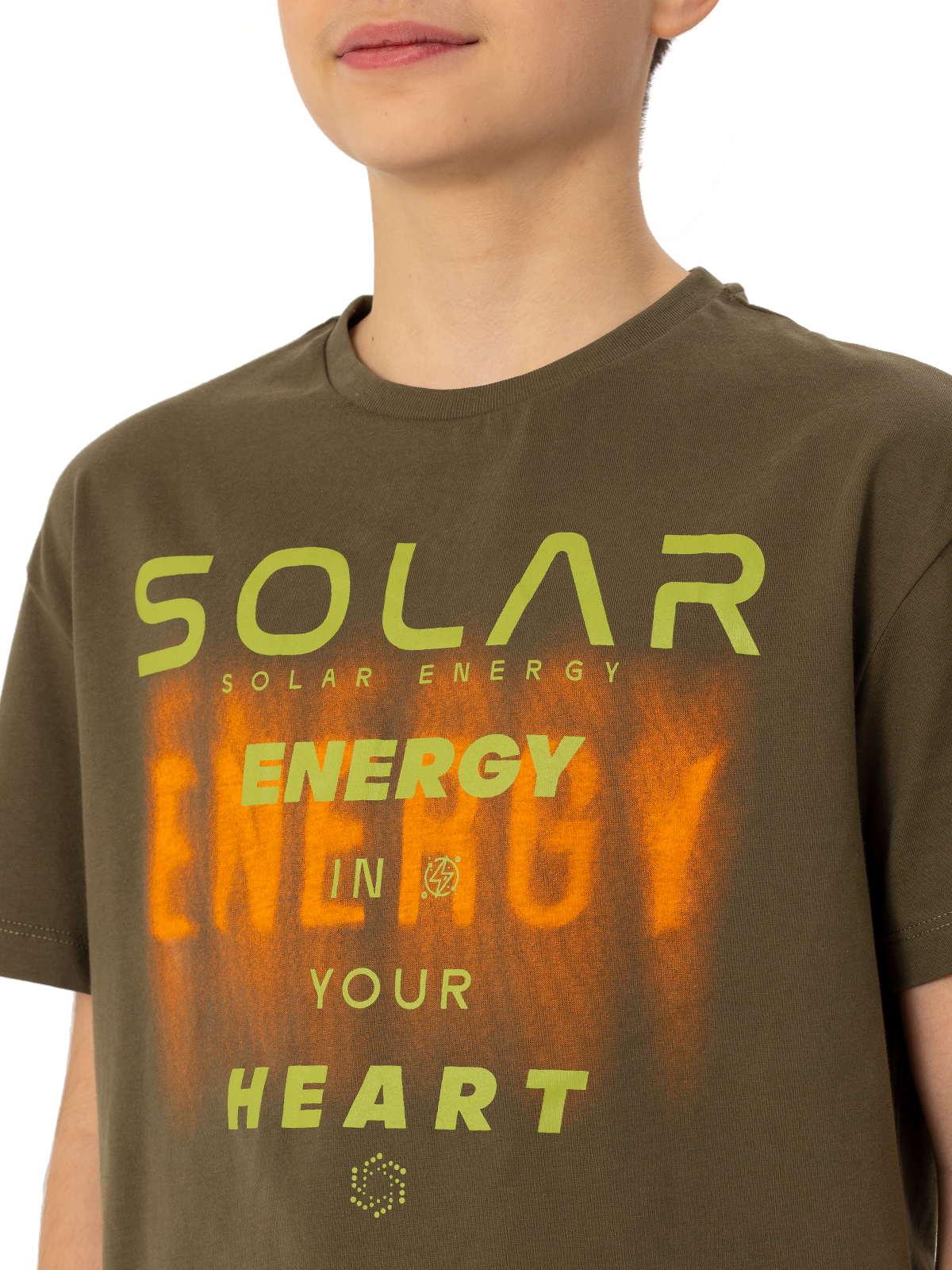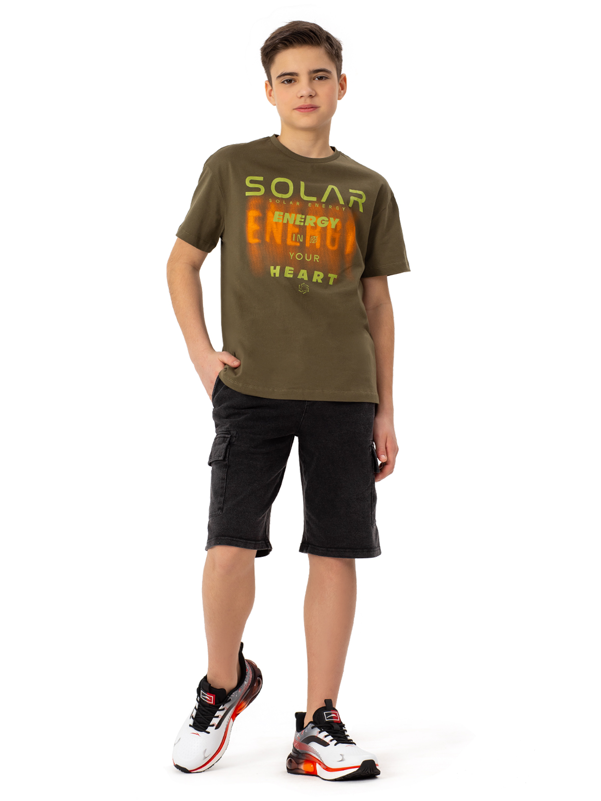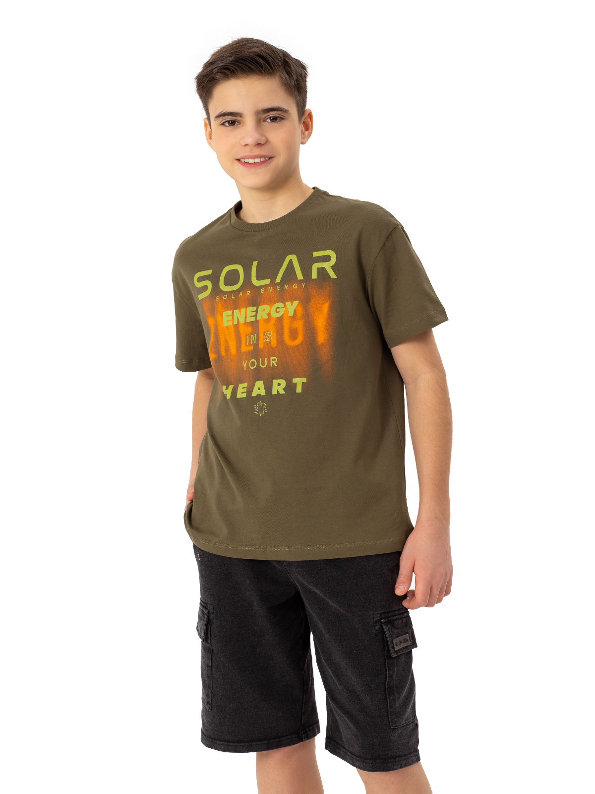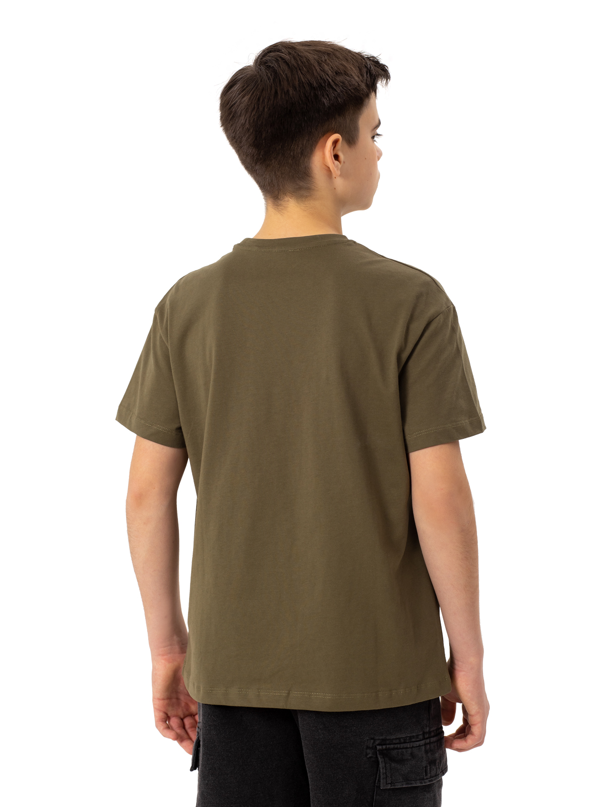 Футболка прямого кроя цвета хаки, выполнена из высококачественного хлока, обеспечивающего мягкость и комфорт при носке.Акцентом данной модели является принт, который выполнен современным инновационным способом переноса рисунка на полотно для создания ярких и долговечных изображений.