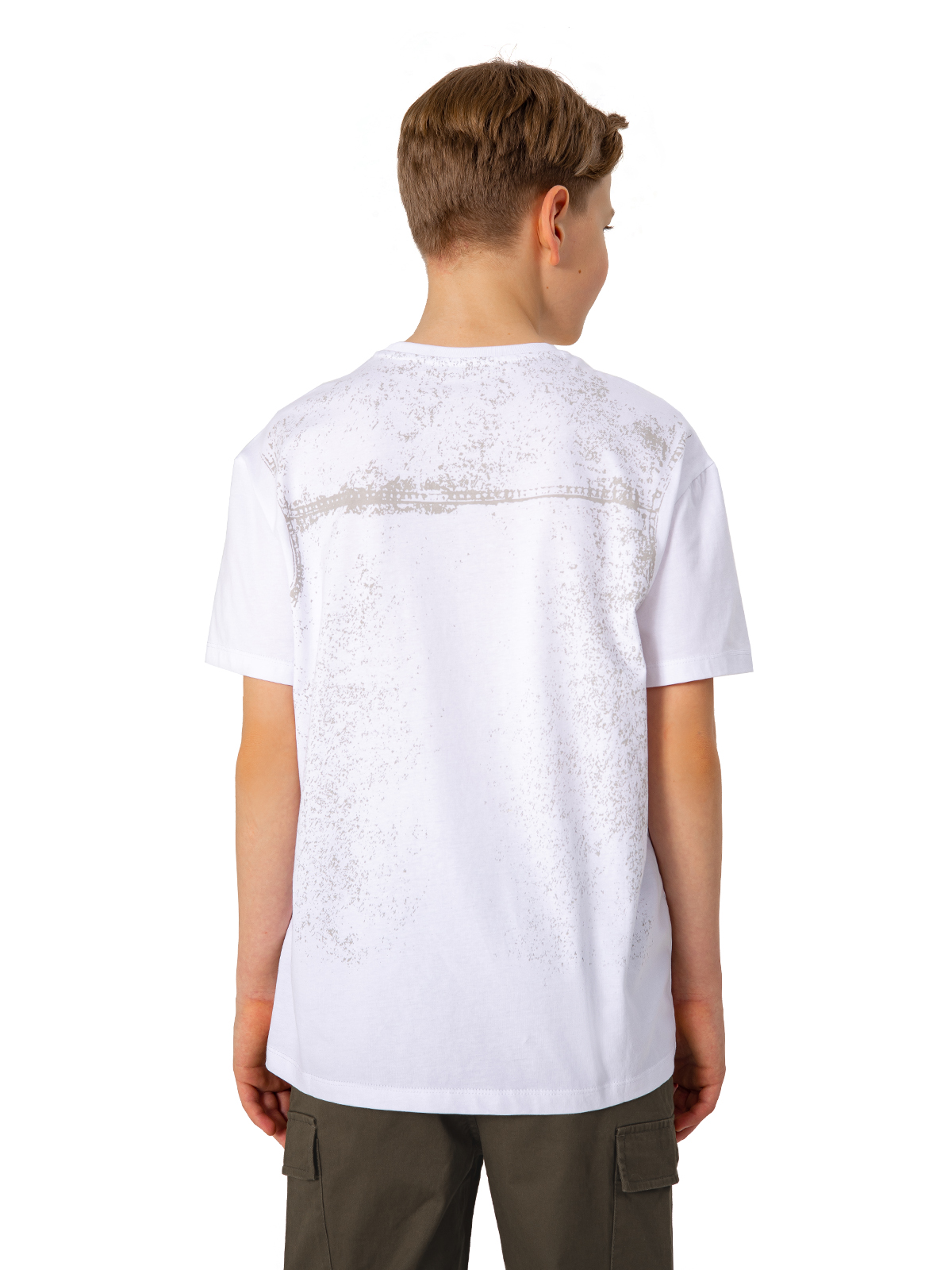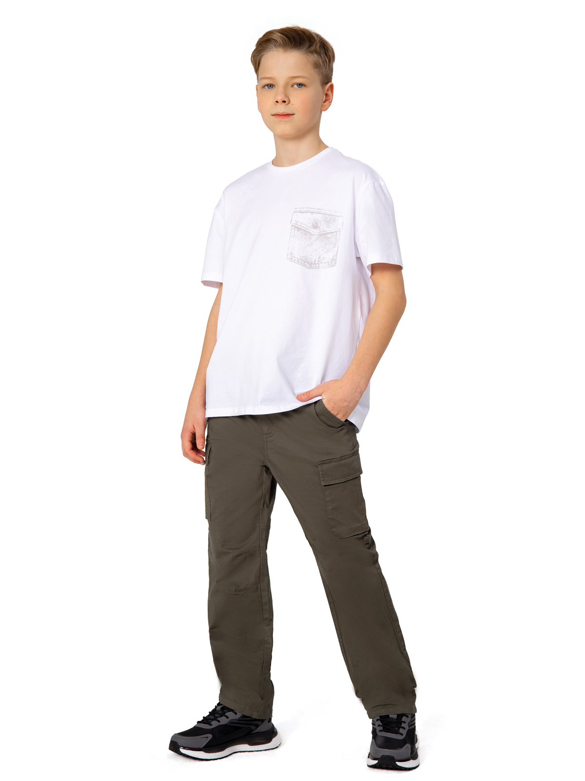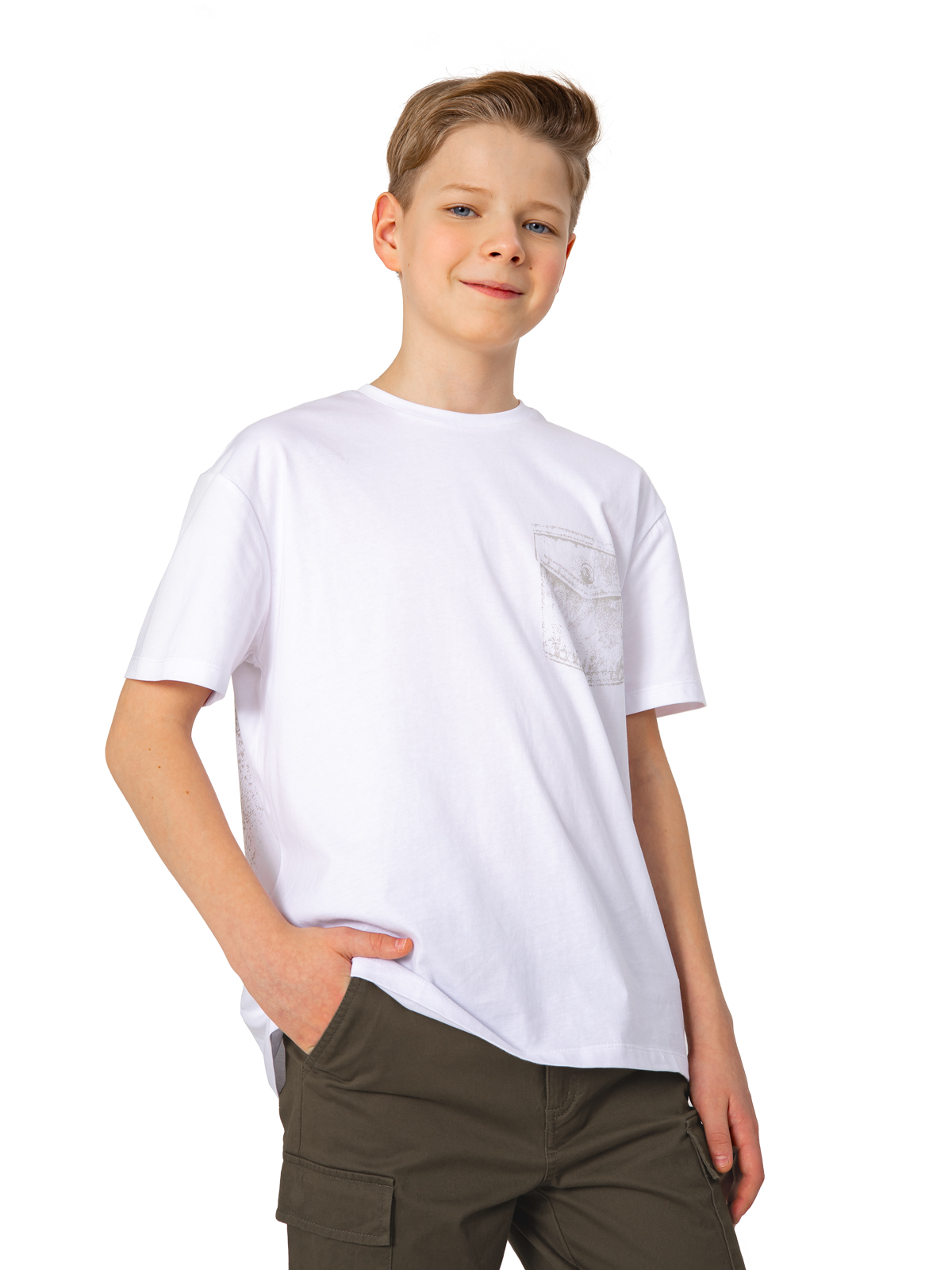 Футболка для мальчика прямого кроя из мягкого хлопка.Универсальная модель на каждый день. Обеспечивает идеальное сочетание мягкости и прочности. Акцентом данной модели является принт, имитирующий джинсовую куртку.