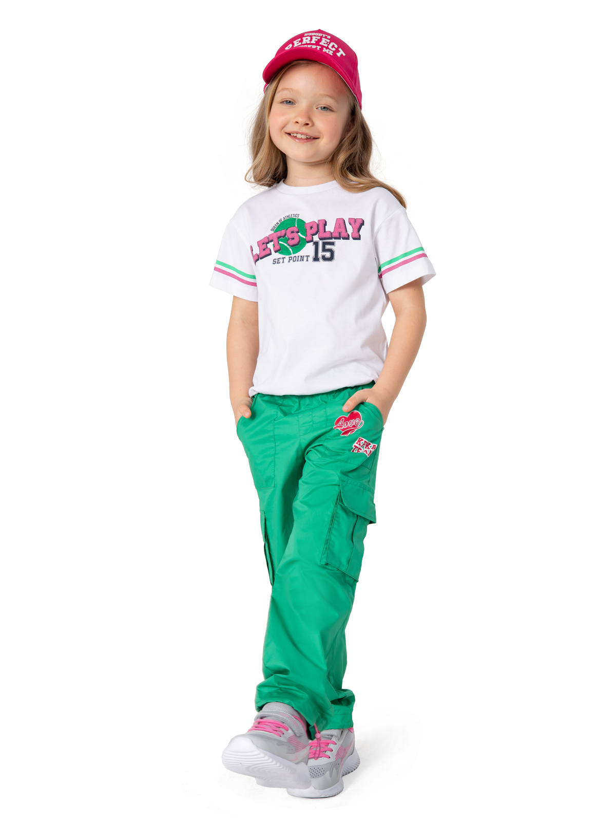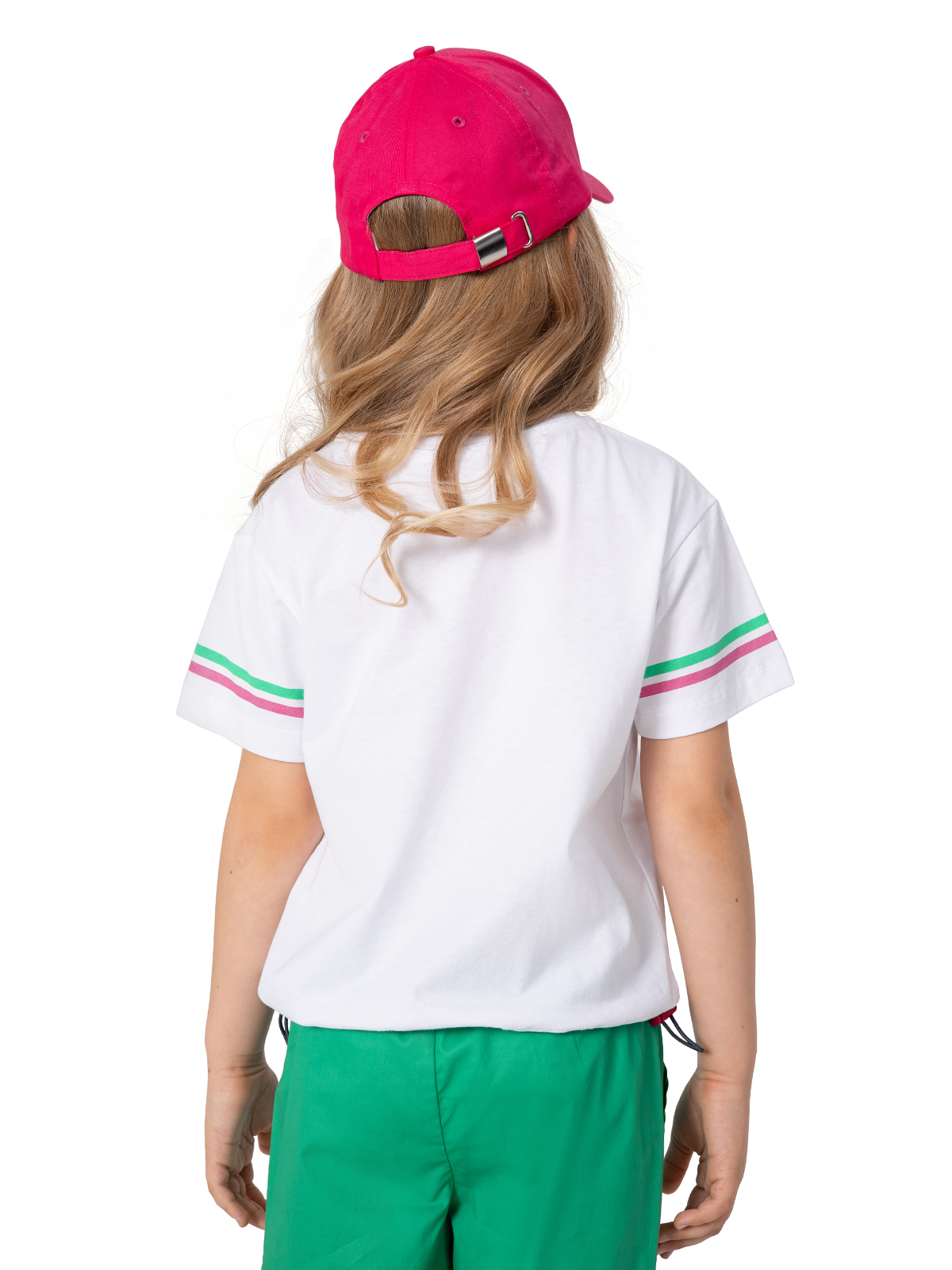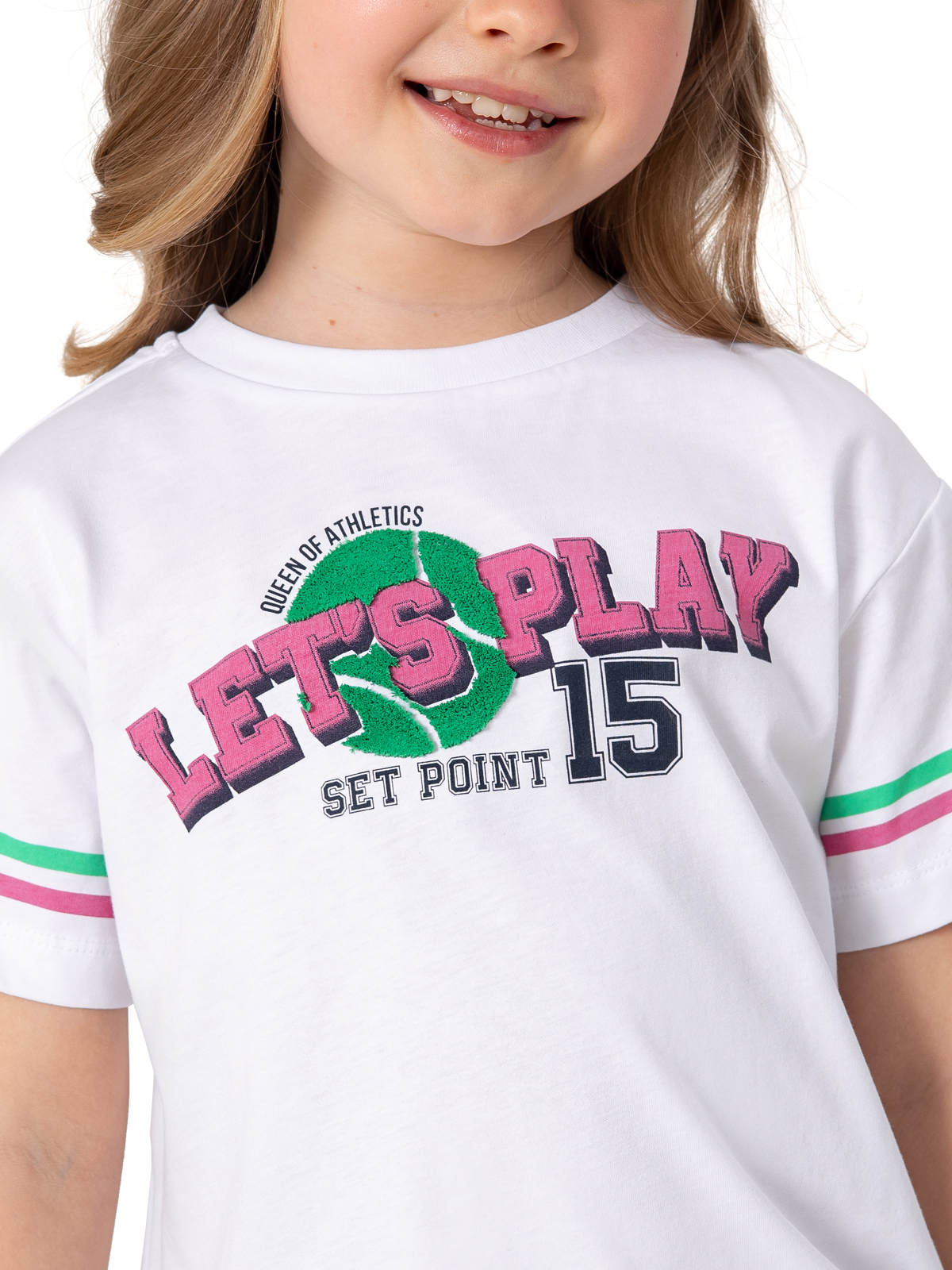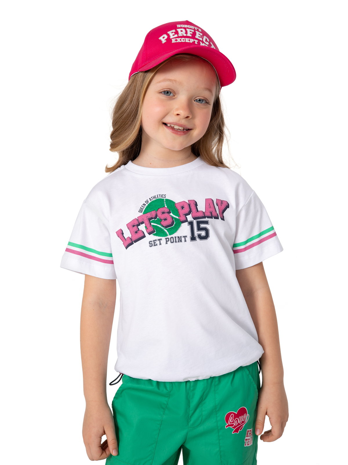 Укороченная футболка с утяжкой вдоль нижней части - эффектная летняя модель для ваших ярких образов. Футболка изготовлена из трикотажа.Полностью натуральный материал обладает дышащим и гипоаллергенным эффектом, особой мягкостью и простотой в уходе. Акцентом данной модели является объемный термопринт на груди в теннисной эстетике.