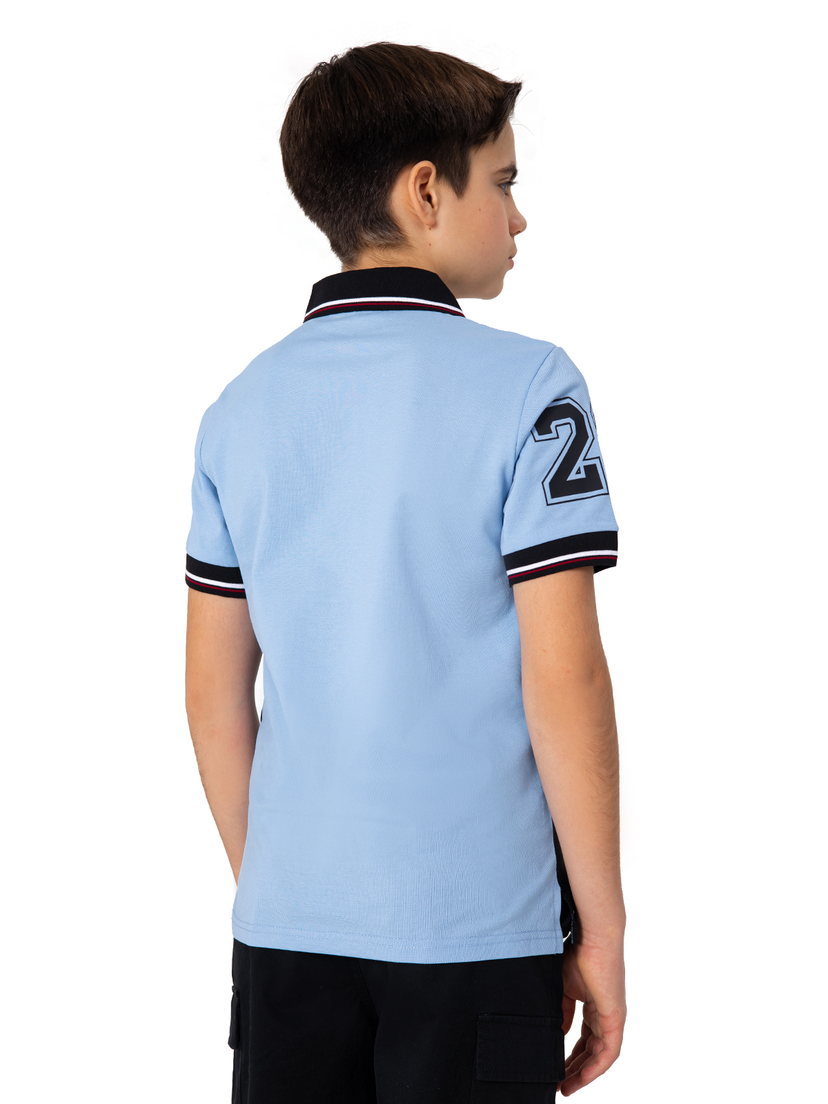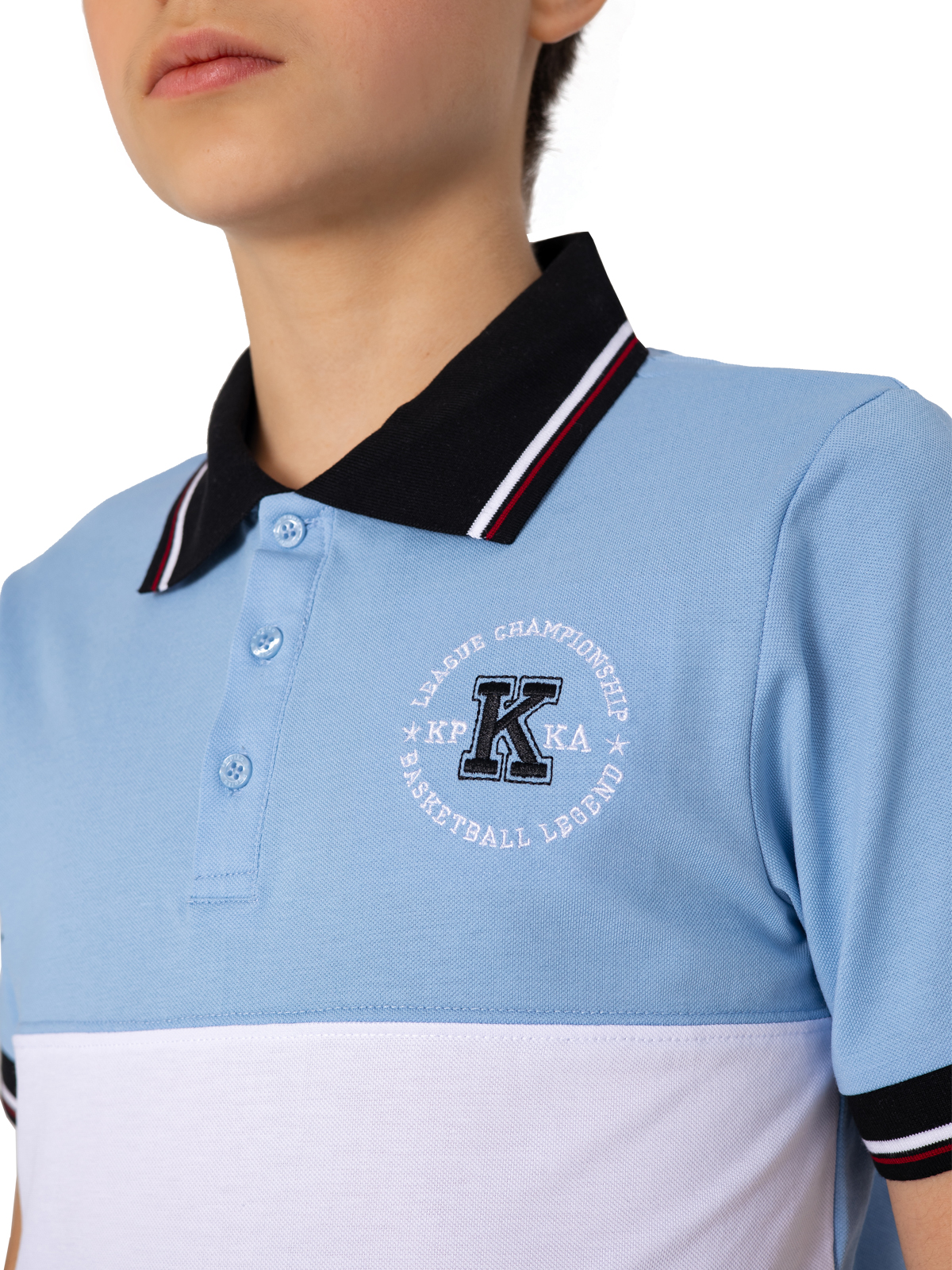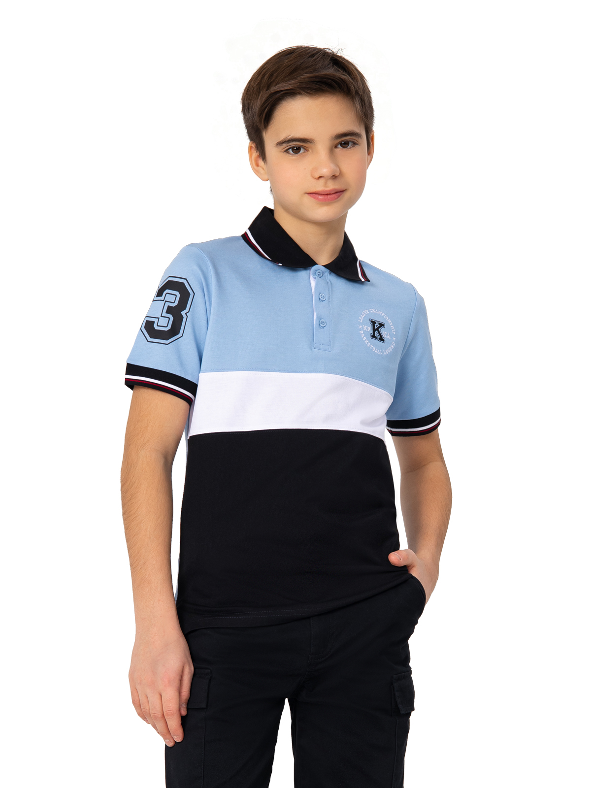 Футболка-поло в голубом цвете сочетает в себе элементы классики и современности. Контрастные полоски color block. Воротничок-поло и манжеты выполнены из риба, что гарантирует комфорт и долговечность в носке. Литерный принт на рукаве добавляет оригинальности образу.