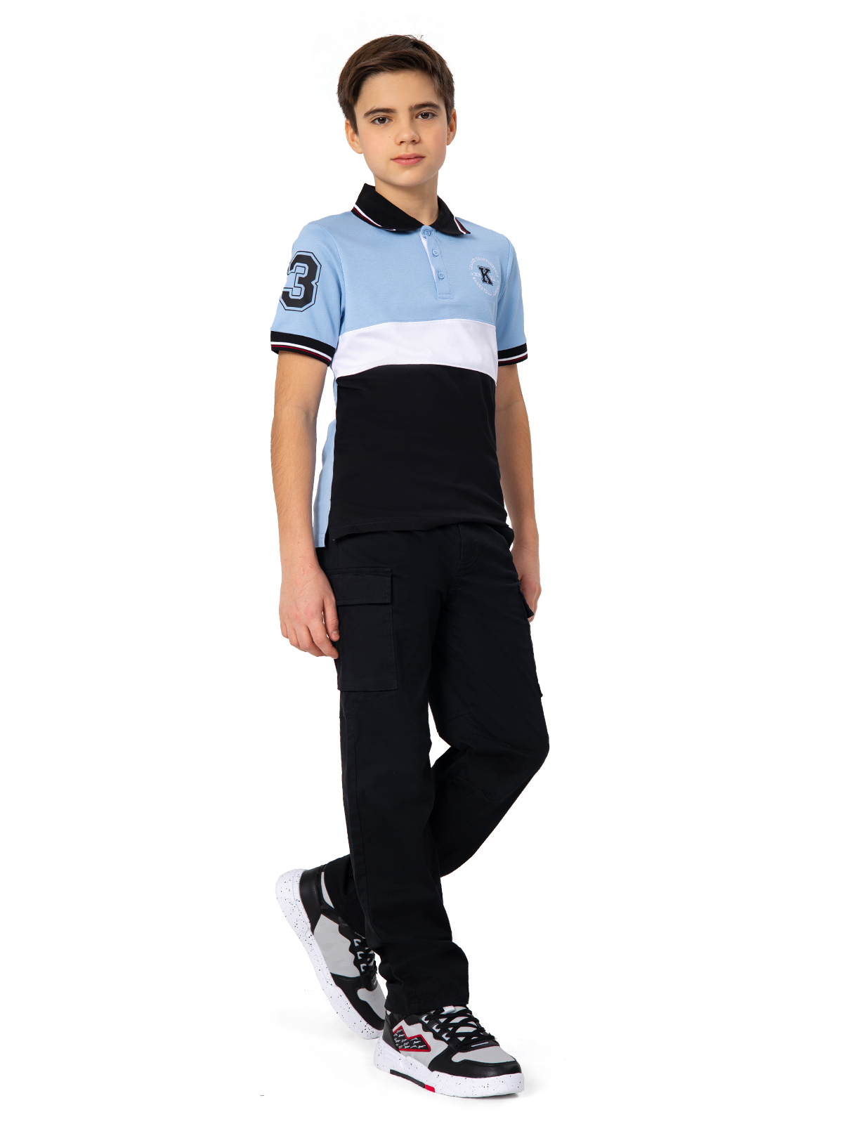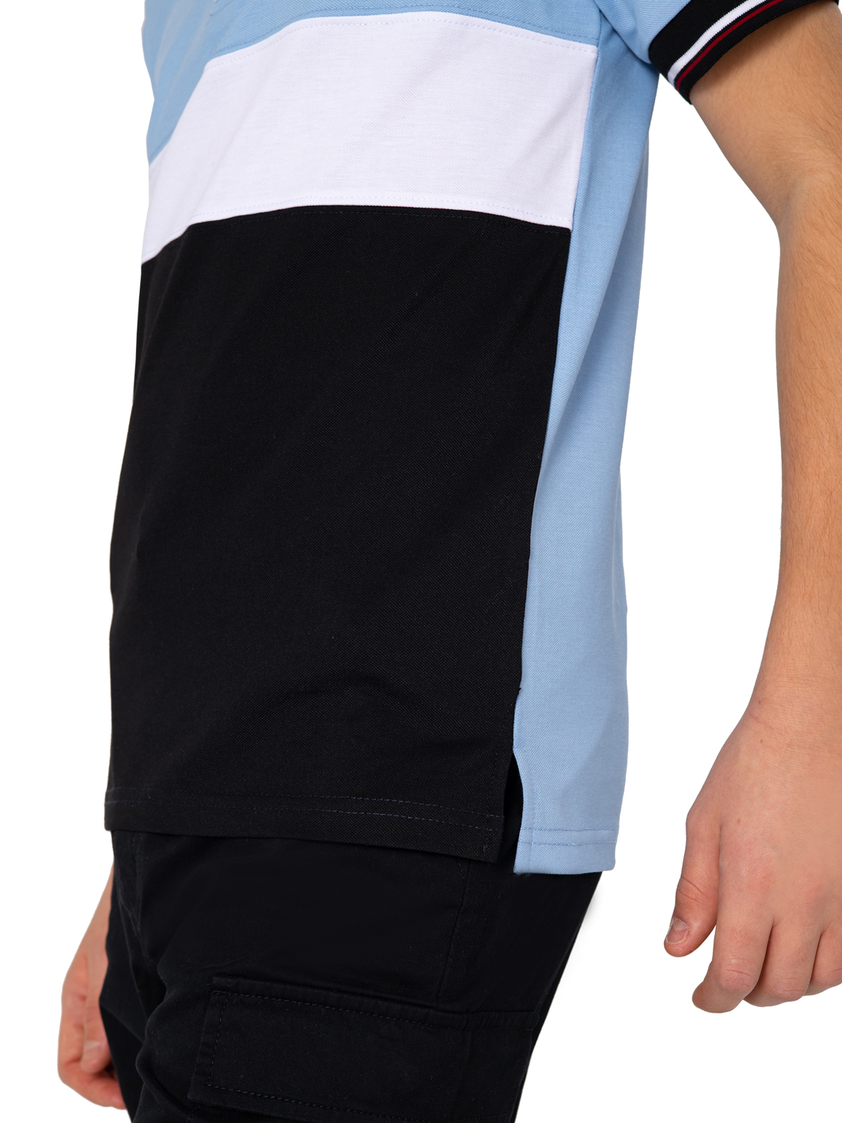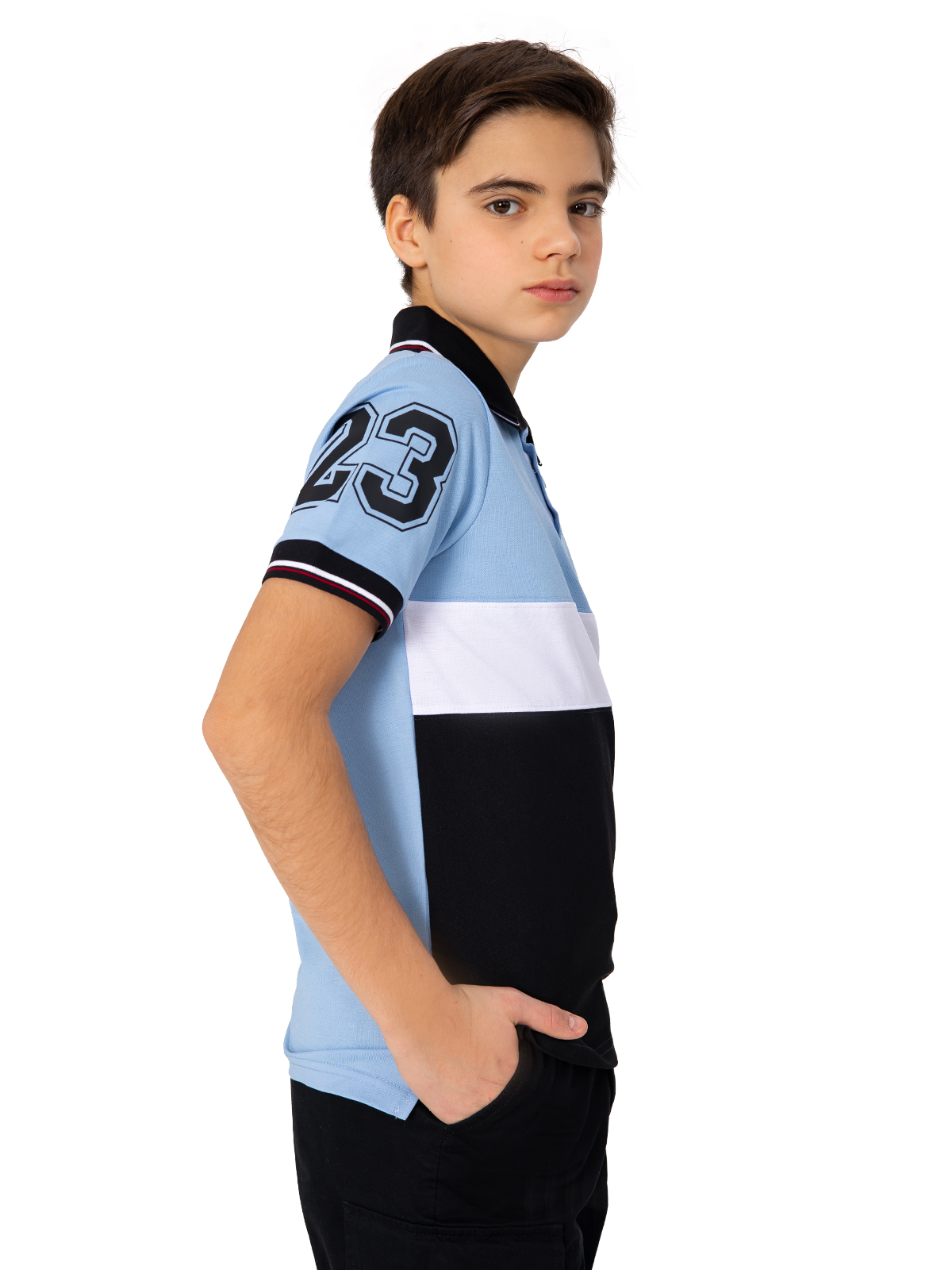 Футболка-поло в голубом цвете сочетает в себе элементы классики и современности. Контрастные полоски color block. Воротничок-поло и манжеты выполнены из риба, что гарантирует комфорт и долговечность в носке. Литерный принт на рукаве добавляет оригинальности образу.