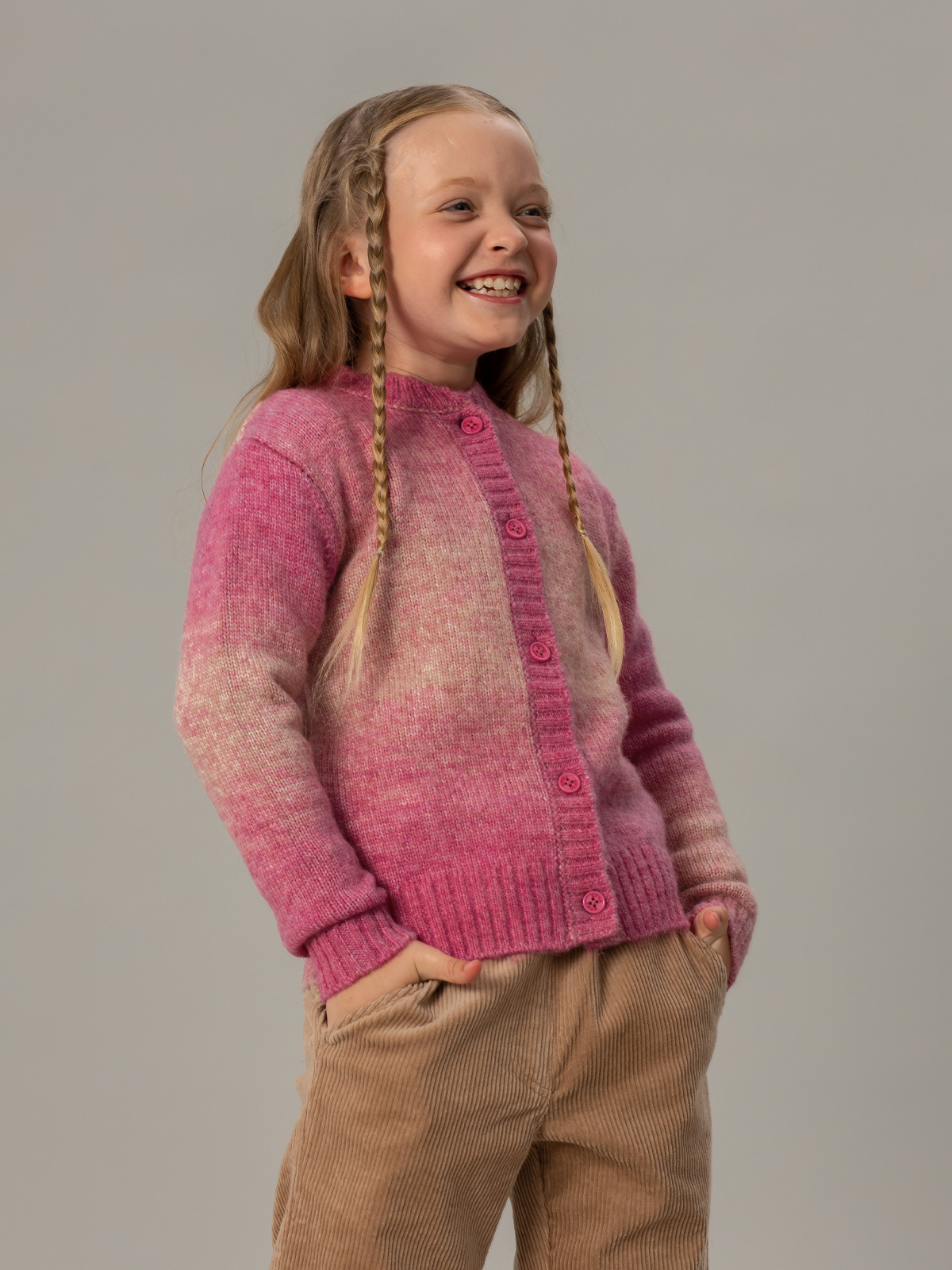 Вязаный кардиган из градиентной пряжи станет ярким и оригинальным дополнением в гардеробе девочки. Он прекрасно сочетается как с повседневными брюками и джинсами, так и с нарядными платьями и юбками. В составе изделия используется натуральная шерсть, что делает его мягким и очень теплым, создает уют и комфорт при носке, свободный силуэт не стесняет движения. Изделие застегивается на контрастные пуговицы.