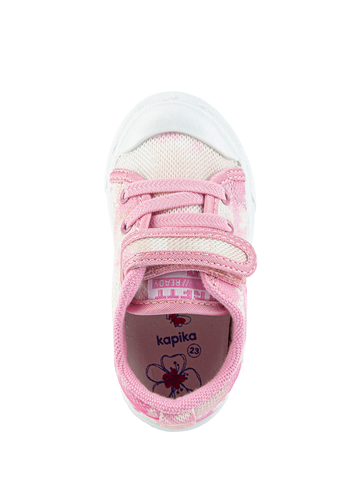 Кеды Капика из плотного хлопка с яркой застежкой-липучкой и эластичным шнурком обязательно понравятся каждой девочке. Подкладка из хлопка, гибкая подошва с защищенной носовой частью из ПВХ и кожаная стелька обеспечивают комфорт и удобство при ношении. Капика создает качественную и стильную обувь для маленьких модниц.