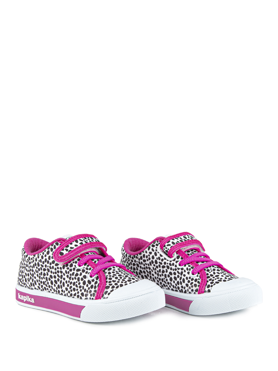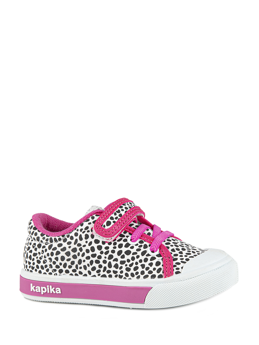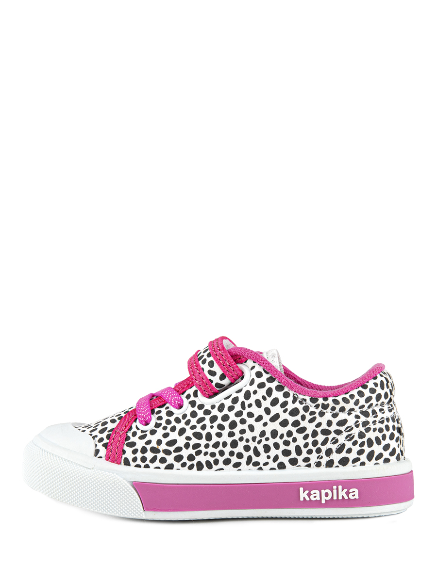 Кеды Капика из плотного хлопка с яркими застежками-липучками и принтом обязательно понравятся каждой девочке. Подкладка из хлопка, гибкая подошва с защищенной носовой частью из ПВХ и кожаная стелька обеспечивают комфорт и удобство при ношении. Капика создает качественную и стильную обувь для маленьких модниц.