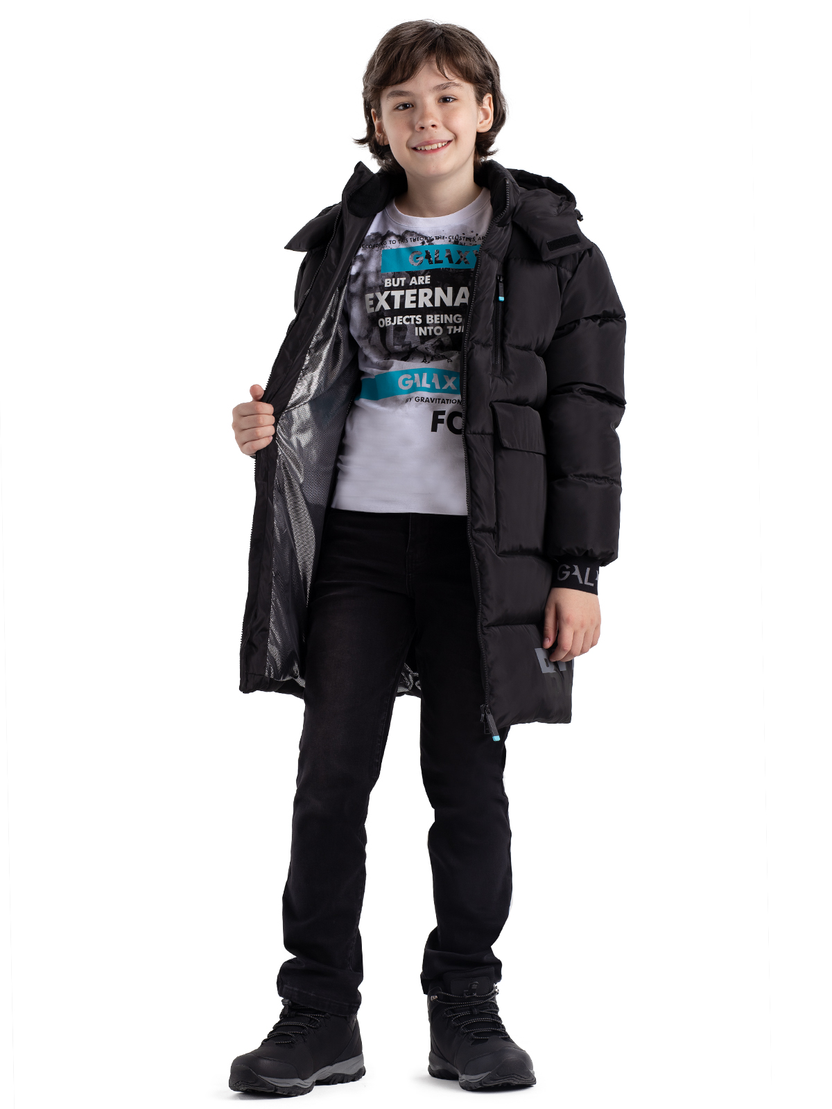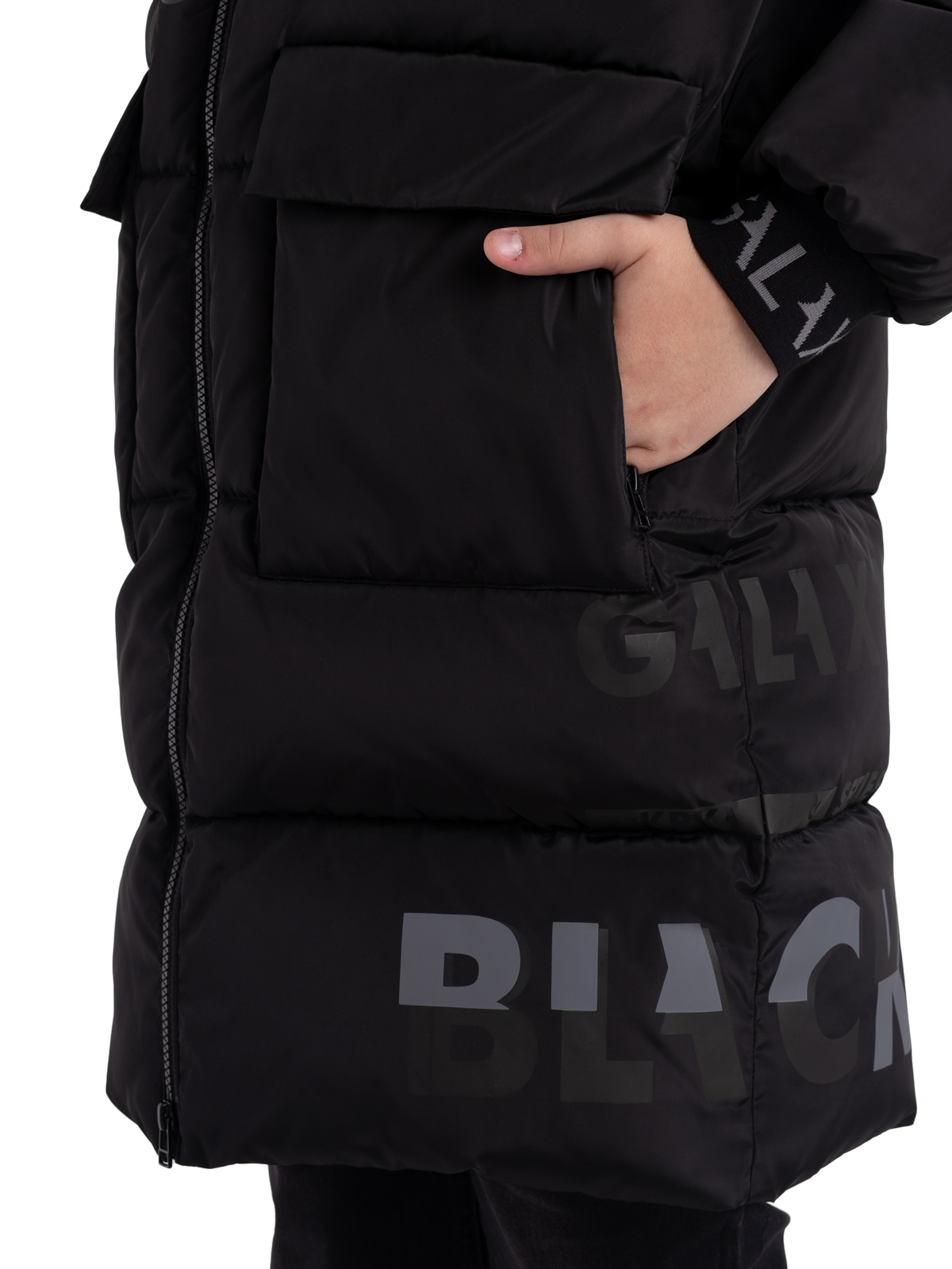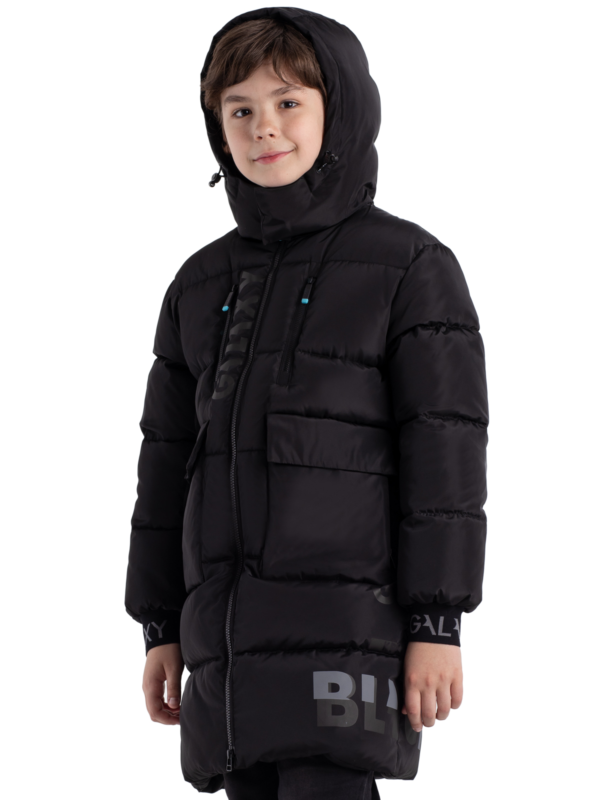 Удлиненный пуховик для мальчика-подростка из черной матовой ткани c AC водоотталкивающим покрытием имеет утеплитель искусственный пух весом 300г/м2. Капюшон несъемный, по краю капюшона регулируемая кулиса, высокий воротник изнутри утеплен флисом. Модель дополнена жаккардными манжетами из риба, молниями по бокам изделия и функциональными карманами. Пуховик декорирован принтами.