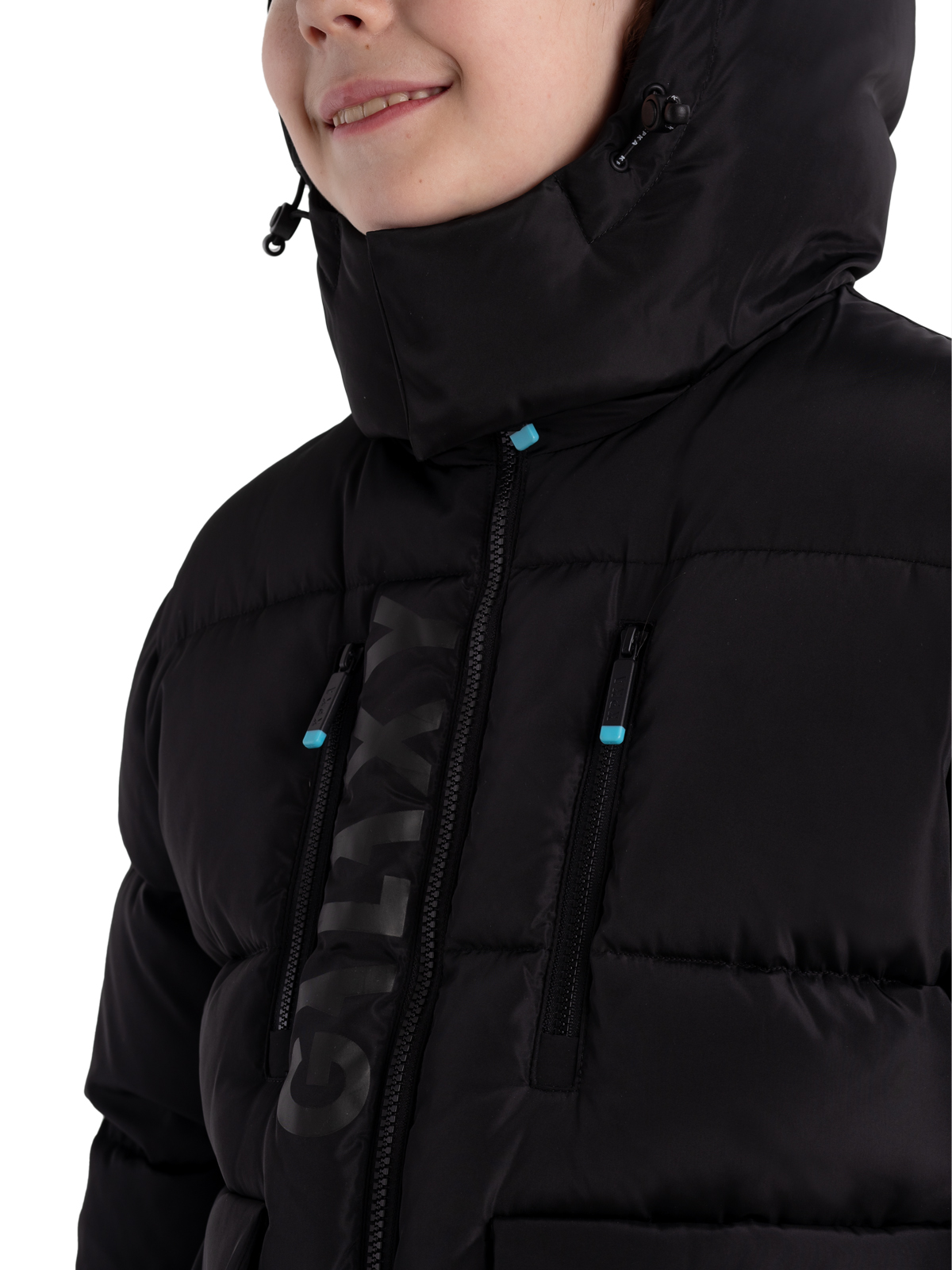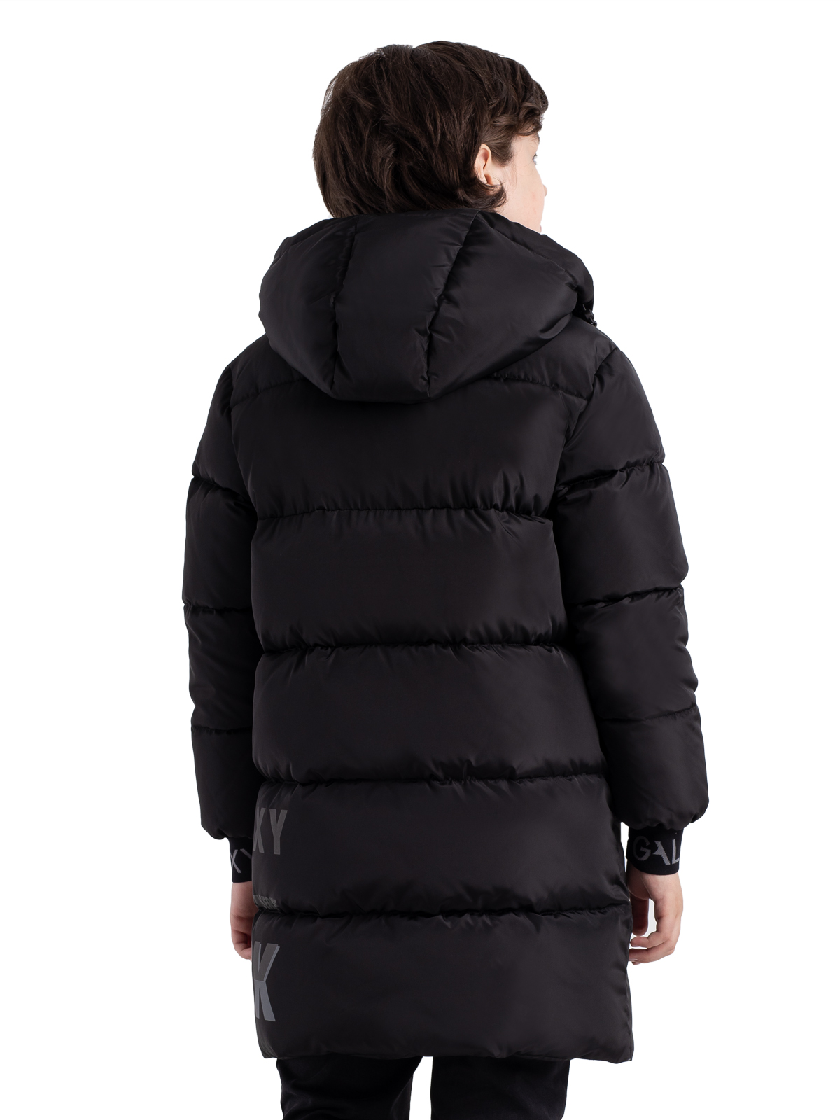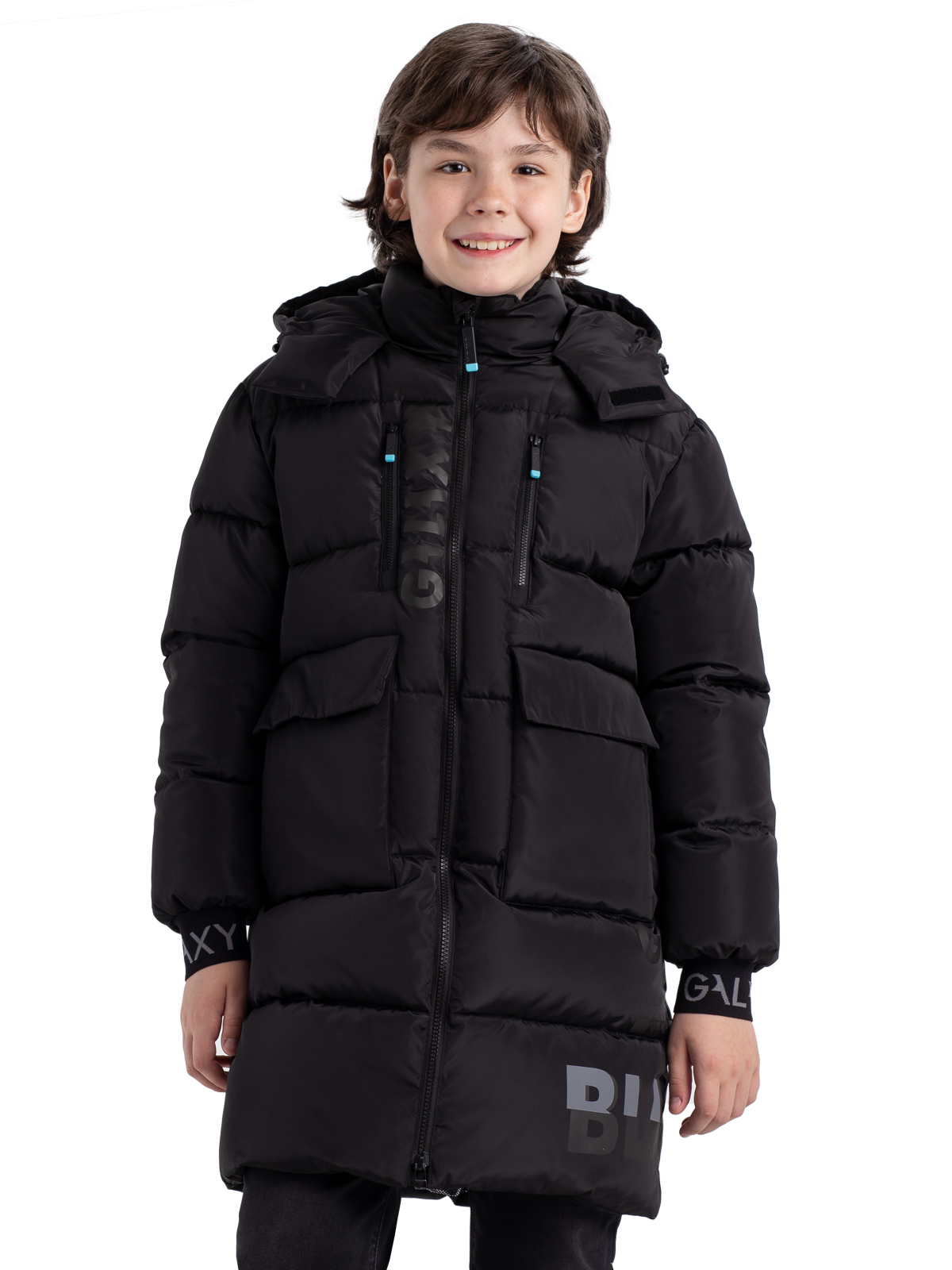Удлиненный пуховик для мальчика-подростка из черной матовой ткани c AC водоотталкивающим покрытием имеет утеплитель искусственный пух весом 300г/м2. Капюшон несъемный, по краю капюшона регулируемая кулиса, высокий воротник изнутри утеплен флисом. Модель дополнена жаккардными манжетами из риба, молниями по бокам изделия и функциональными карманами. Пуховик декорирован принтами.