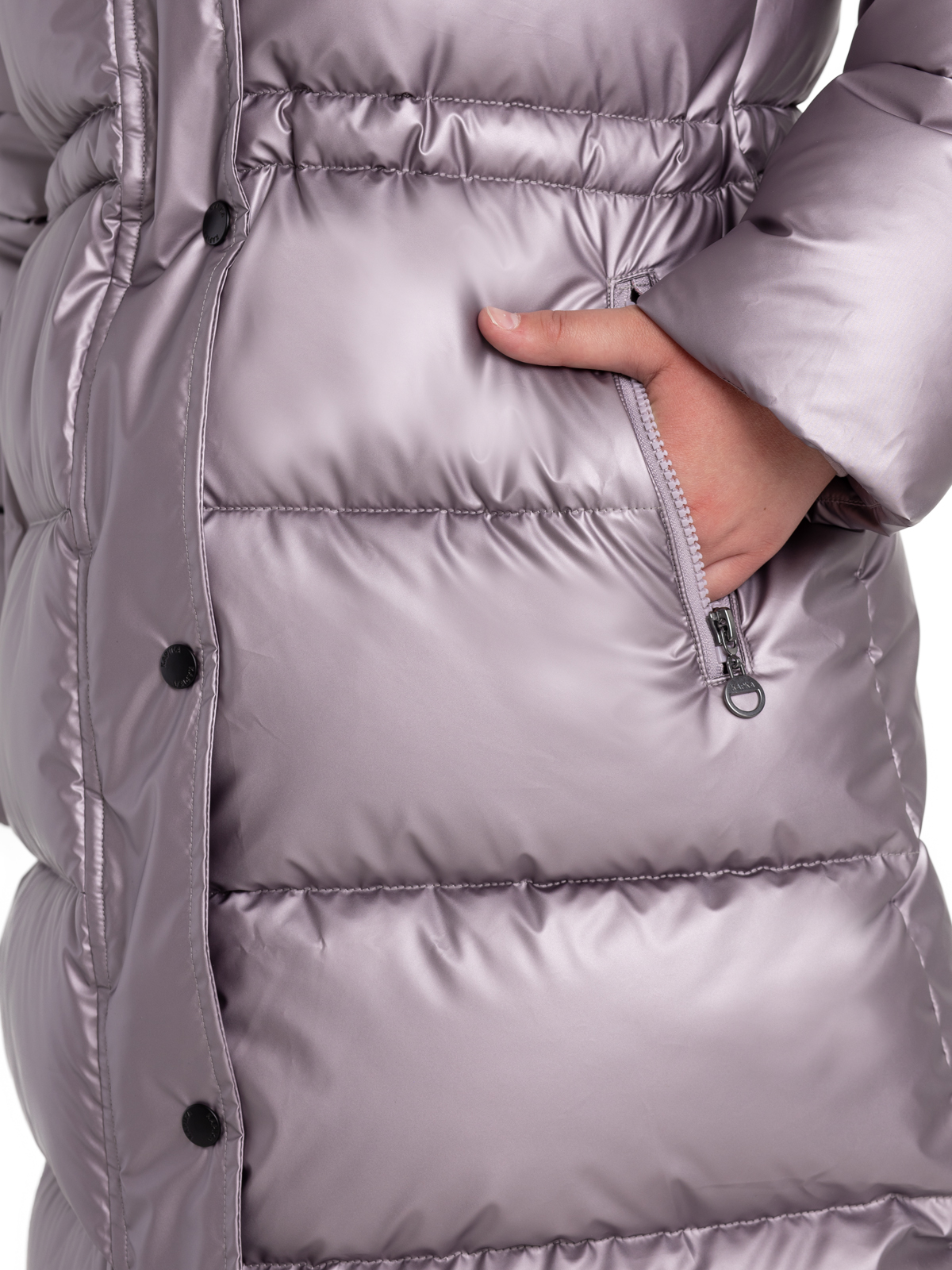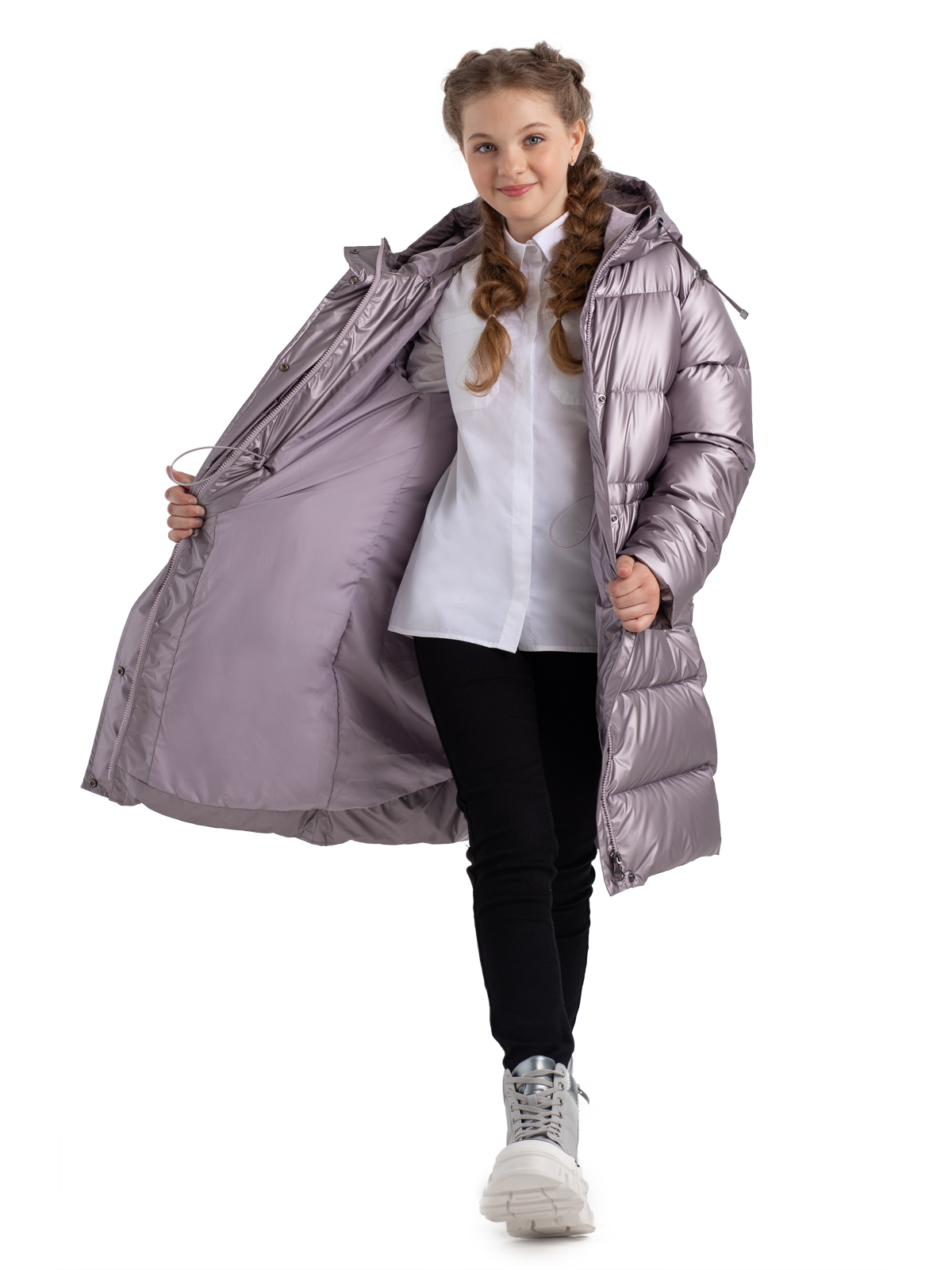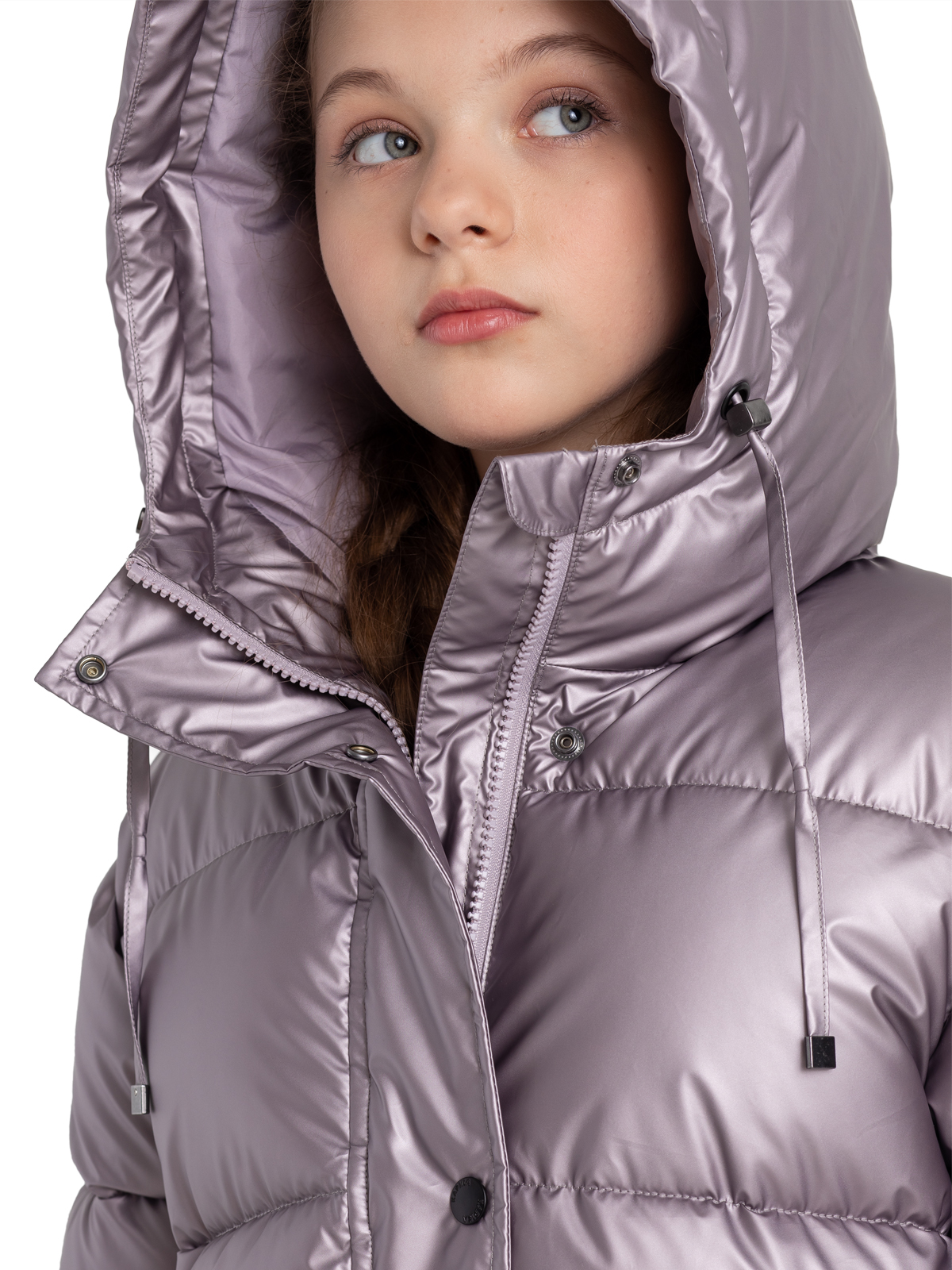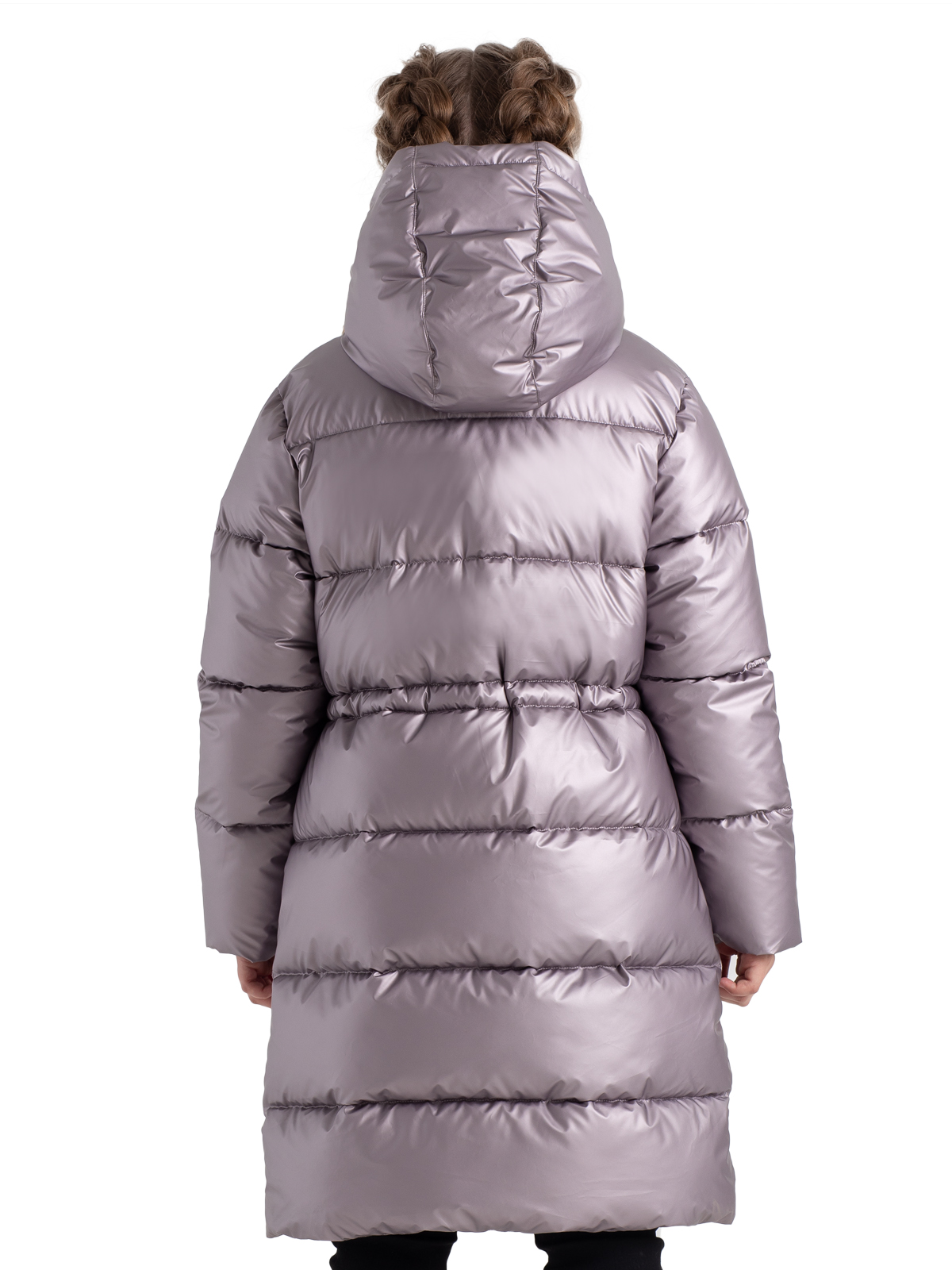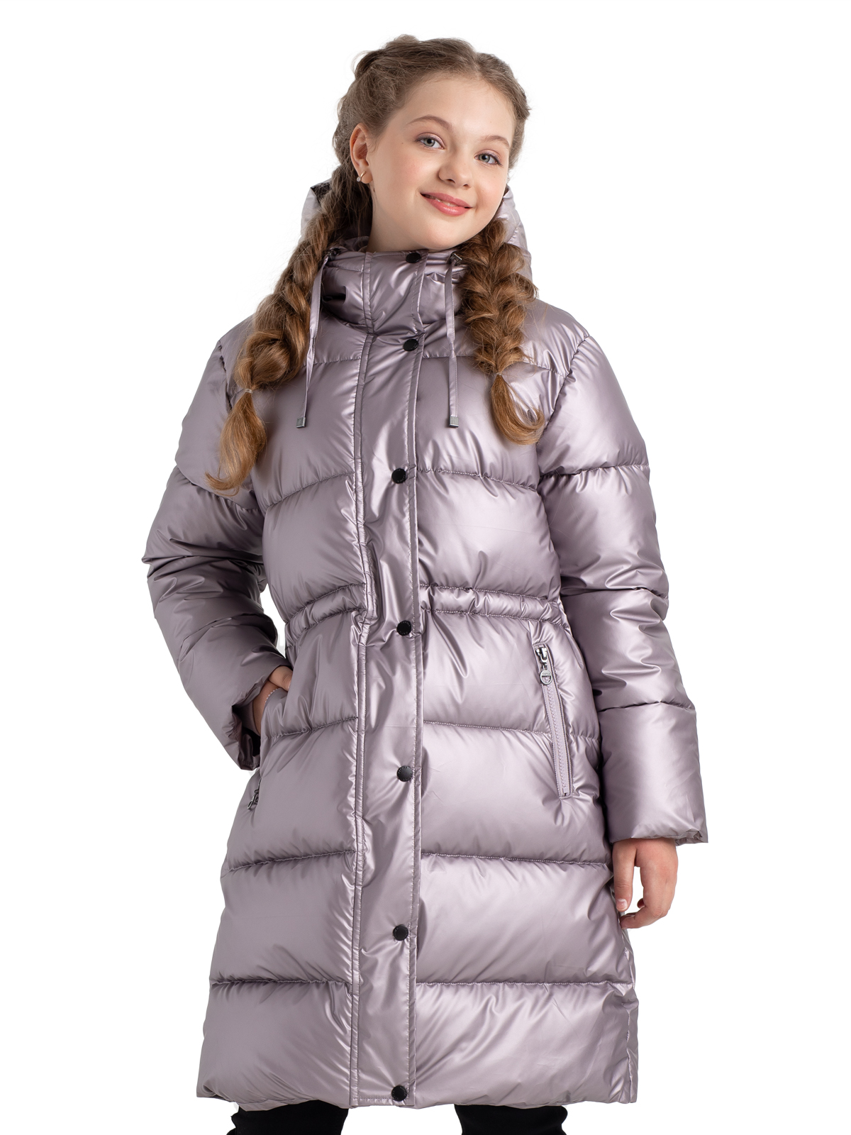 Удлиненный пуховик для девочки-подростка в трендовом цвете с блестящим финишем, имеет утеплитель - искусственный пух весом 300г/м2. Ре Оптимальная длина, цельный капюшон с регулируемой кулисой, манжеты на резинке, ветрозащитная планка обеспечивают защиту от холода и ветра. Утяжка по талии позволит ещё лучше защититься от ветра и поэкспериментировать с силуэтами.
