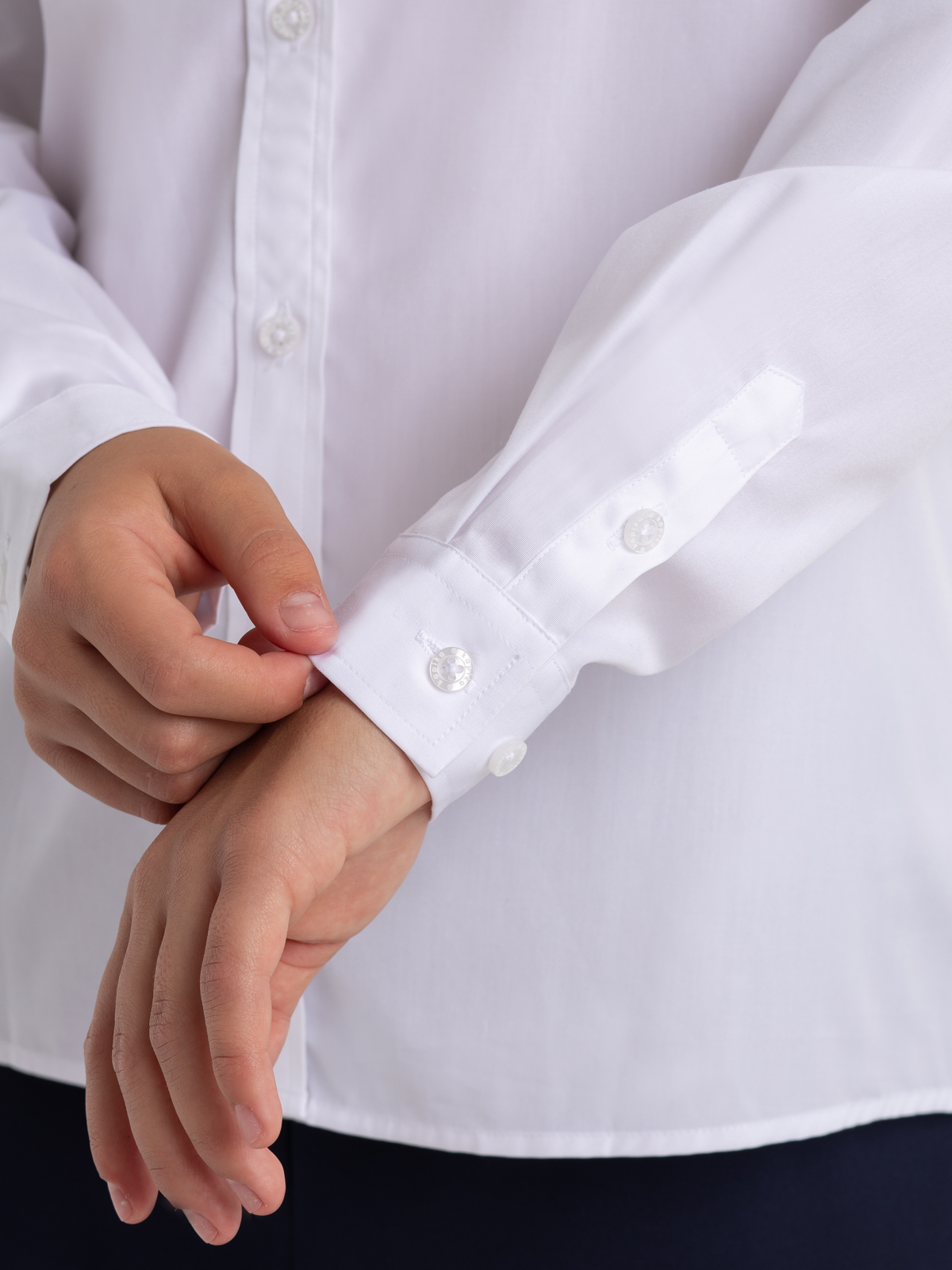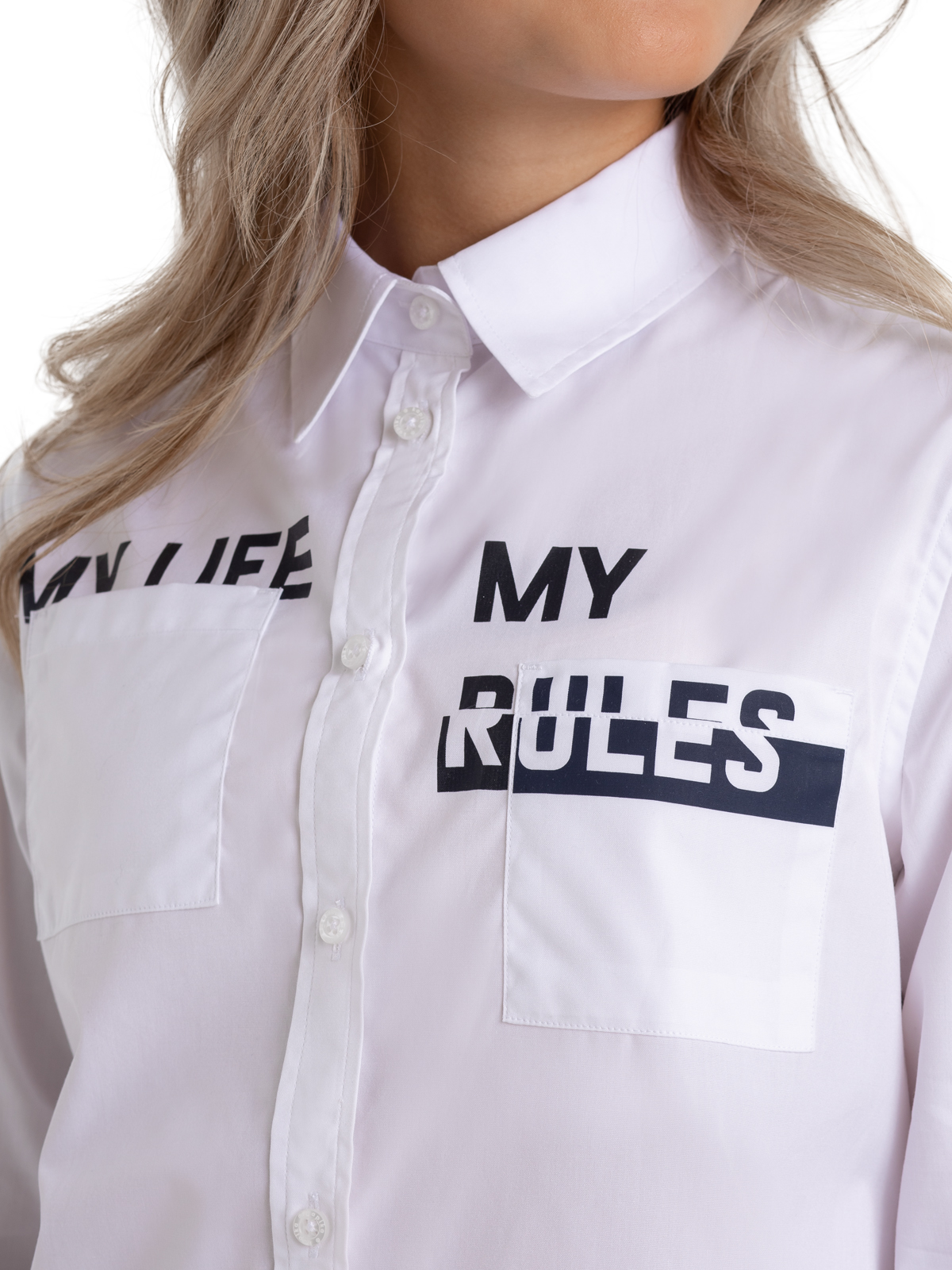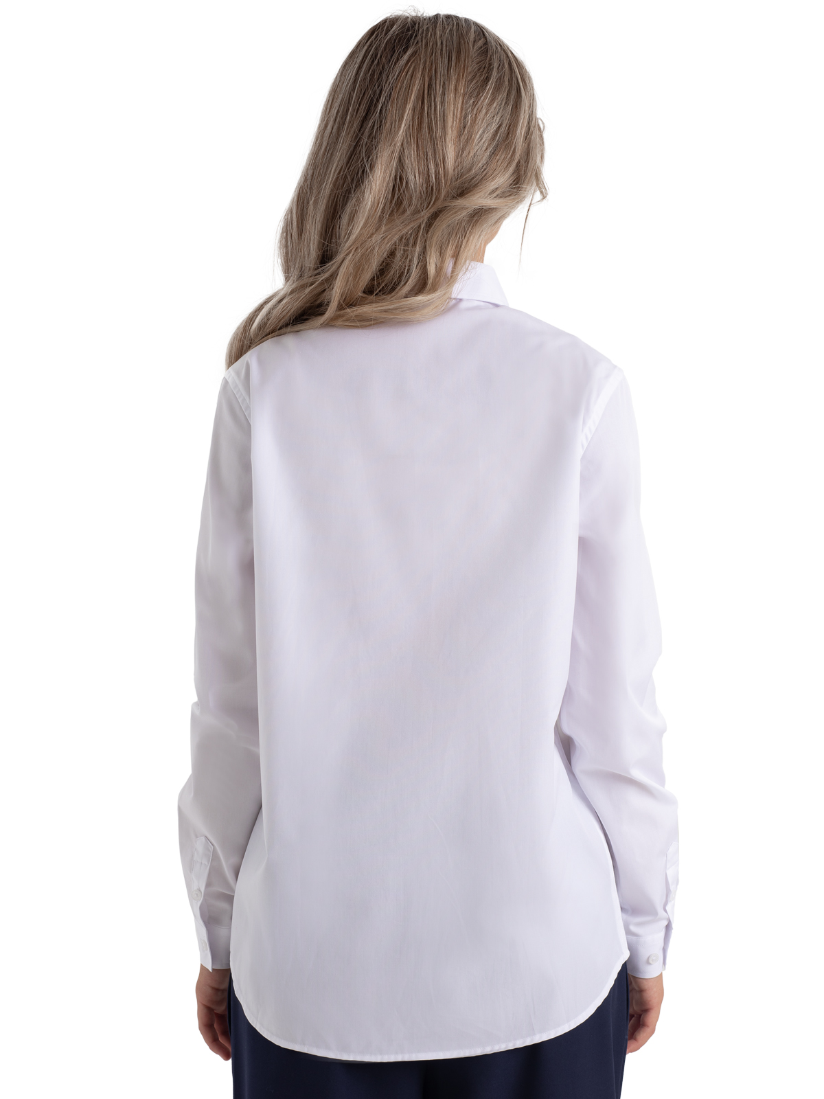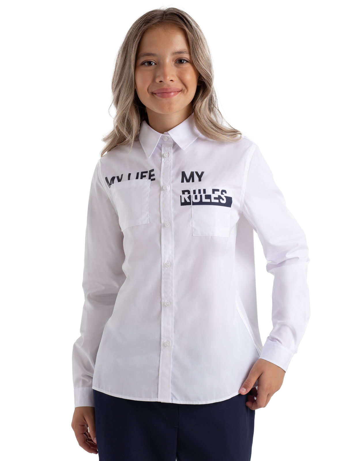 Школьная рубашка для девочки в классическом белом цвете из высококачественного поликоттона дополнена контрастными принтами по полочке. Модель рубашки для школы классического силуэта хорошо сочетается с юбками, брюками или джинсами. Комфортная дышащая ткань легка в уходе, не скатывается, держит форму. Рубашка отлично подойдет как для школьных занятий, и торжественных мероприятий так и для ежедневной носки.
