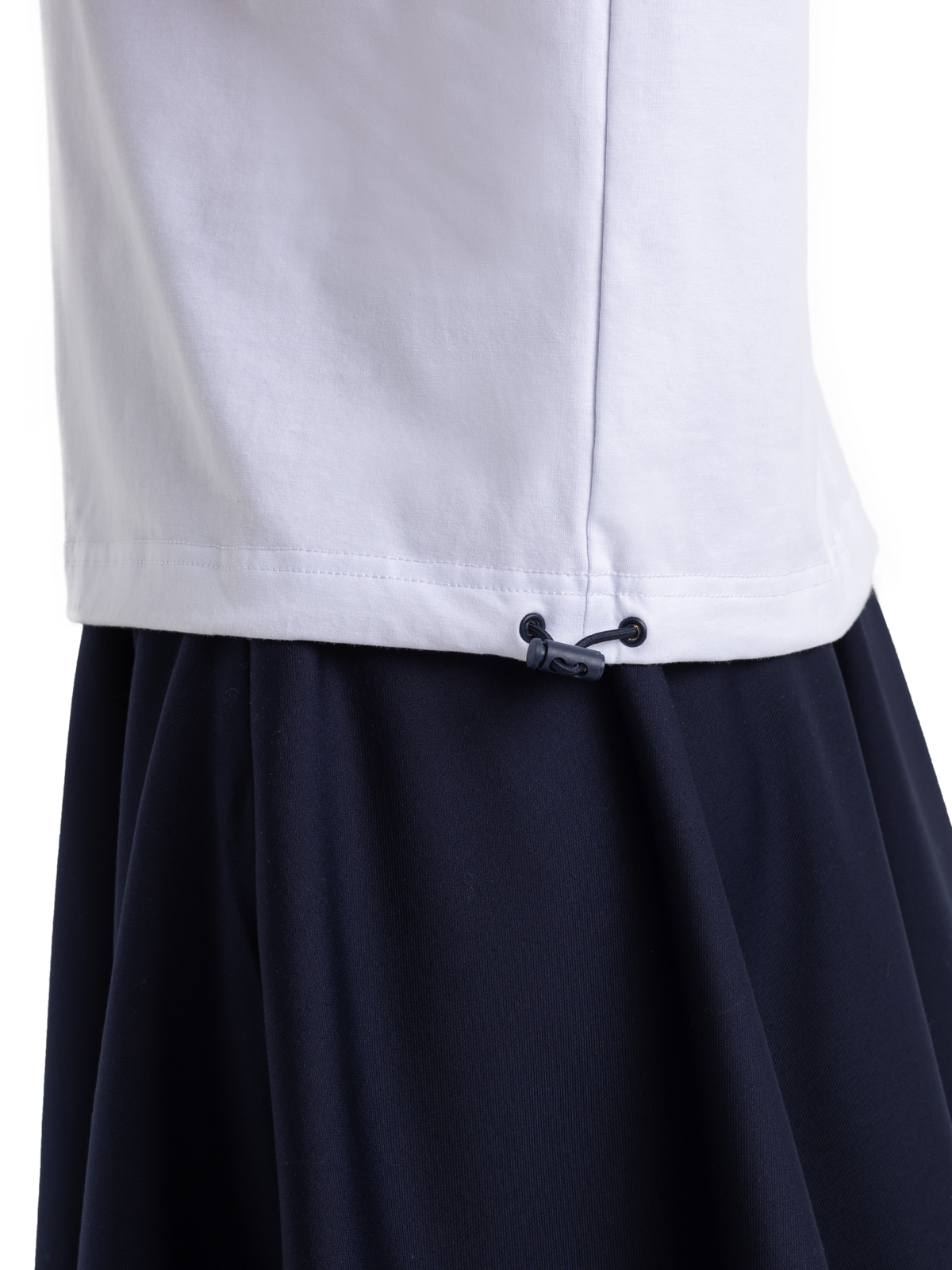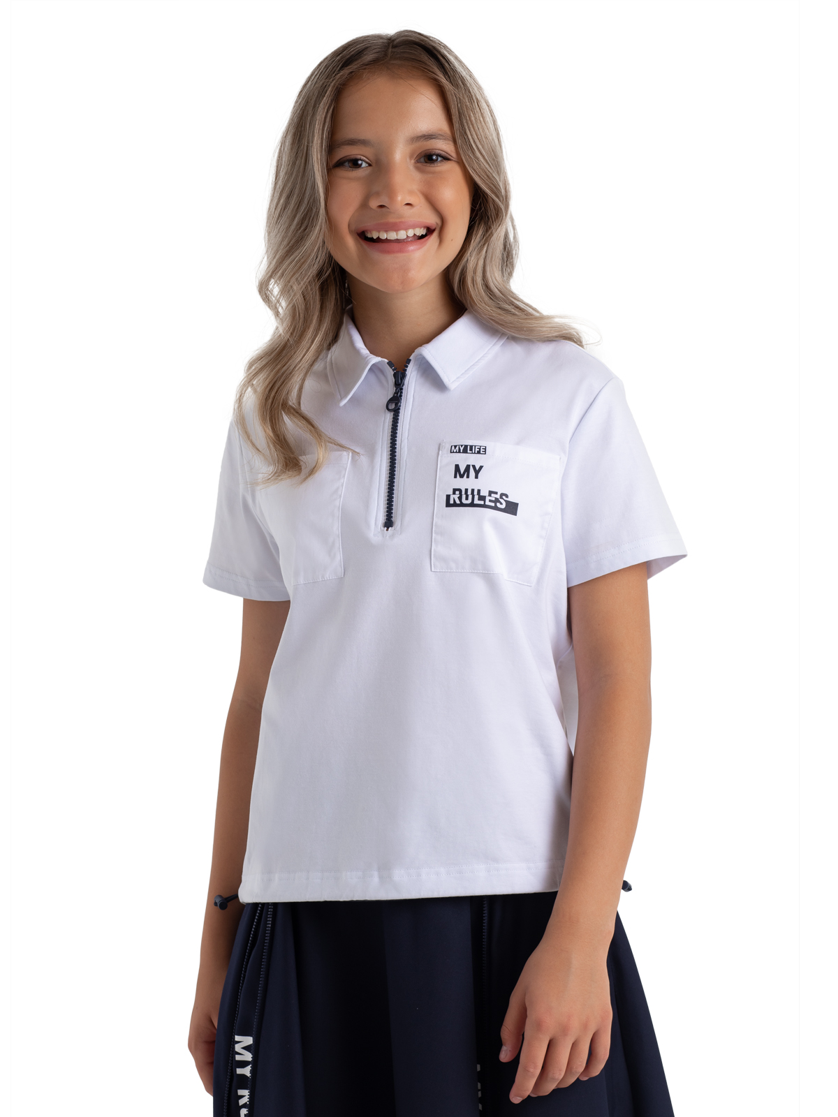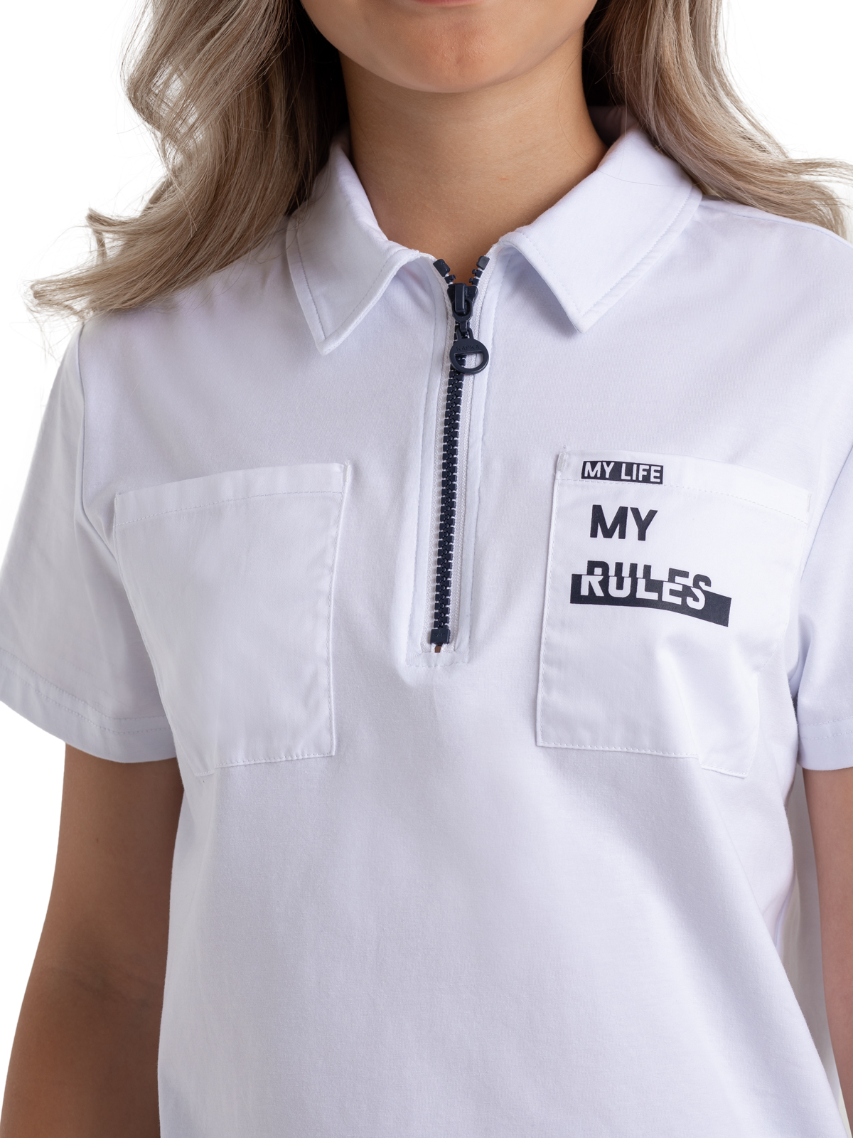 Трикотажная школьная блузка-футболка белого цвета выполнена из высококачественного хлопка. Трикотажная блузка для школы с рубашечным воротником застегивается на контрастную молнию по переду. Модель дополнена функциональными карманами по переду с контрастным принтом и контрастными регулирующими шнурками по низу изделия, позволяющими экспериментировать с силуэтом и длиной. Трикотаж мало мнется, удобен в носке, сохраняет цвет и форму после многих стирок.