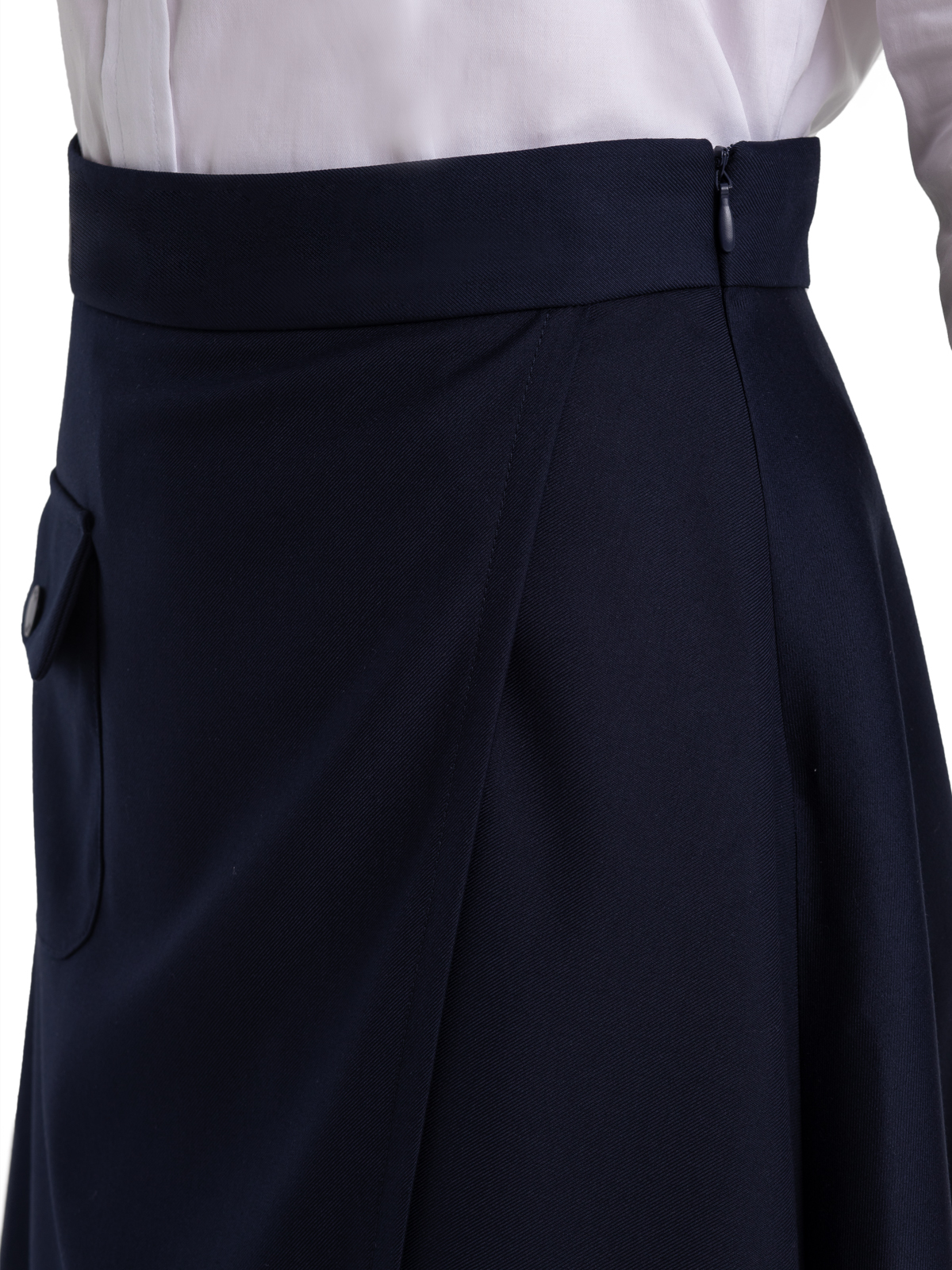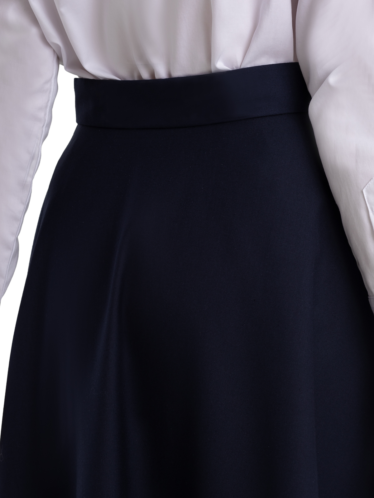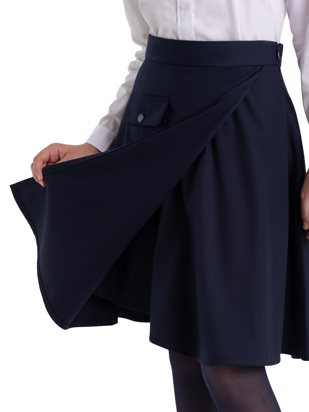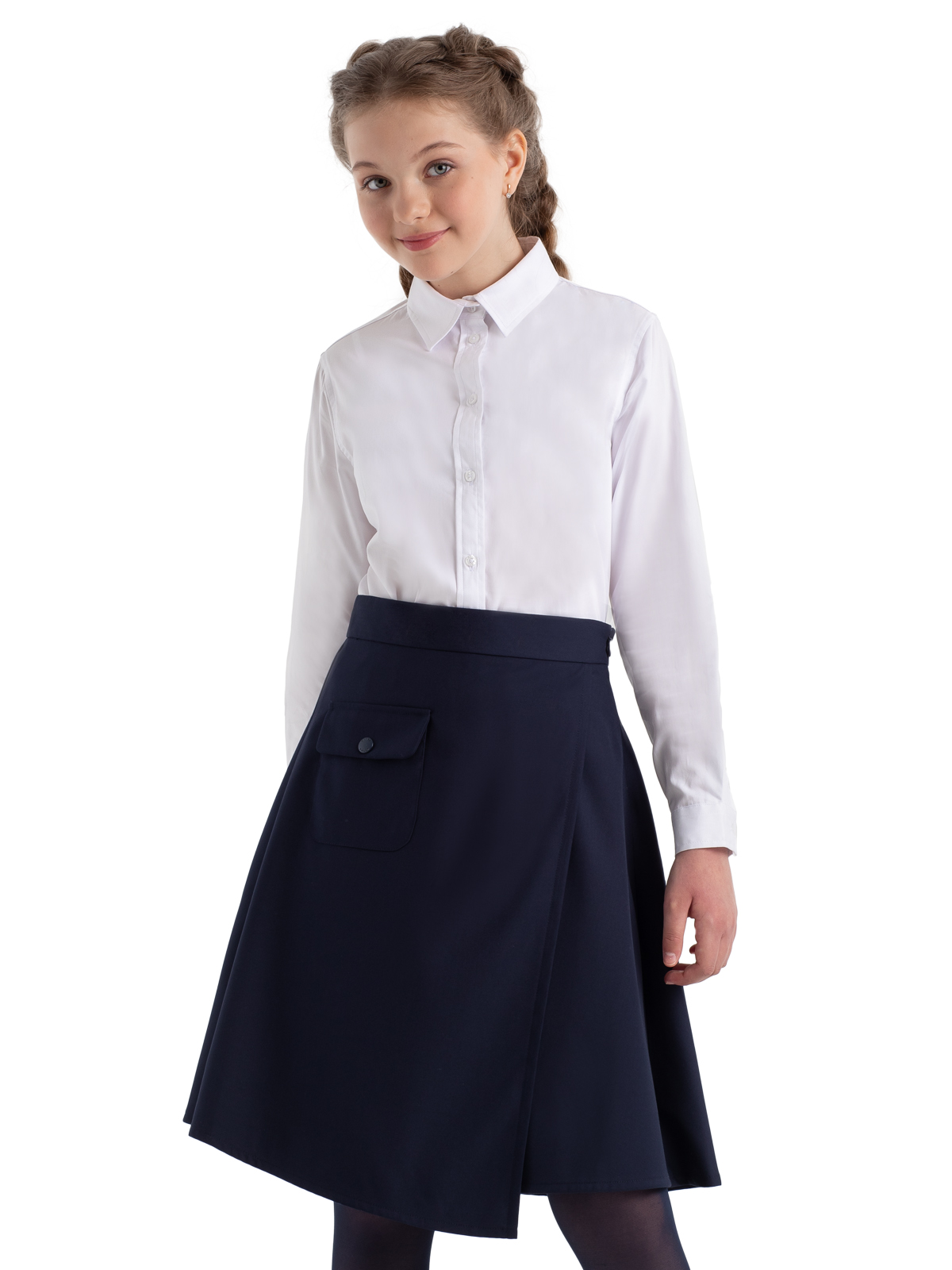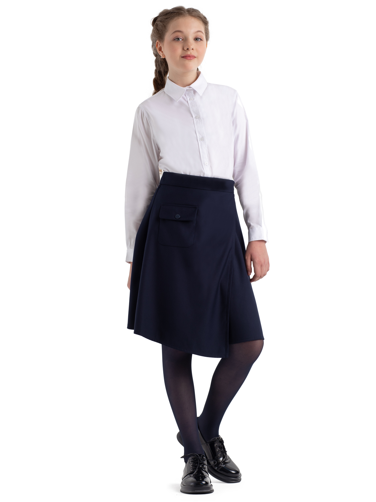 Школьная юбка темно-синего цвета с имитацией запаха выполнена из поливискозы. Юбка для школы ассиметричного силуэта имеет функциональный карман с клапаном по переду, принты по поясу спереди и сзади. Школьная юбка застегивается на боковую молнию, и имеет утяжку по талии за счет, вставленной внутрь резинки с перфорационными отверстиями. Поливискоза приятна к телу, ткань не скатывается, мало мнется, легка в уходе, сохраняет форму и цвет после многих стирок.