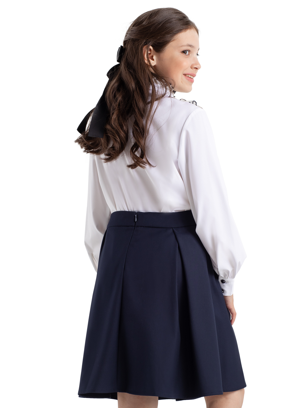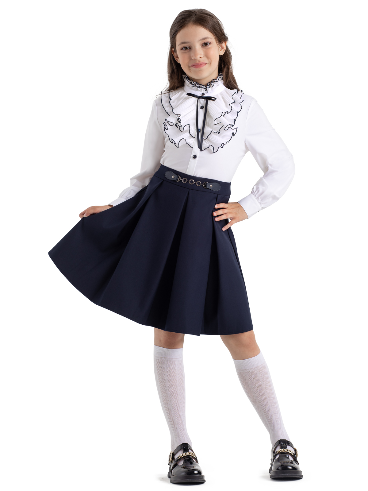 Классическая школьная юбка темно синего цвета выполнена из поливискозы. Поливискоза приятна к телу, ткань не скатывается, мало мнется, легка в уходе, сохраняет форму и цвет после многих стирок. Юбка для школы дополнена складками и декором на талии переда. Универсальный силуэт подойдет на любую фигуру. Школьная юбка имеет утяжку по талии за счет, вставленной внутрь резинки с перфорационными отверстиями.