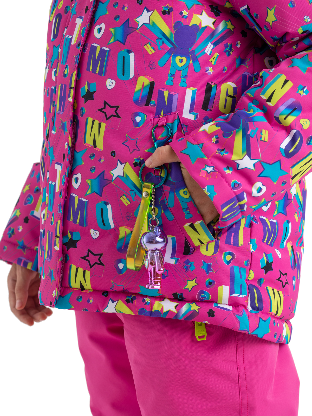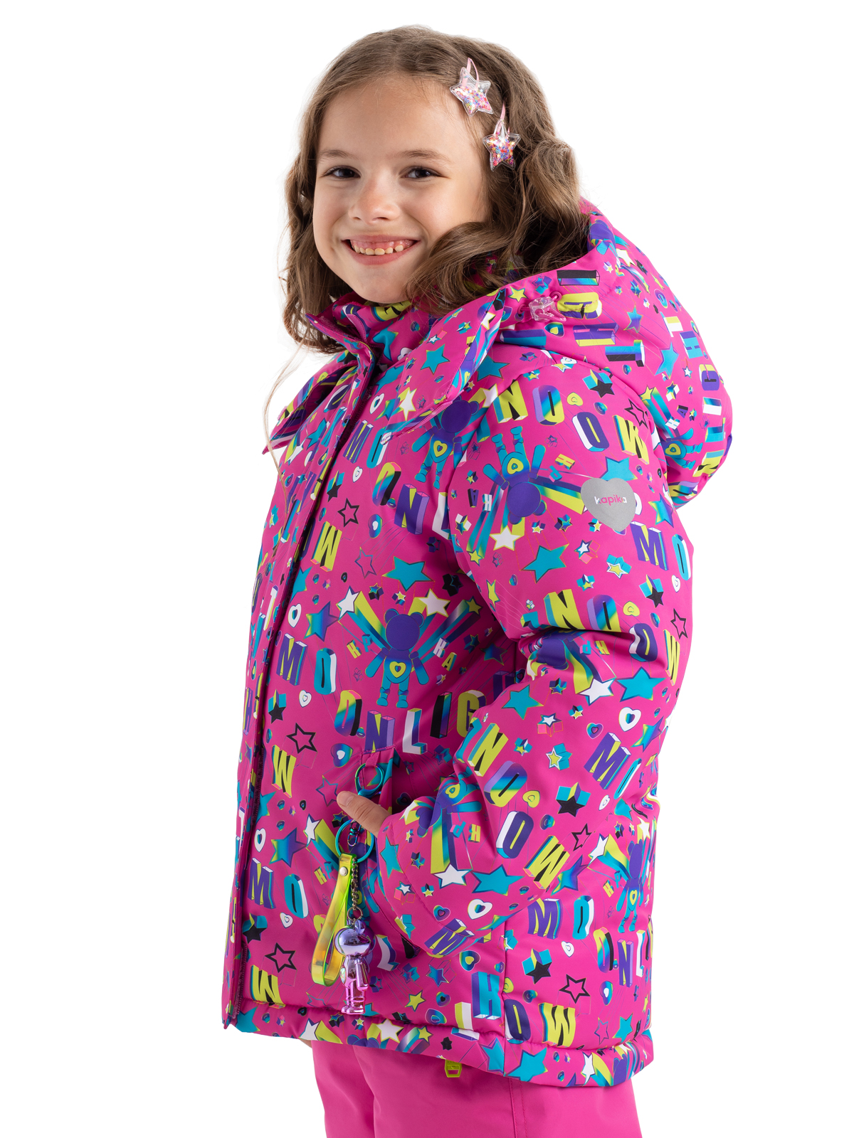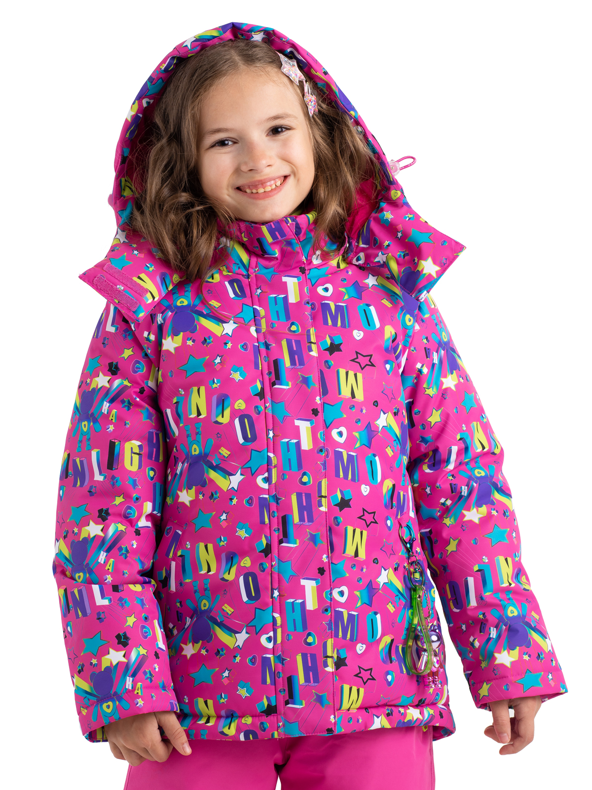 В этой зимней куртке ребенок будет не только защищен от всех зимних непогод, но и будет выглядеть ярко и стильно. Пуховик с яркими принтами изготовлен из влагозащитной, грязеотталкивающей, не продуваемой мембранной ткани 8000мм/5000г/м2/24ч, а утеплитель из искусственного пуха 350г/м2 не даст ребенку замерзнуть. Пуховик со съемным капюшоном, на регулируемой кулисе, имеет снежную «юбку», служащую для исключения попадания снега при падении или катания по глубокому снегу, а также – для защиты от ветра. Центральная молния закрыта ветрозащитной планкой, карманы на липучке. Куртка дополнена тематическими светоотражающими элементами на спинке и рукаве, защищающими в темное время суток, также имеется съемный брелок с милым мишкой. Манжеты из риба сохраняют тепло. Рефлективная подкладка с фольгированным принтом (OMNI-HEAT) эффективно удерживает тепло внутри.