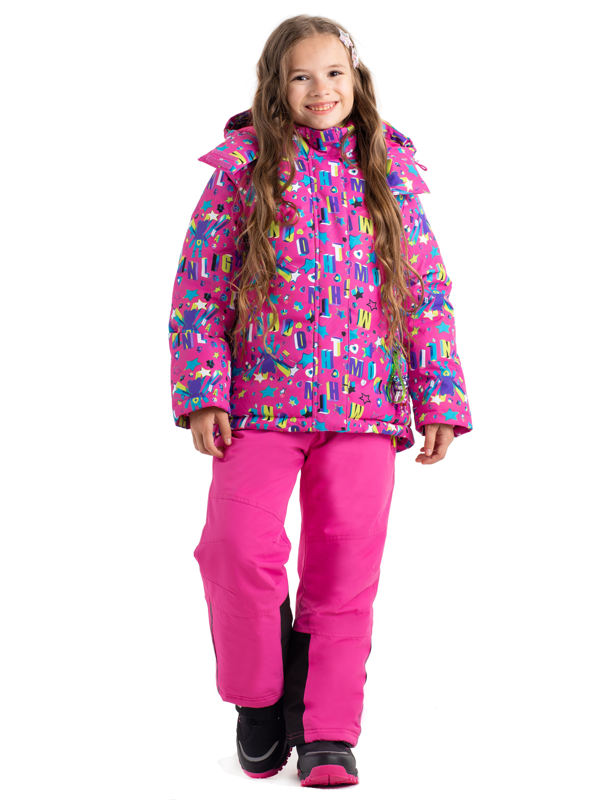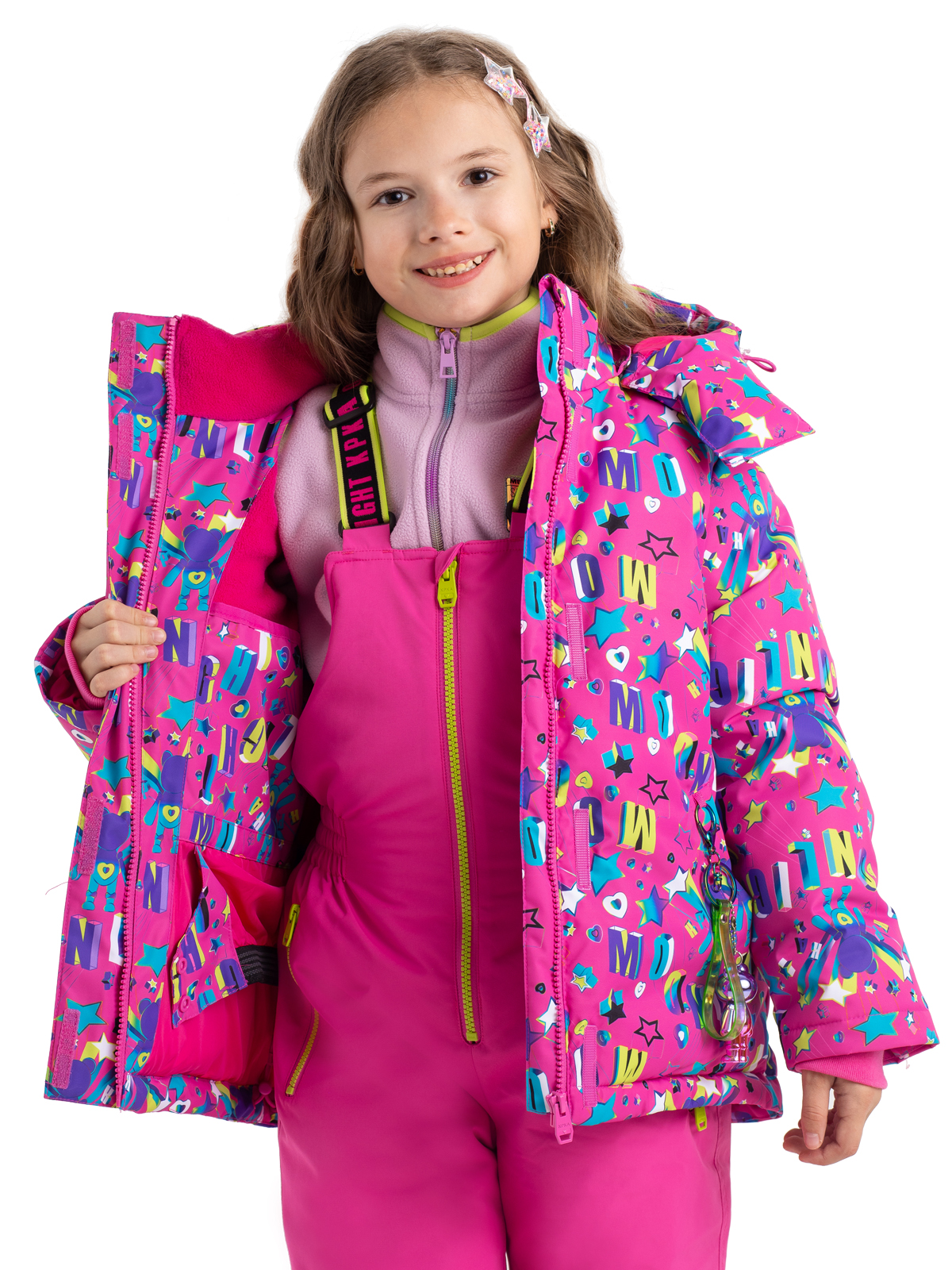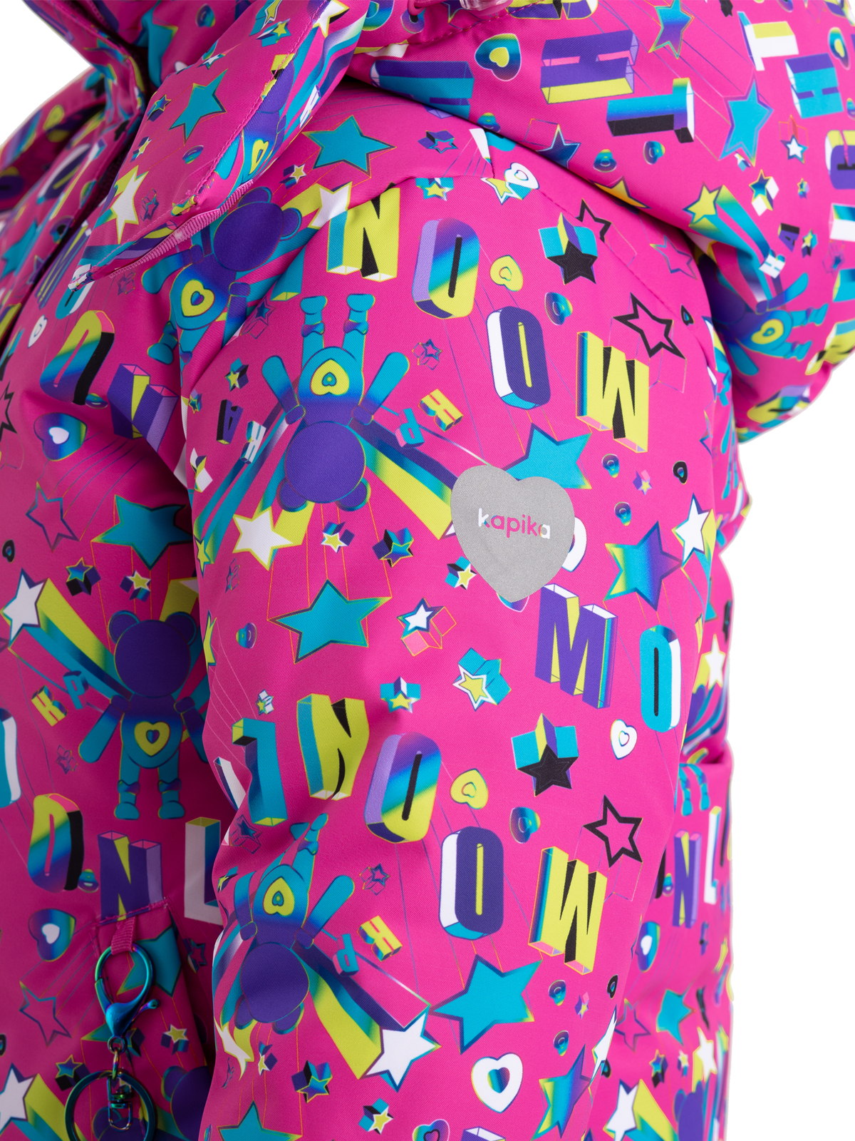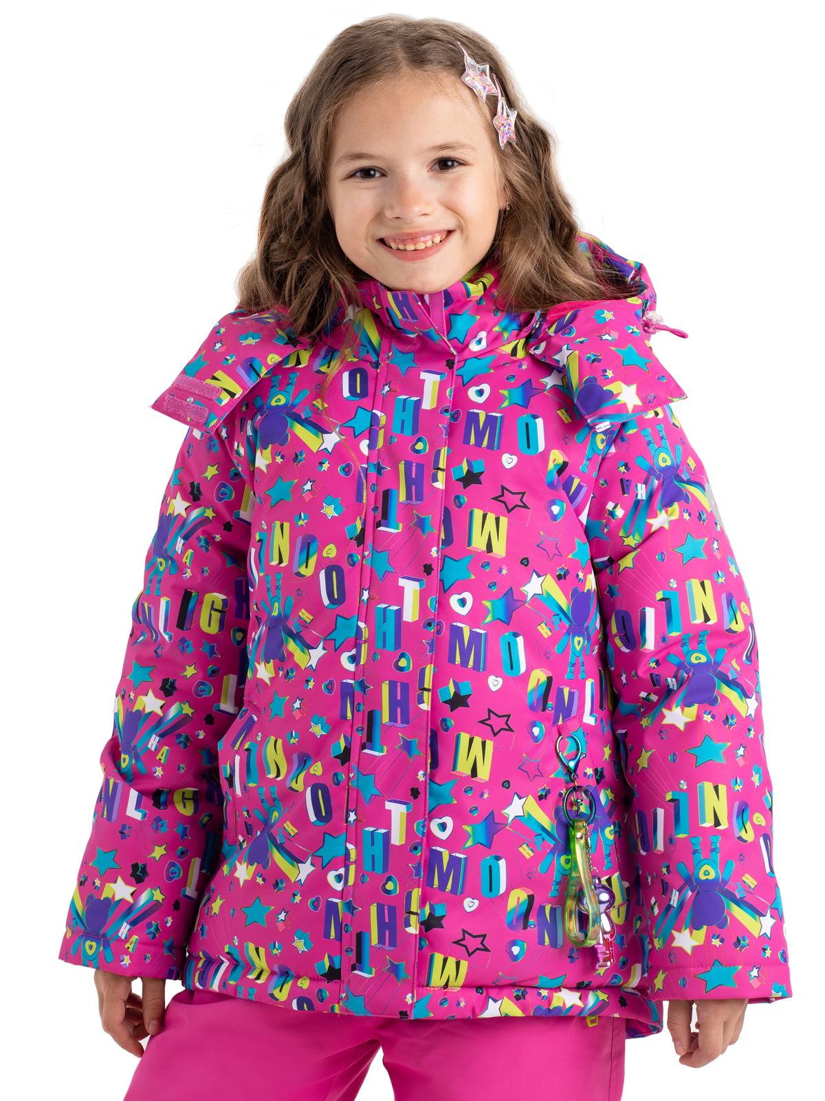 В этой зимней куртке ребенок будет не только защищен от всех зимних непогод, но и будет выглядеть ярко и стильно. Пуховик с яркими принтами изготовлен из влагозащитной, грязеотталкивающей, не продуваемой мембранной ткани 8000мм/5000г/м2/24ч, а утеплитель из искусственного пуха 350г/м2 не даст ребенку замерзнуть. Пуховик со съемным капюшоном, на регулируемой кулисе, имеет снежную «юбку», служащую для исключения попадания снега при падении или катания по глубокому снегу, а также – для защиты от ветра. Центральная молния закрыта ветрозащитной планкой, карманы на липучке. Куртка дополнена тематическими светоотражающими элементами на спинке и рукаве, защищающими в темное время суток, также имеется съемный брелок с милым мишкой. Манжеты из риба сохраняют тепло. Рефлективная подкладка с фольгированным принтом (OMNI-HEAT) эффективно удерживает тепло внутри.