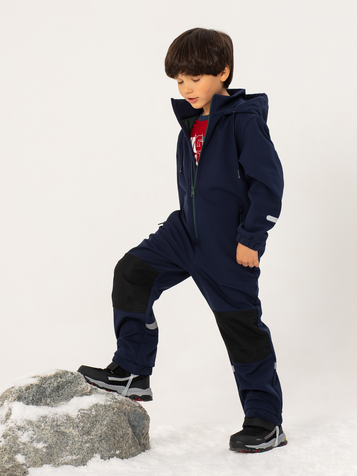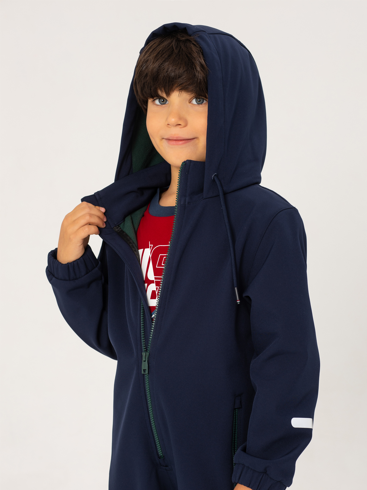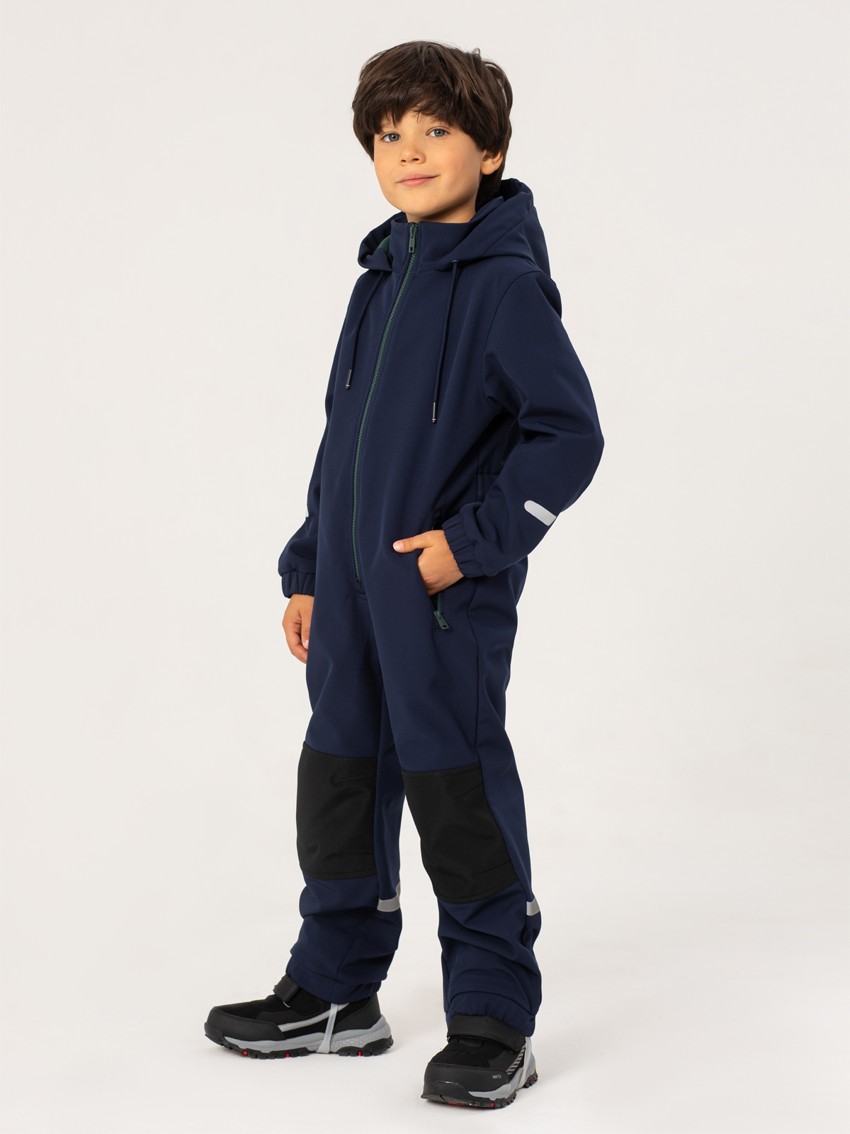 Демисезонный комбинезон для мальчиков выполнен из современного материала софтшелл с водонеппроницаемой мембраной 5000мм/5000г/м2/24ч в практичном тёмно-синем цвете. Удобная застёжка-молния обеспечивает лёгкое надевание, а регулируемый капюшон на кулиске надёжно защищает от ветра и осадков. Мягкая подкладка из микрофлиса создаёт дополнительный комфорт при носке. Модель оснащена светоотражающими элементами для безопасности ребёнка в тёмное время суток. Комбинезон отлично подходит для прогулок и активного отдыха в межсезонье, сочетая в себе практичность, комфорт и современный дизайн.