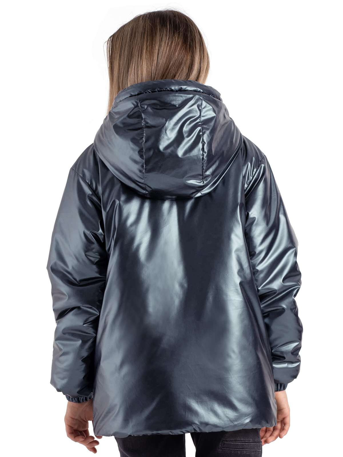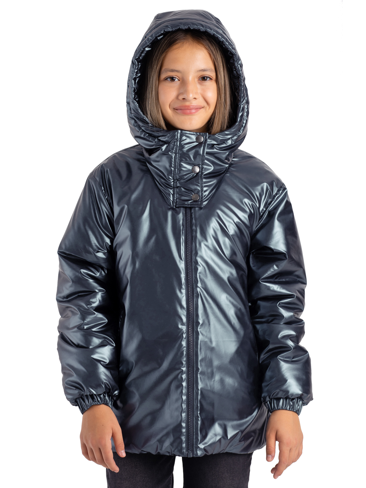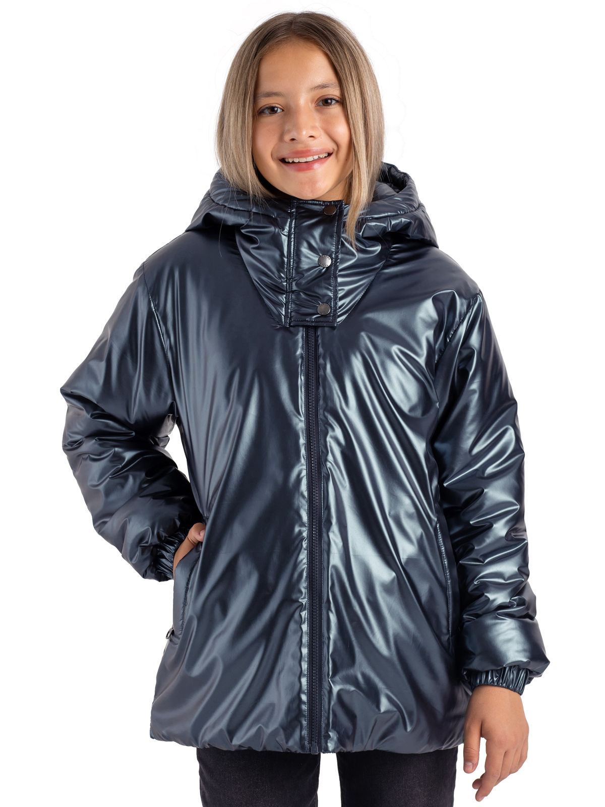 Утепленная демисезонная куртка для девочки подростка на синтепоне 260 г/м из немаркой ткани с блестящим финишем застегивается на молнию. Высокий ворот с ветрозащитной планкой на кнопках, манжеты на резинках призваны защитить от ветра. Функциональные карманы по бокам застегиваются на молнию. Цельный несъемный капюшон. Стильная, универсальная модель на каждый день.