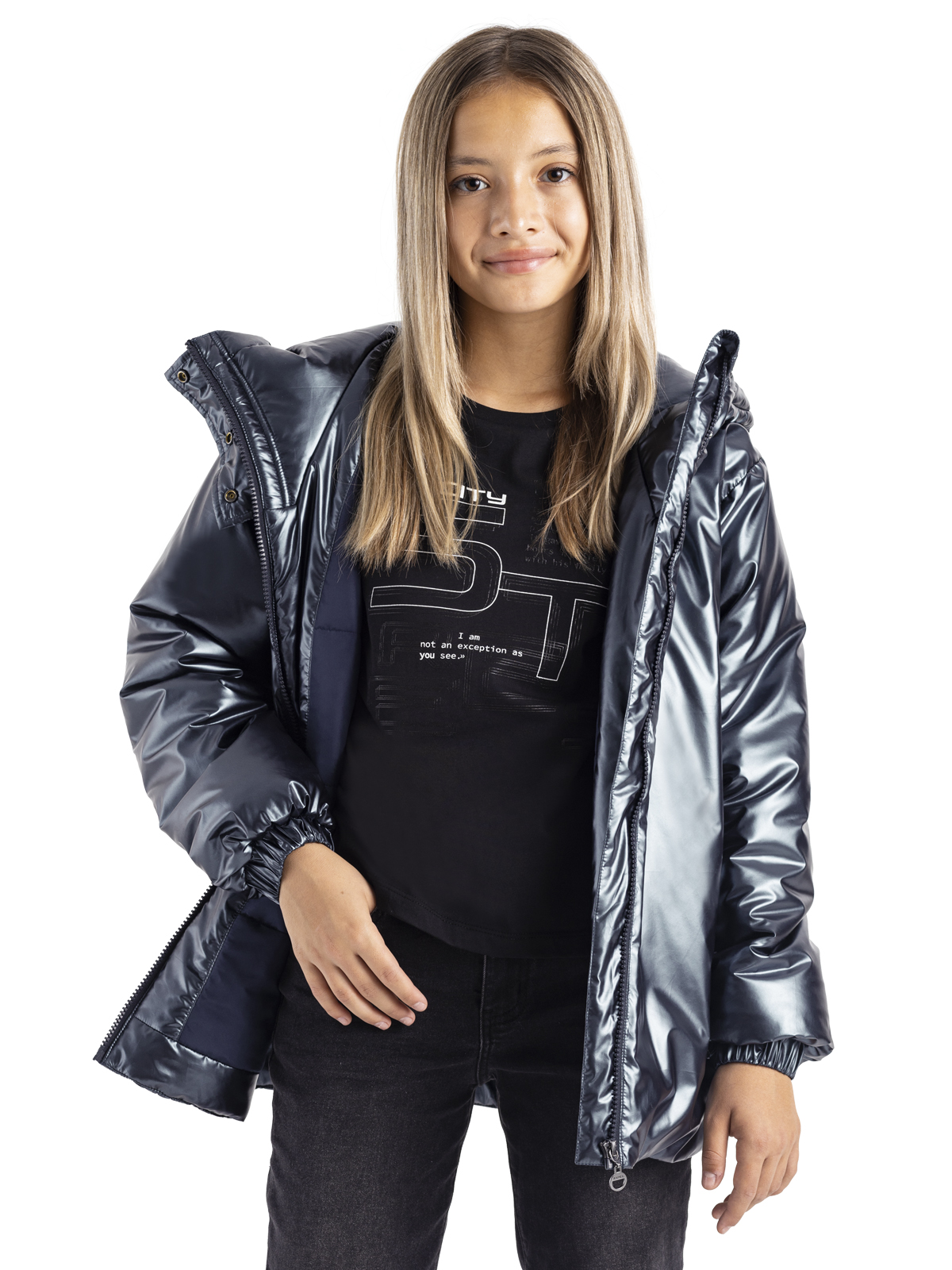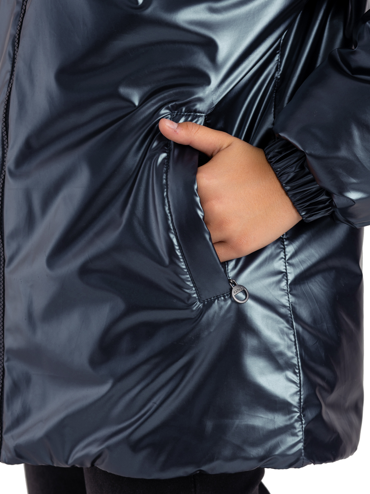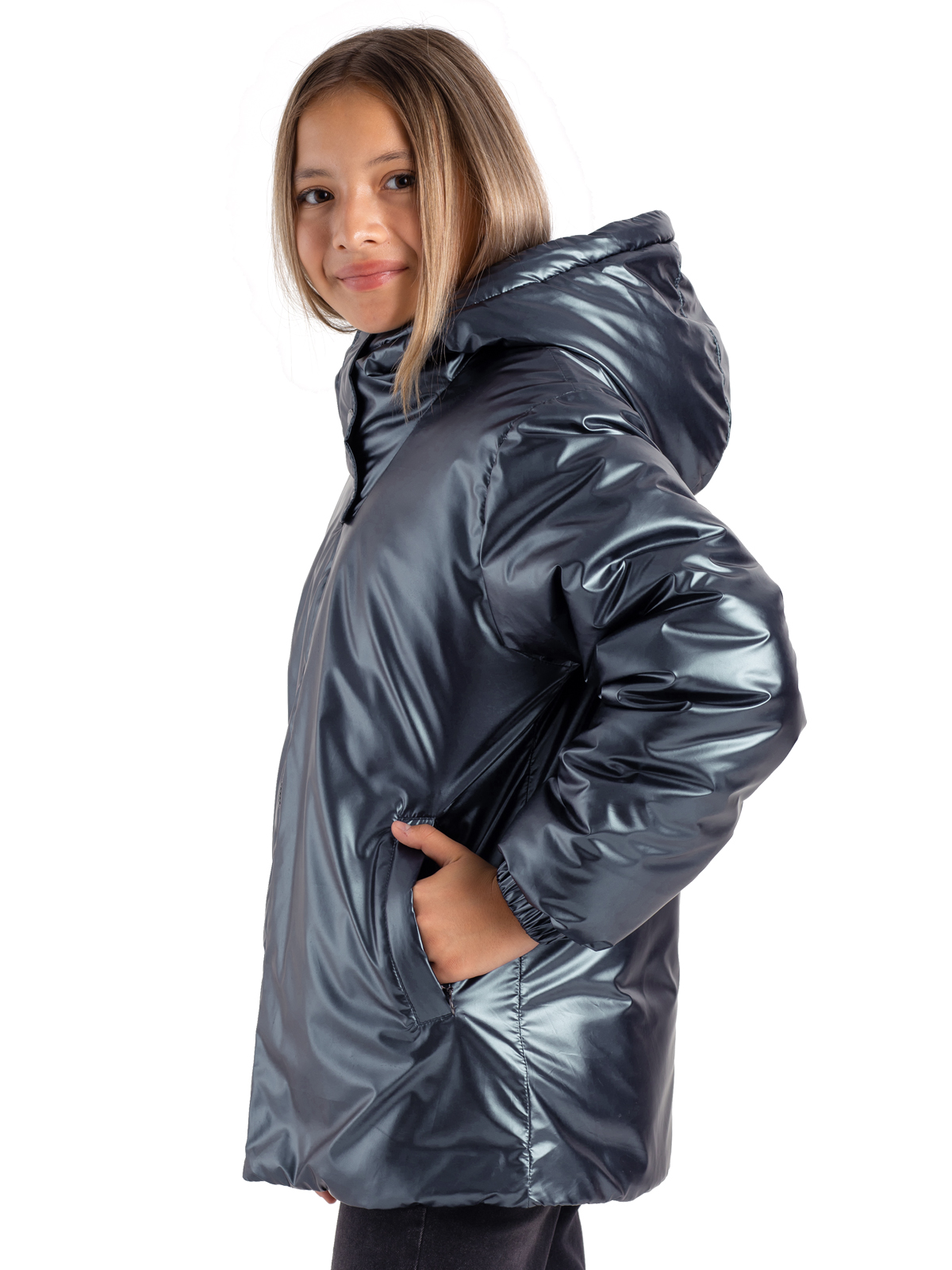 Утепленная демисезонная куртка для девочки подростка на синтепоне 260 г/м из немаркой ткани с блестящим финишем застегивается на молнию. Высокий ворот с ветрозащитной планкой на кнопках, манжеты на резинках призваны защитить от ветра. Функциональные карманы по бокам застегиваются на молнию. Цельный несъемный капюшон. Стильная, универсальная модель на каждый день.