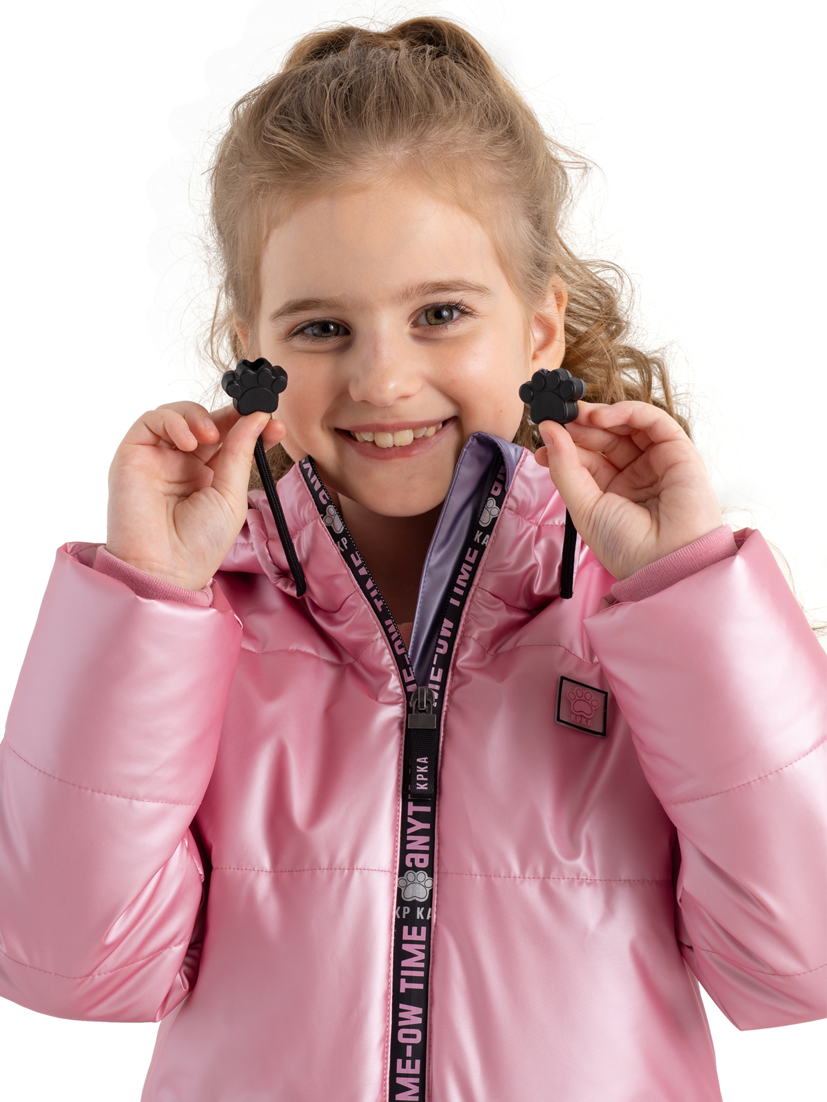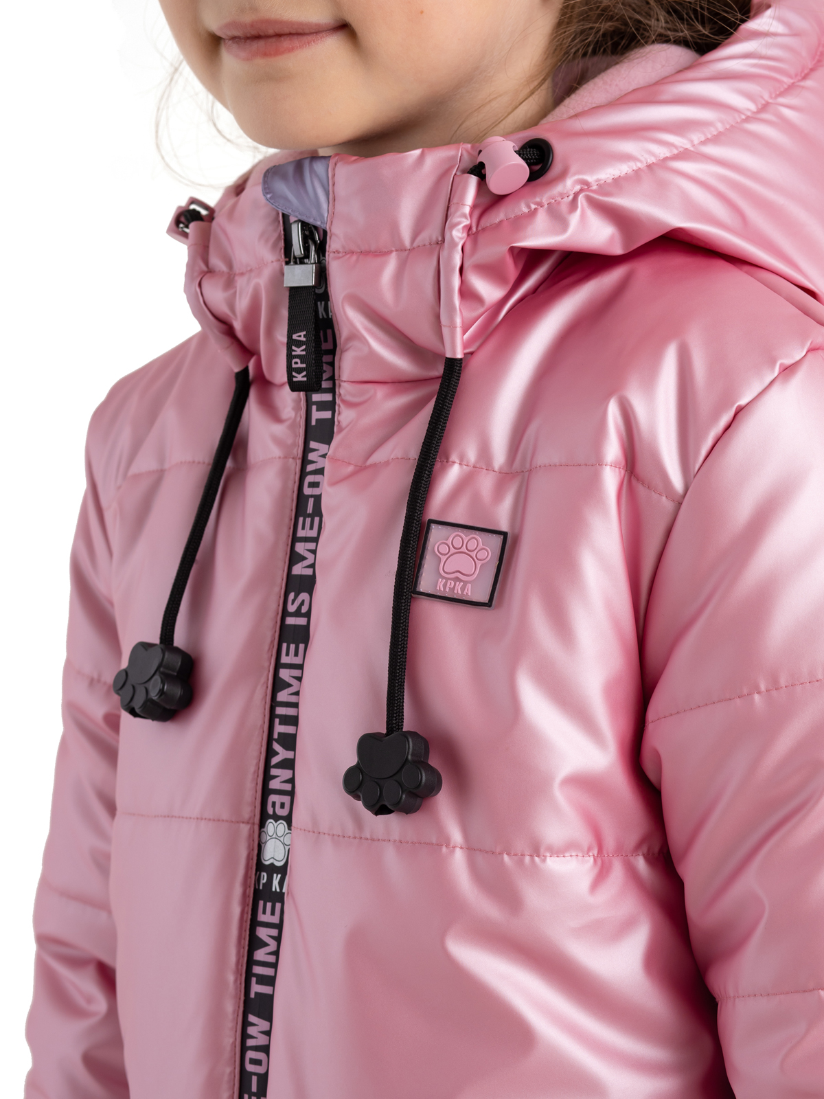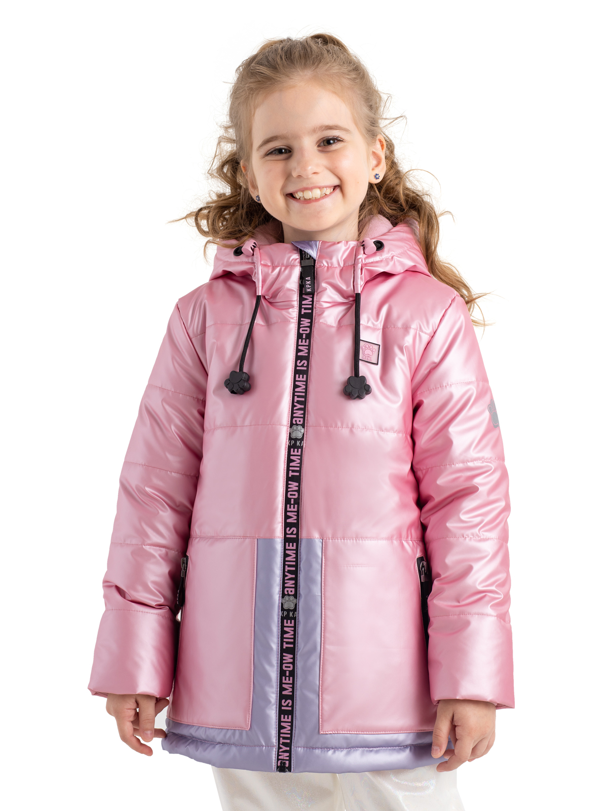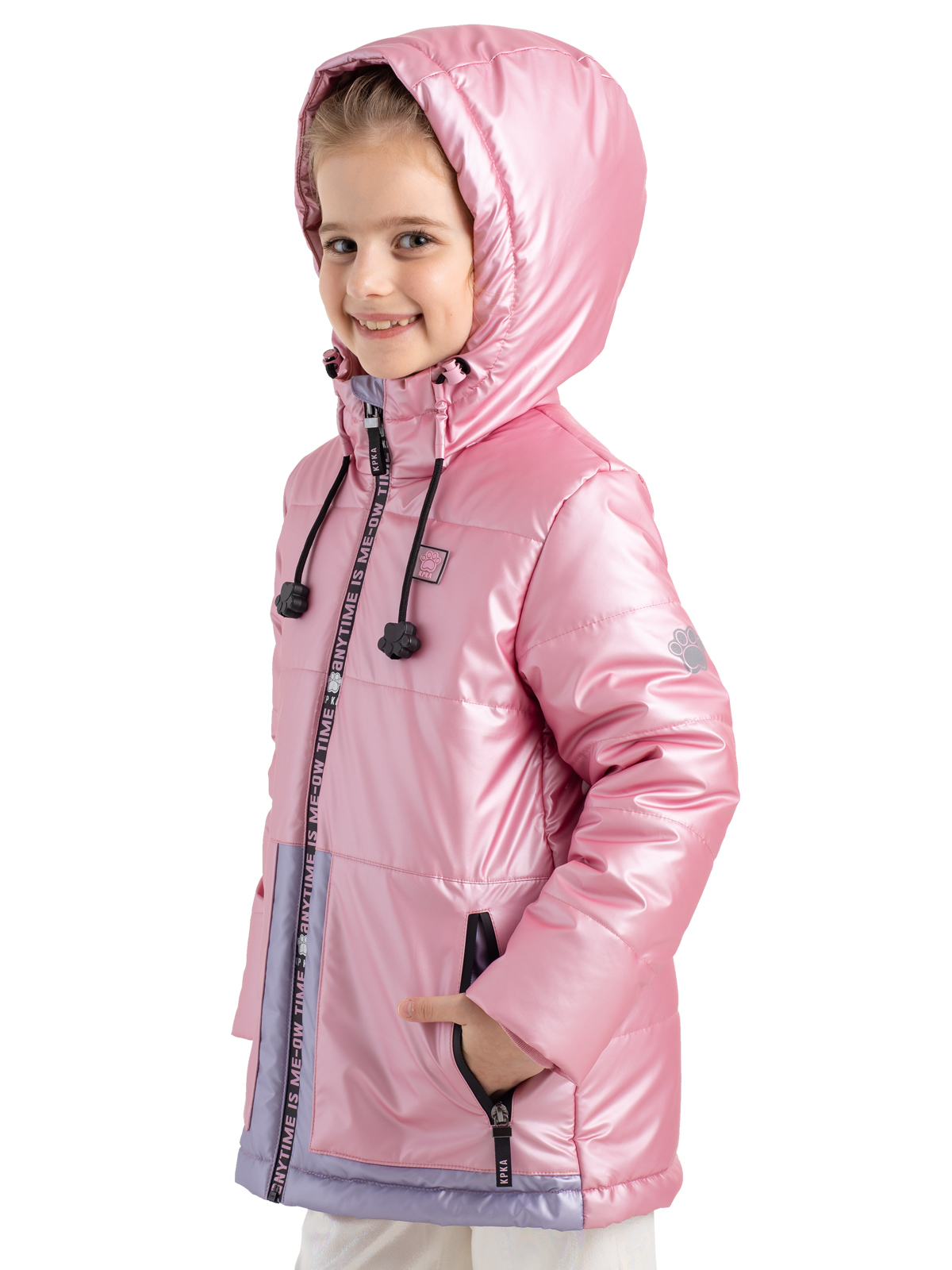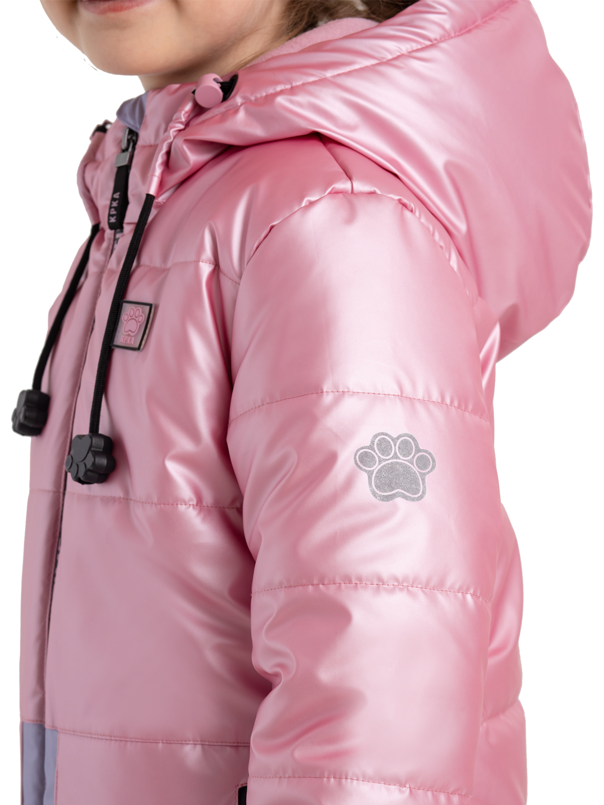 Демисезонная куртка розового цвета для девочки имеет несъемный капюшон на регулируемой кулисе с веселыми наконечниками-лапками на шнурках и высокий ворот. От холодов защитит утеплитель 240 г/м2, а рефлективная подкладка с фольгированным принтом (OMNI-HEAT) эффективно удерживает тепло внутри. Центральная ветрозащитная, непромокаемая молния на полочке украшена принтом, на функциональных карманах также установлены непромокаемые молнии. Яркий цвет привлекает внимание, а дизайнерские светоотражающие принты на спинке и рукаве защищают в темное время суток.