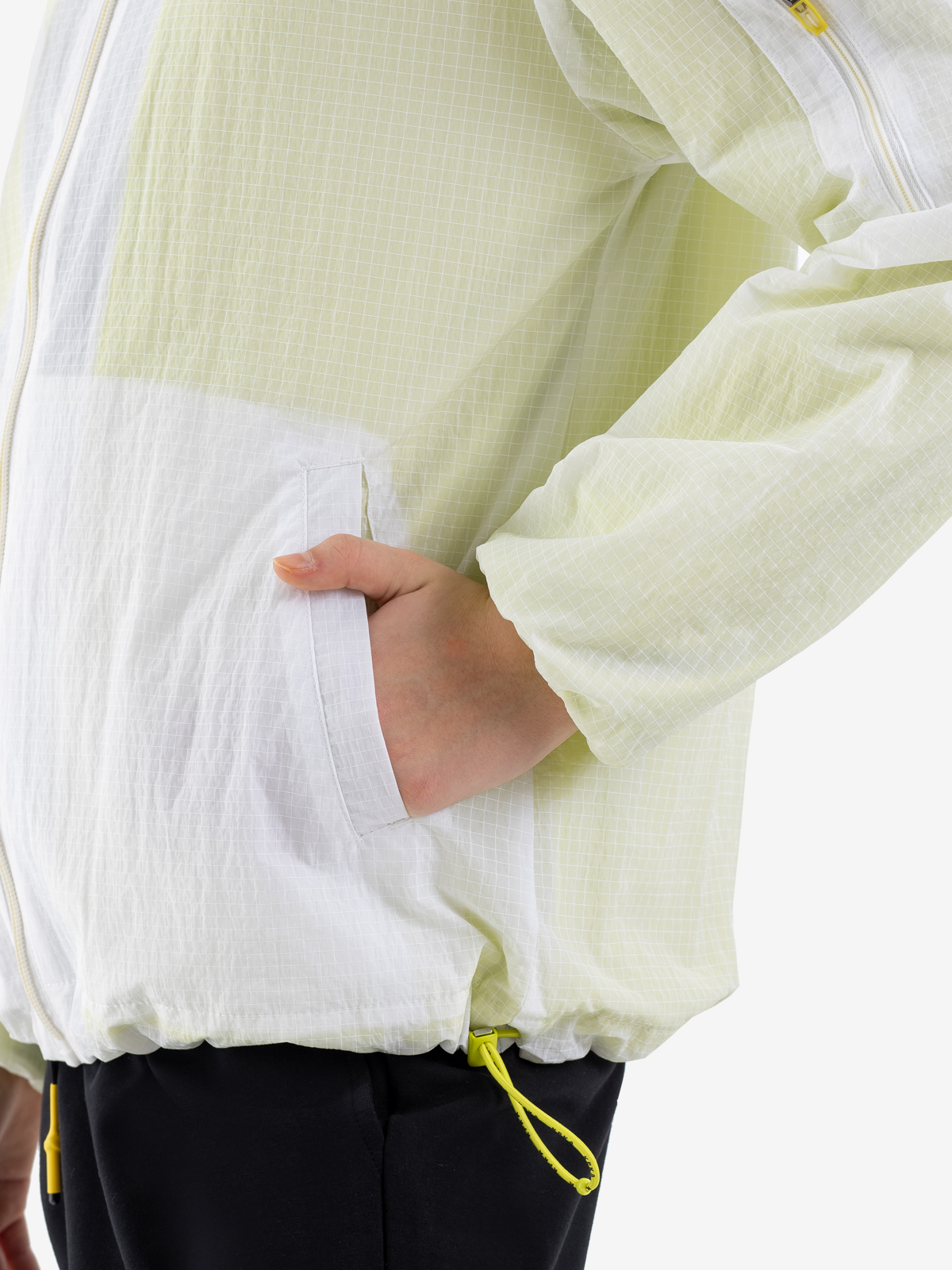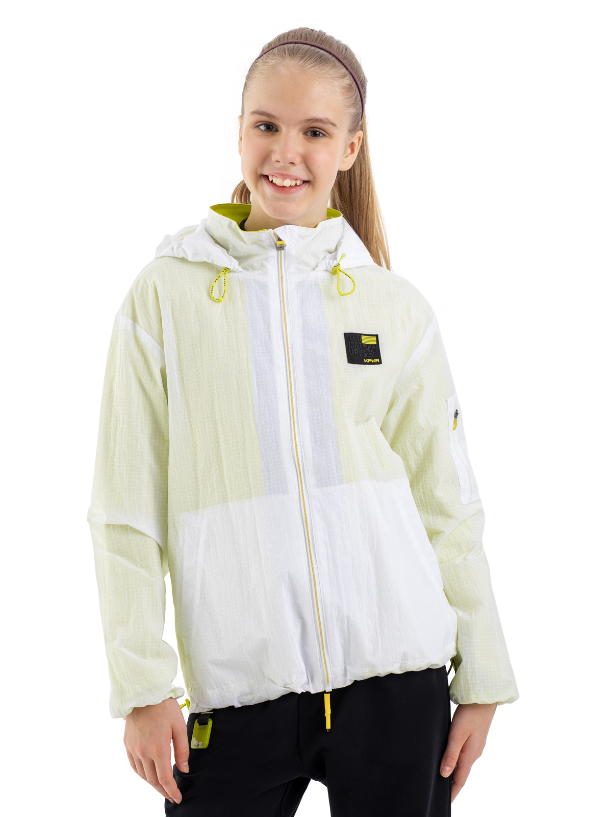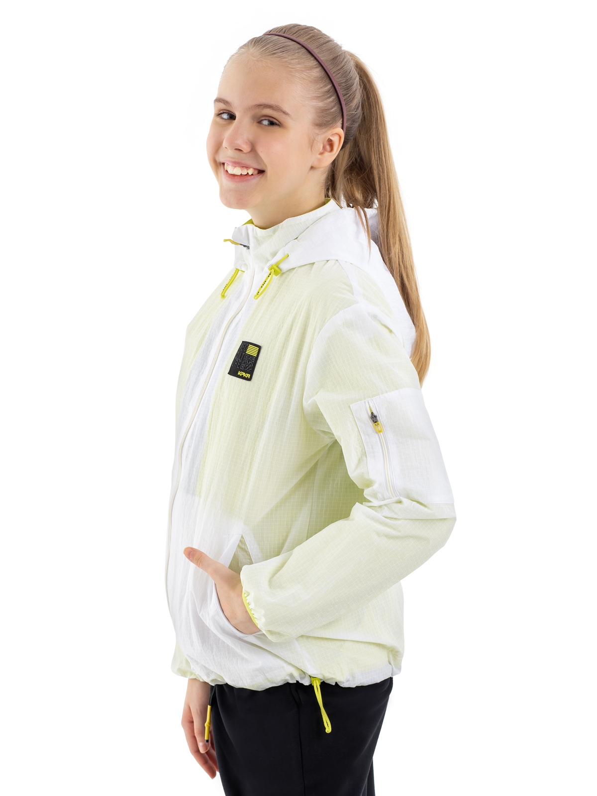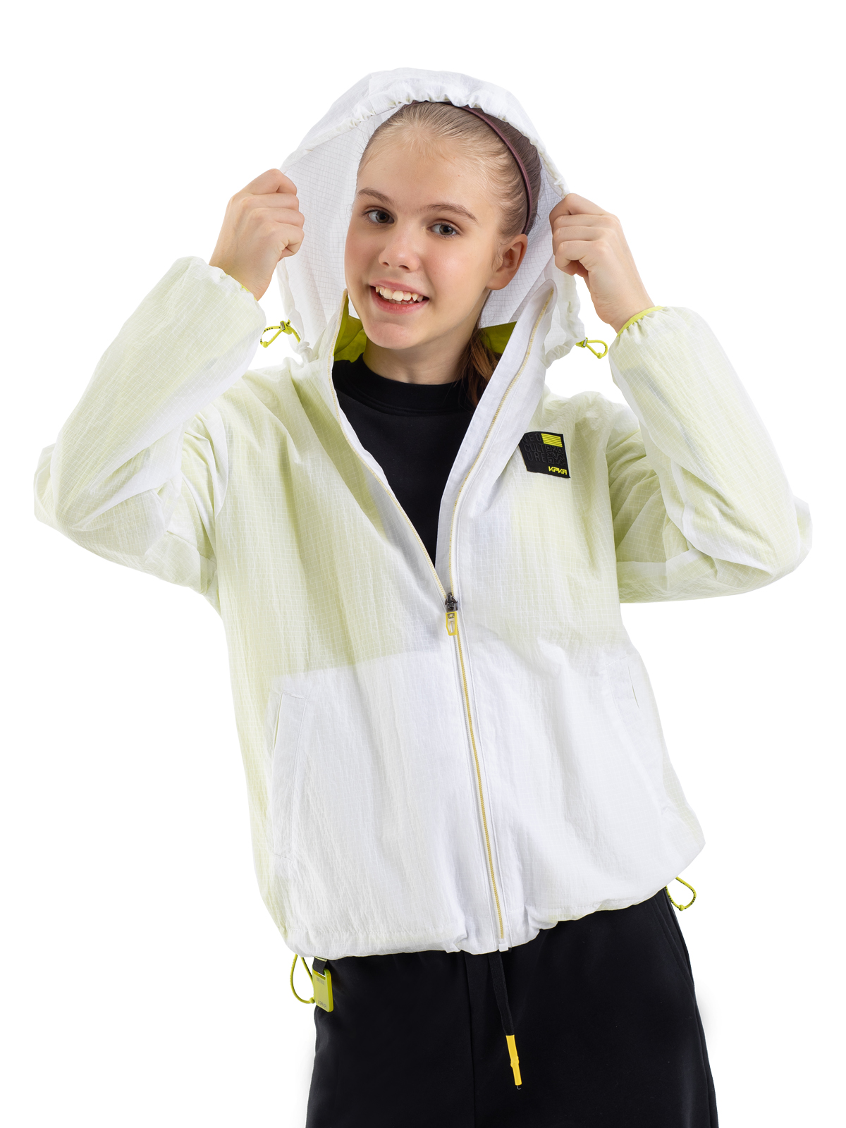 Лёгкая и воздушная куртка для девочки-подростка — идеальный выбор для межсезонья. Верх выполнен из белоснежной полупрозрачной ткани из 100% нейлона с водоотталкивающей пропиткой, что обеспечивает защиту от влаги и комфорт при носке. Особую изюминку модели придаёт яркая жёлтая подкладка из 100% хлопка, создающая контрастный и стильный образ. Практичная молния и два удобных прорезных кармана обеспечивают функциональность, а регулируемый капюшон и утяжка по низу изделия позволяют настроить посадку по фигуре. Дизайн дополняют стильные детали: вся фурнитура выполнена в ярком жёлтом цвете, а контрастный чёрный резиновый патч на груди придаёт модели современный акцент. Эта лёгкая куртка станет отличным выбором как для активного образа жизни, так и для повседневной носки.