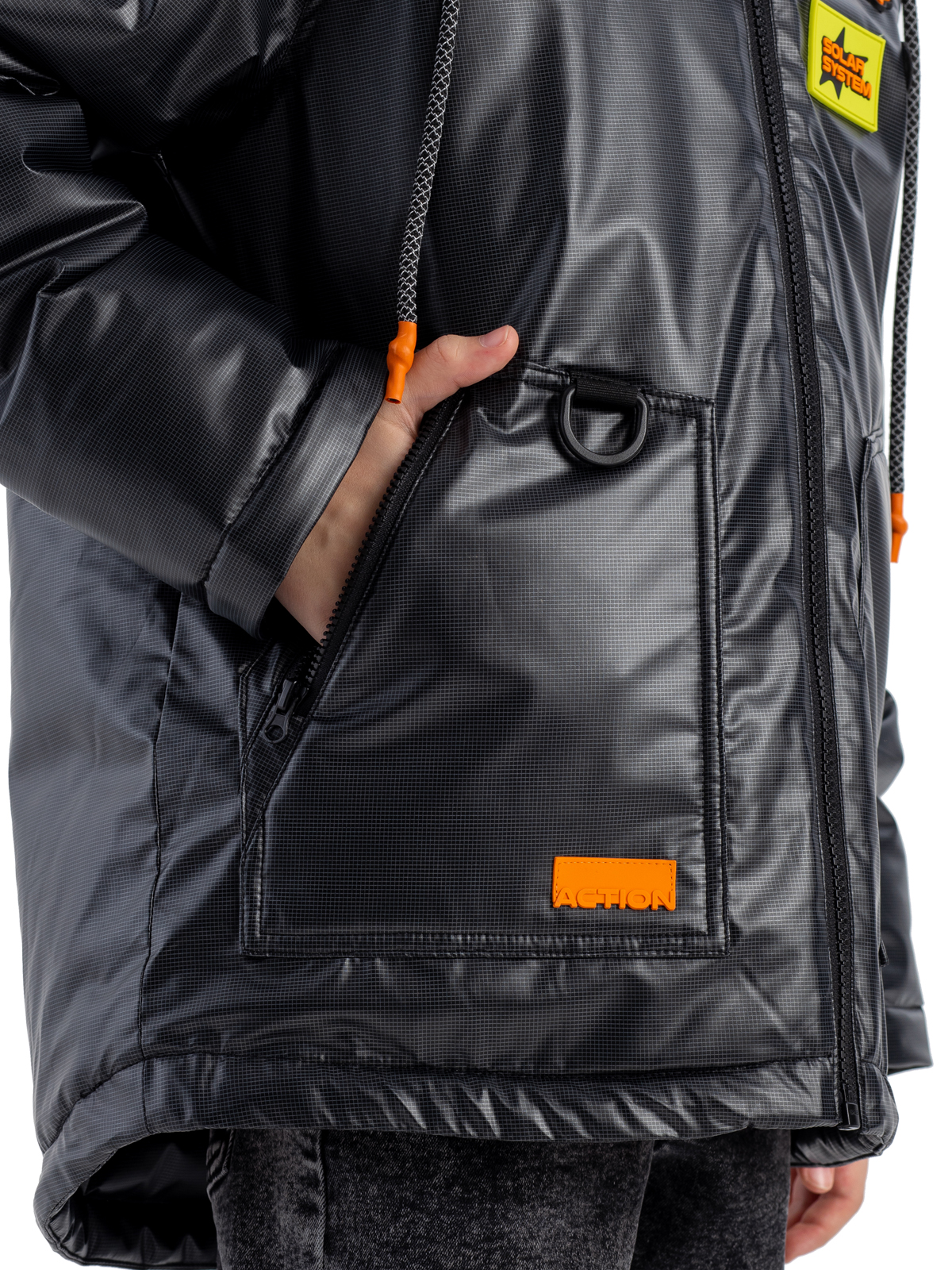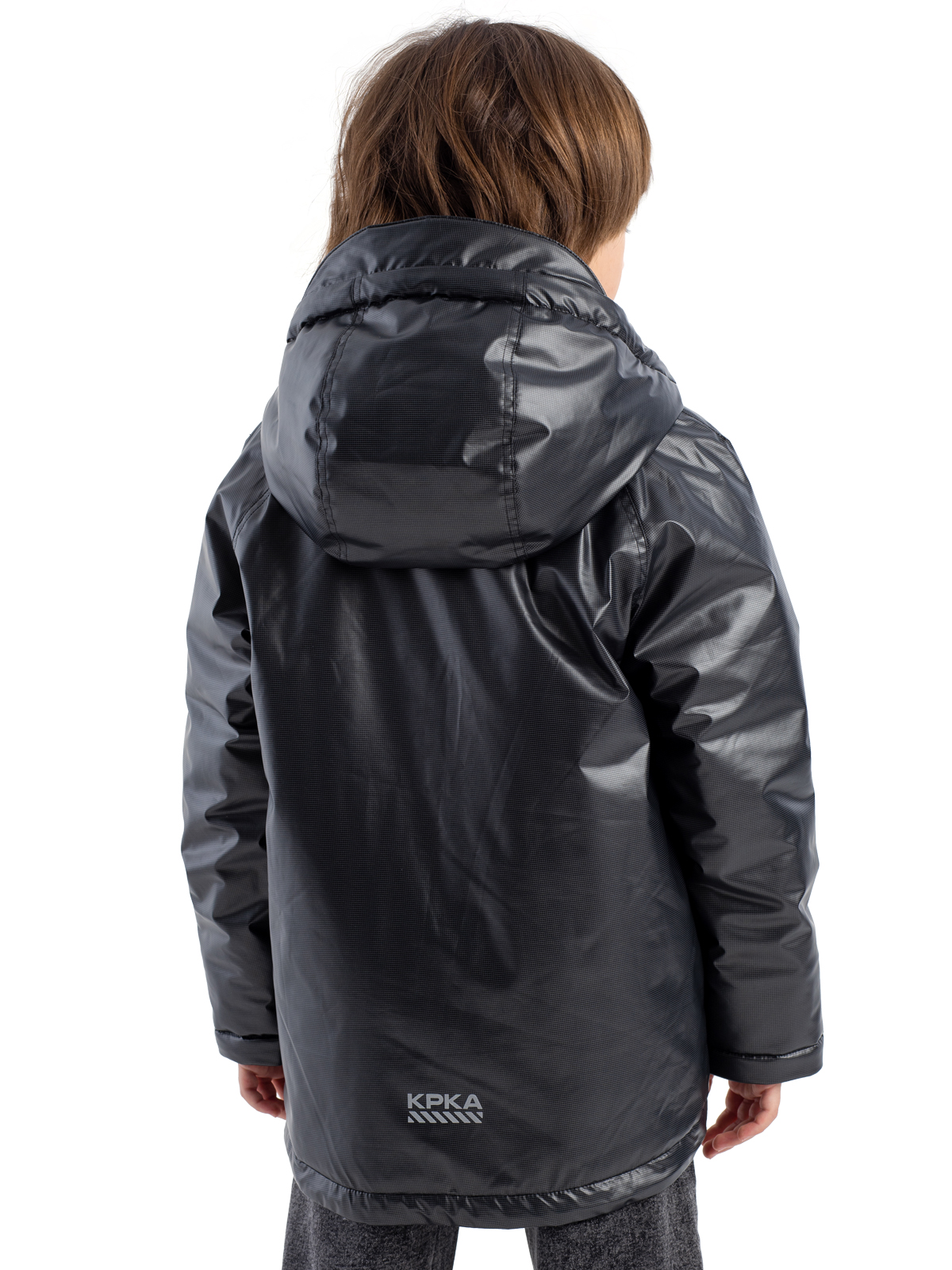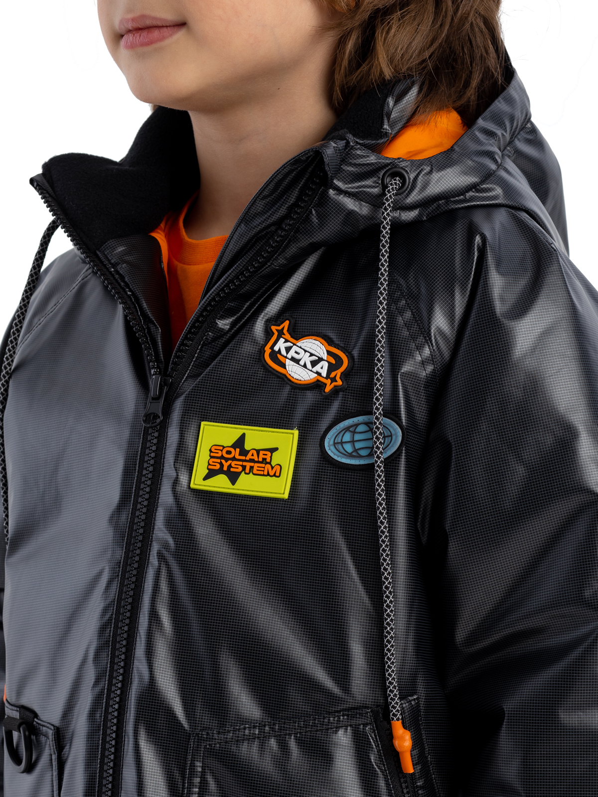 Классическая демисезонная куртка черного цвета имеет утеплитель 160г/м2. Куртка черного цвета с несъемным капюшоном на регулируемой кулисе со светоотражающими шнурками дополнена контрастной подкладкой, шрифтовым принтом и силиконовыми патчами. Фигурный светоотражающий принт на спинке изделия защищает в темное время суток.