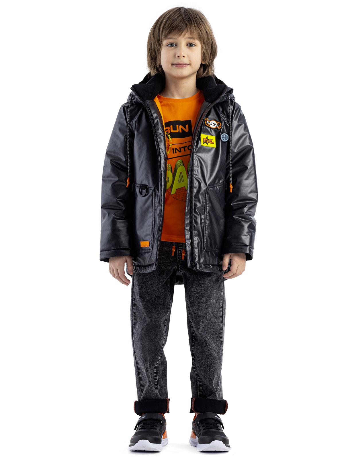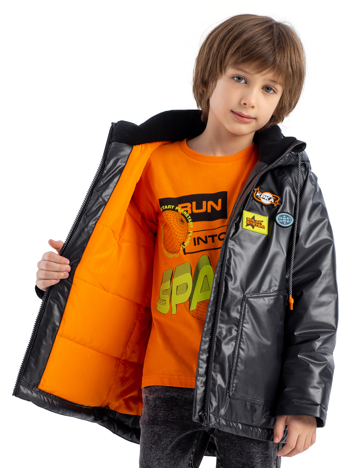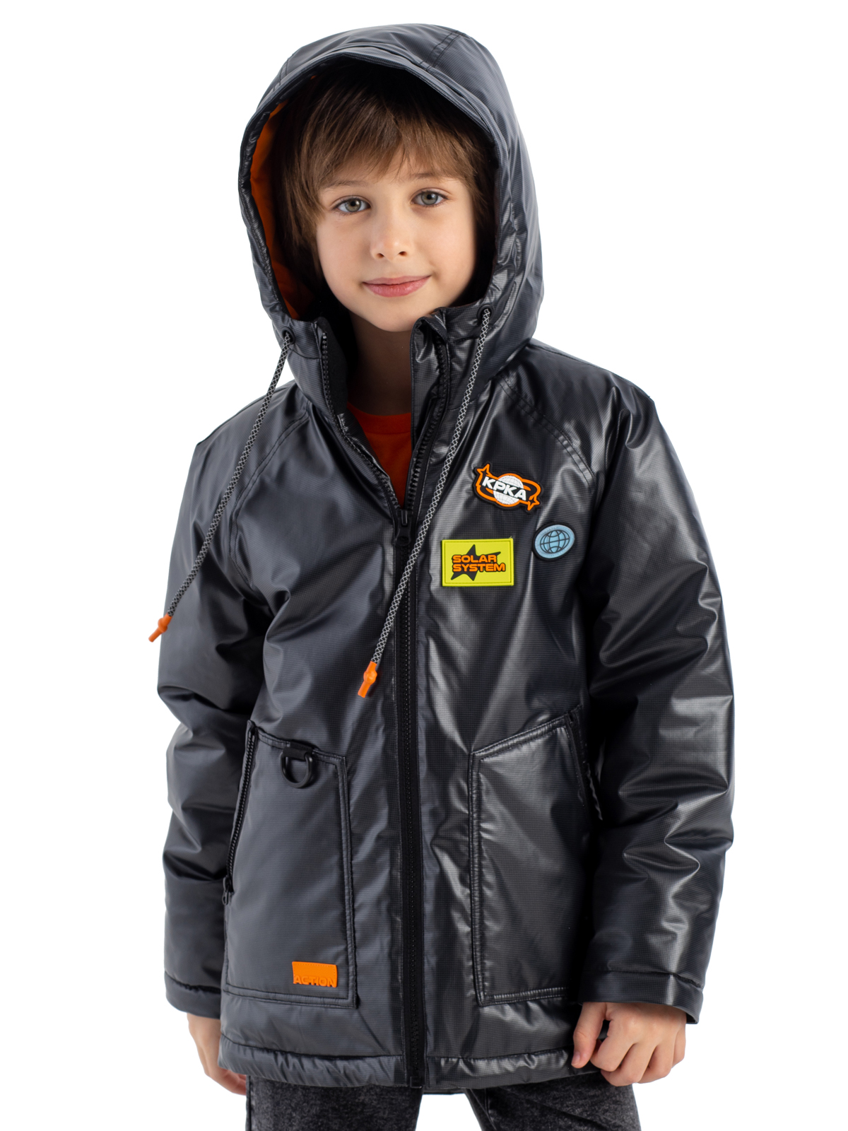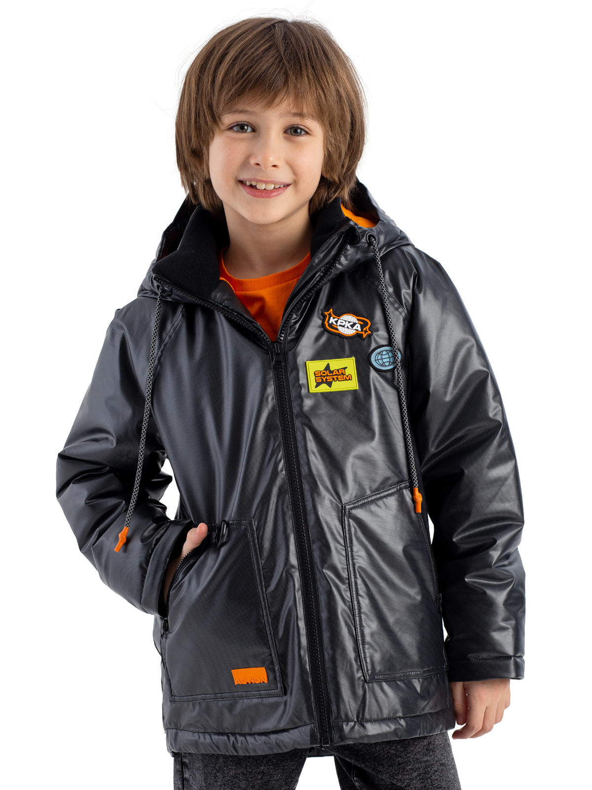 Классическая демисезонная куртка черного цвета имеет утеплитель 160г/м2. Куртка черного цвета с несъемным капюшоном на регулируемой кулисе со светоотражающими шнурками дополнена контрастной подкладкой, шрифтовым принтом и силиконовыми патчами. Фигурный светоотражающий принт на спинке изделия защищает в темное время суток.