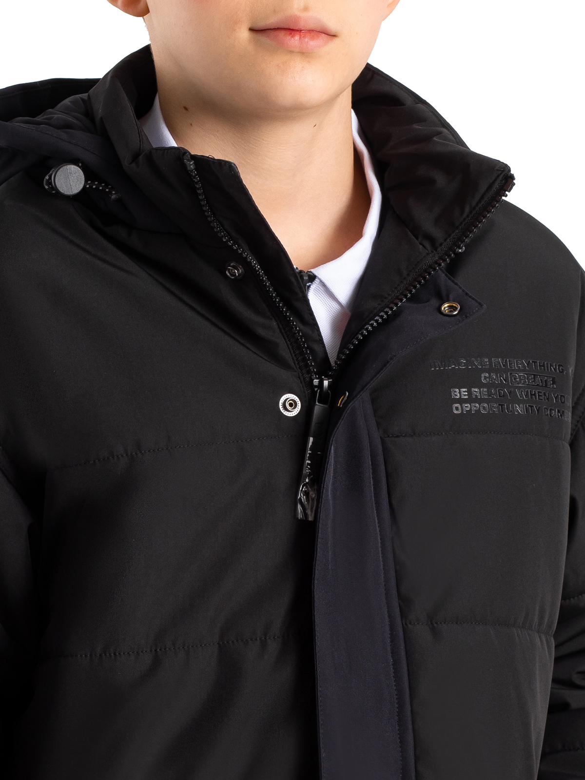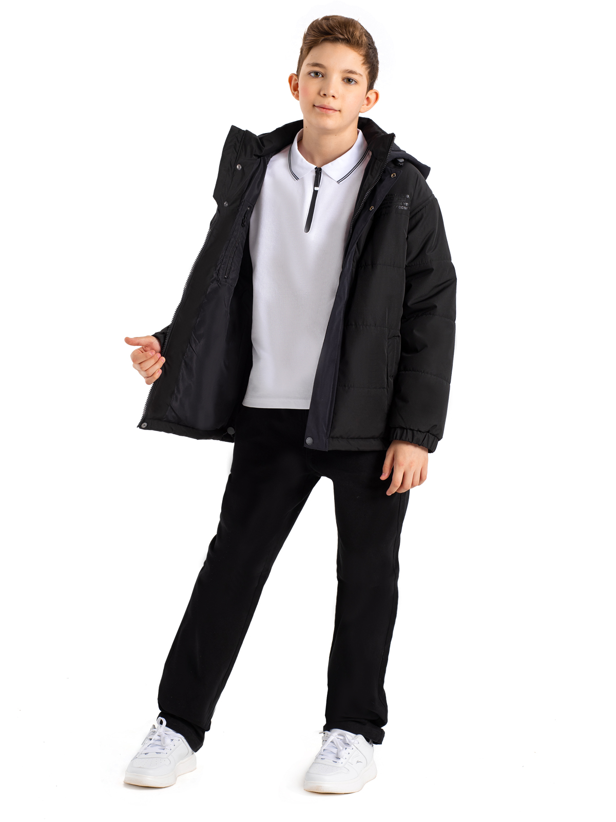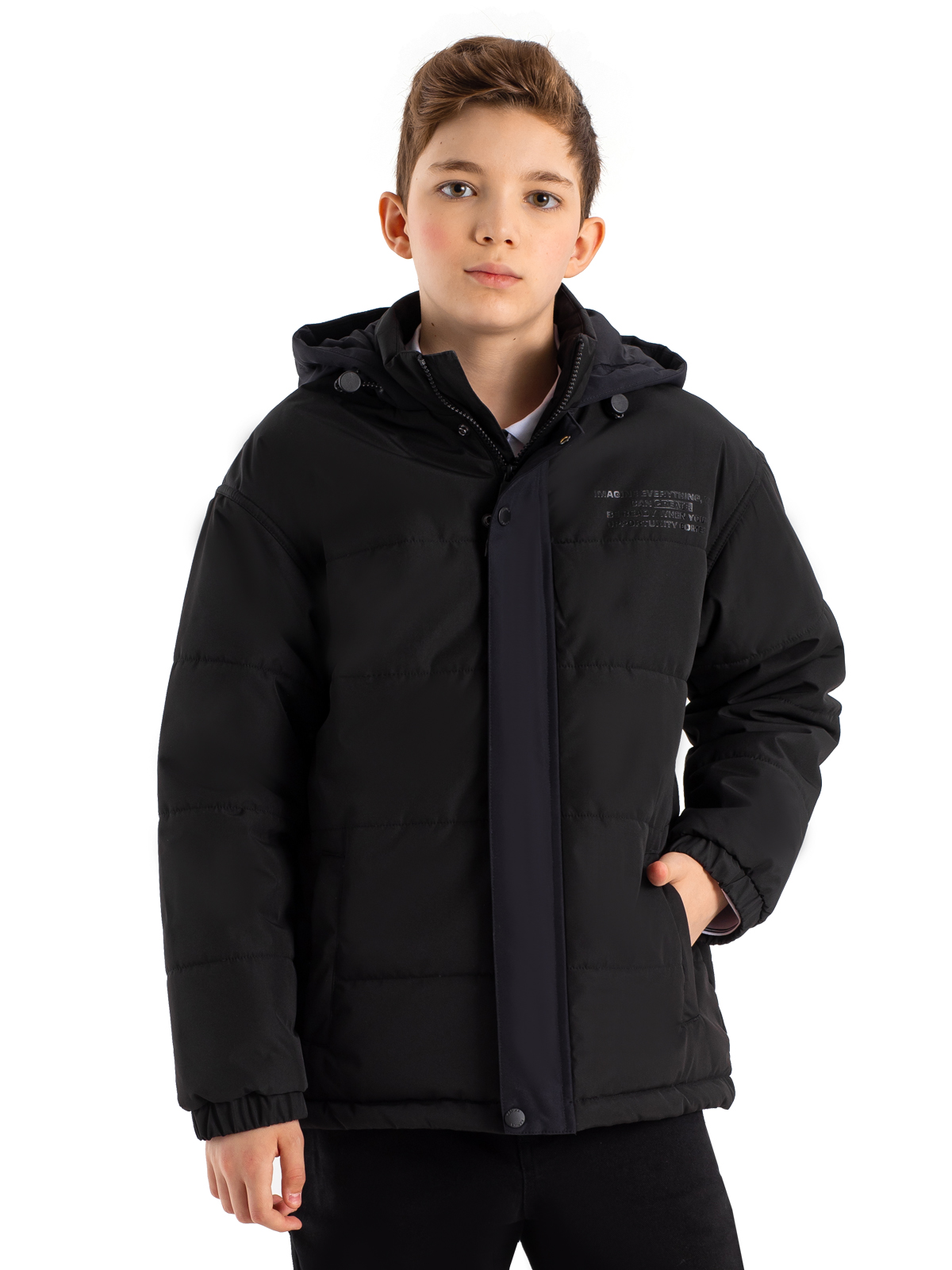 Демисезонная школьная куртка для мальчика-подростка классического черного цвета изготовлена из влагозащитной, грязеотталкивающей, не продуваемой мембранной ткани 5000мм/5000г/м2/24ч, имеет утеплитель 160г/м2. Капюшон несъемный, по краю капюшона регулируемая кулиса, также есть регулировка по низу изделия, для защиты от ветра. Куртка дополнена принтом в тон изделия,брендовой фурнитурой. Центральная молния закрыта ветрозащитной планкой на кнопках. Функциональности добавляют 3 кармана, включая один внутренний закрывающийся на молнию. Модель имеет светоотражающий элемент на спине, для защиты в темное время суток.