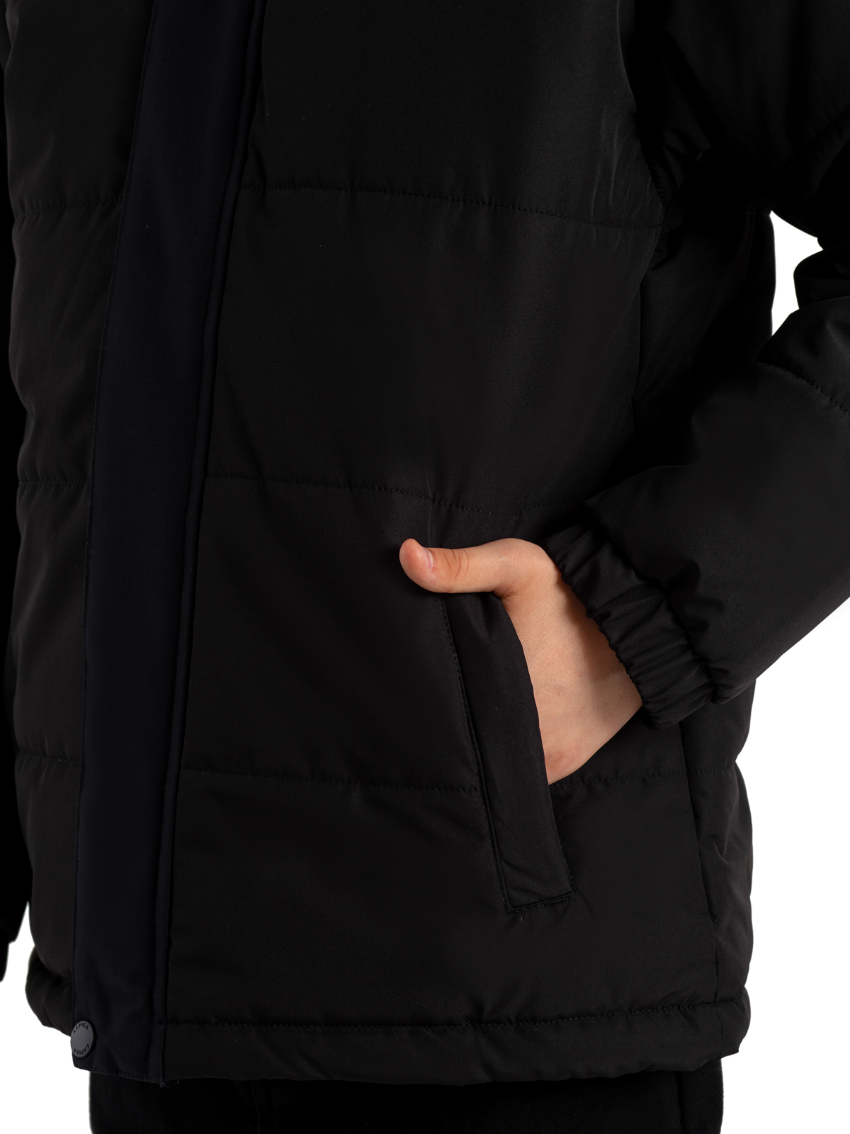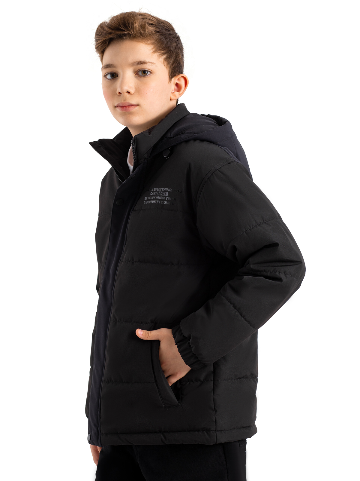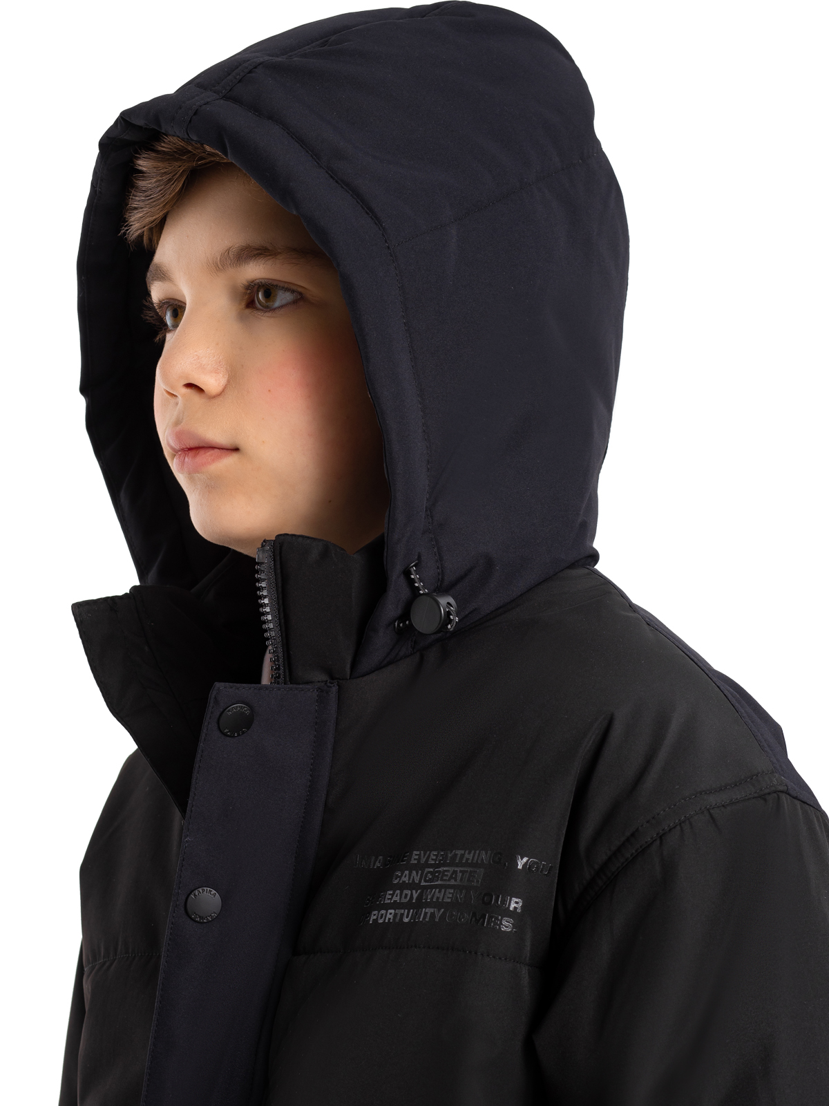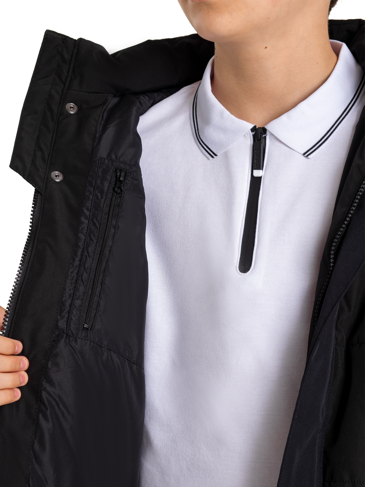 Демисезонная школьная куртка для мальчика-подростка классического черного цвета изготовлена из влагозащитной, грязеотталкивающей, не продуваемой мембранной ткани 5000мм/5000г/м2/24ч, имеет утеплитель 160г/м2. Капюшон несъемный, по краю капюшона регулируемая кулиса, также есть регулировка по низу изделия, для защиты от ветра. Куртка дополнена принтом в тон изделия,брендовой фурнитурой. Центральная молния закрыта ветрозащитной планкой на кнопках. Функциональности добавляют 3 кармана, включая один внутренний закрывающийся на молнию. Модель имеет светоотражающий элемент на спине, для защиты в темное время суток.