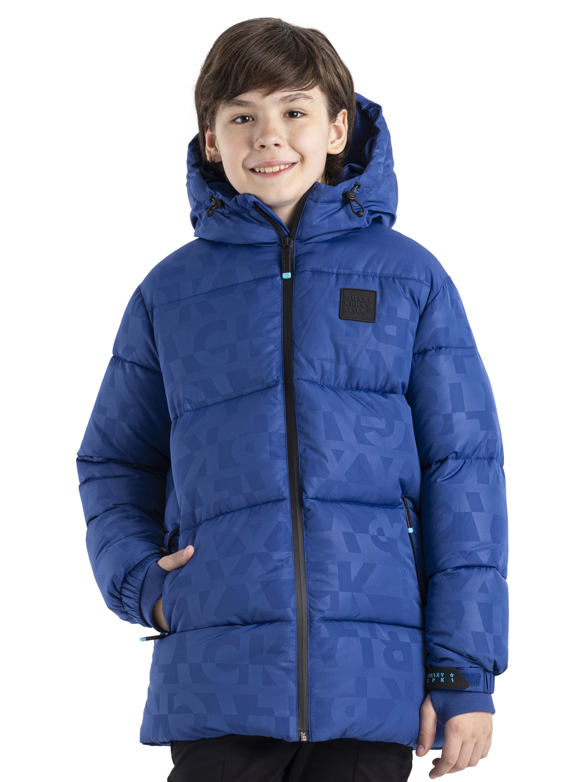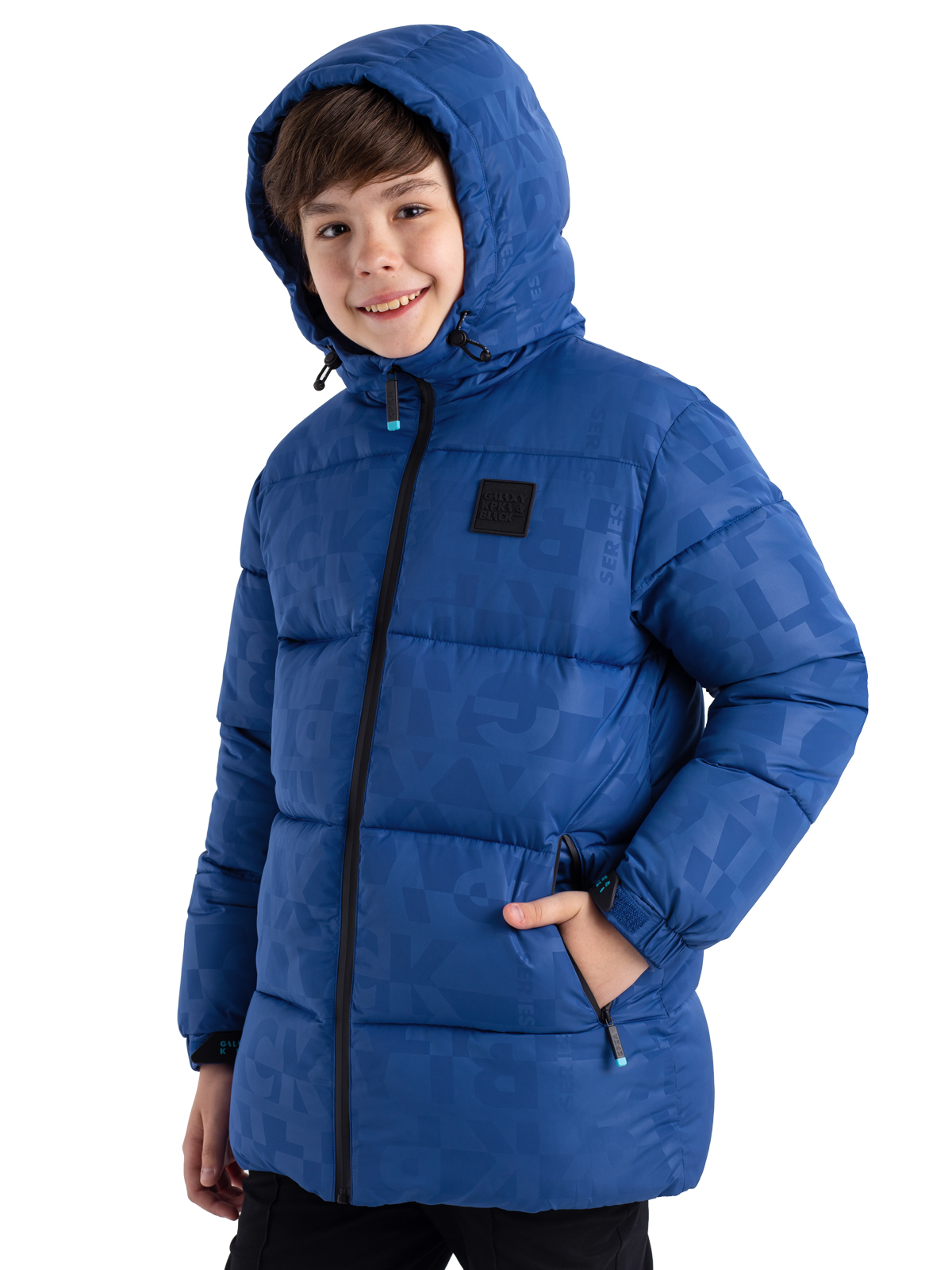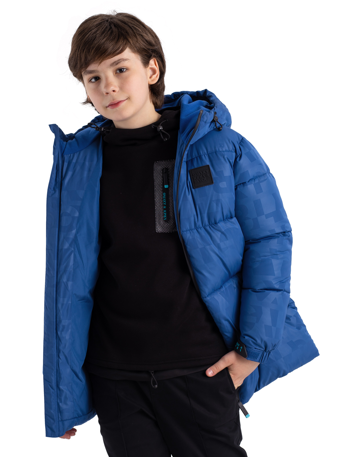 Зимняя куртка для мальчика подростка из принтованной ткани c AC водоотталкивающим покрытием имеет утеплитель - искусственный пух весом 300г/м2. Куртка дополнена ветрозащитными, непромокаемыми «молниями». Капюшон несъемный, по краю капюшона регулируемая кулиса, высокий воротник изнутри утеплен флисом. Модель имеет внутренние манжеты из риба, внешние манжеты с силиконовыми патами для регулировки и функциональные карманы. Пуховик декорирован силиконовым патчем.