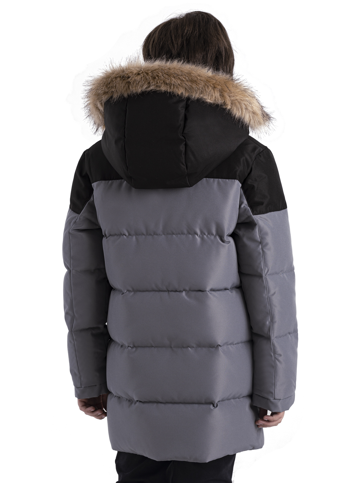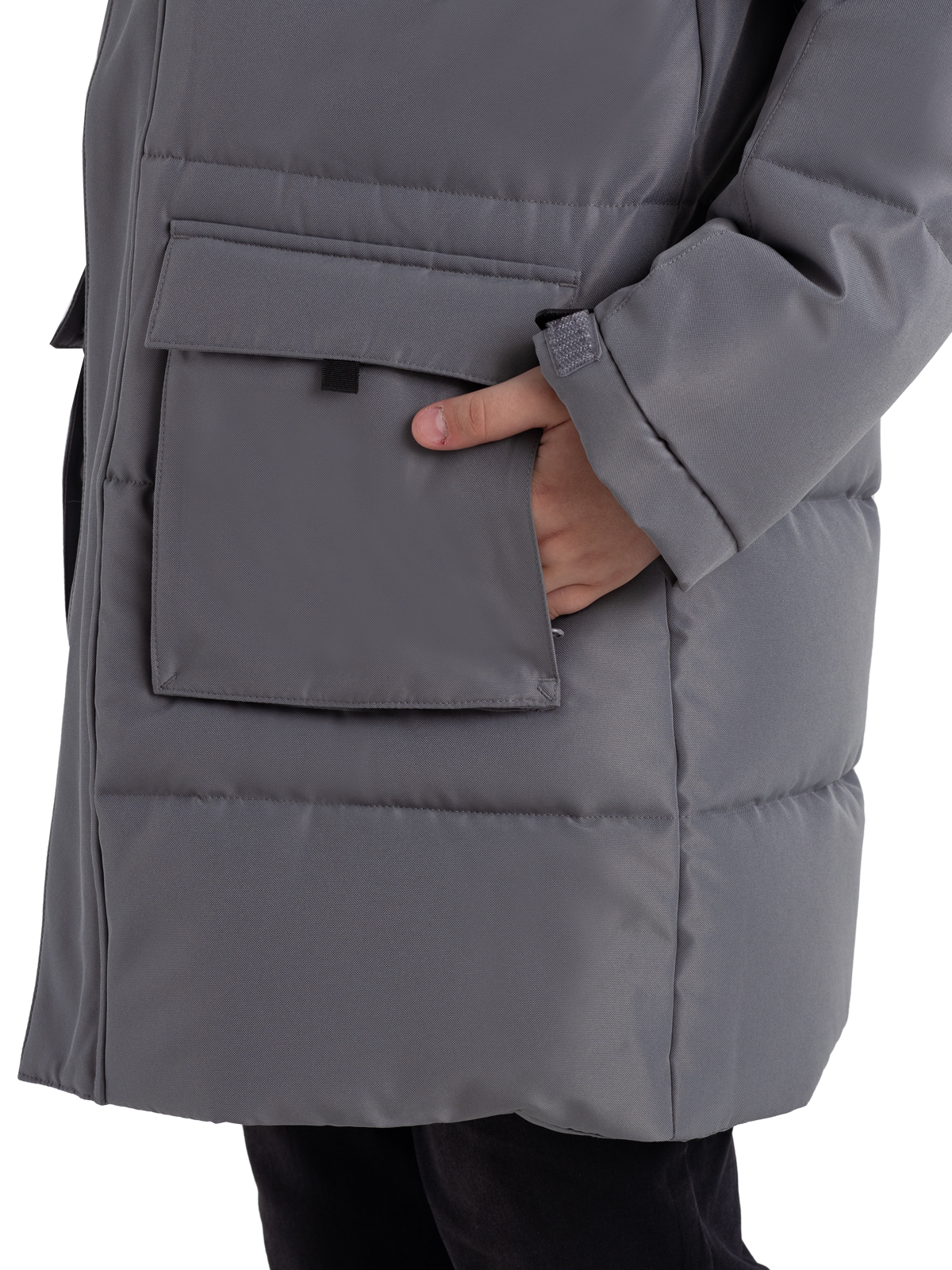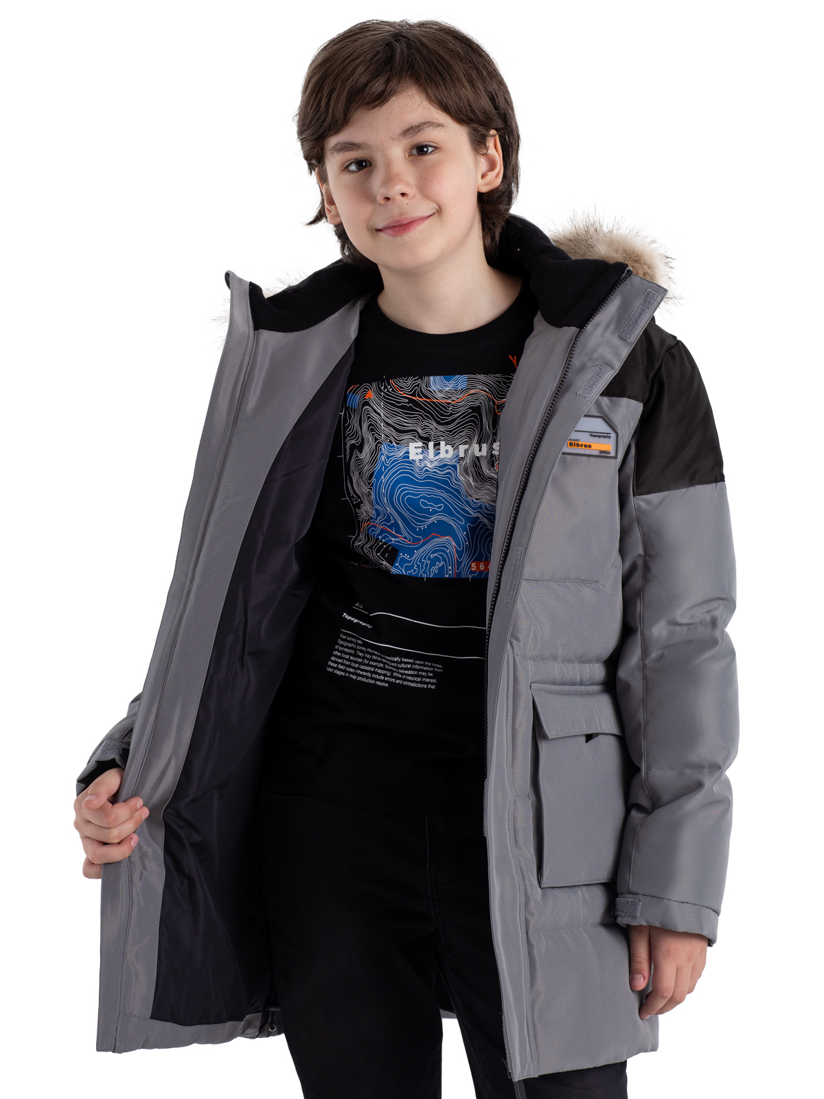 Зимняя двухцветная удлиненная куртка для мальчика-подростка из влагозащитной, грязеотталкивающей, не продуваемой мембранной ткани 5000мм/5000г/м2/24ч, имеет утеплитель - искусственный пух 300г/м2. Съемный капюшон имеет регулируемую кулису по краю, и декорирован отстегивающимся мехом. Высокий воротник, манжеты из риба и ветрозащитная планка на липучках надежно защищают от ветра. Куртка имеет два накладных кармана, функциональные карманы на груди, и дополнена декоративными силиконовыми патчами.