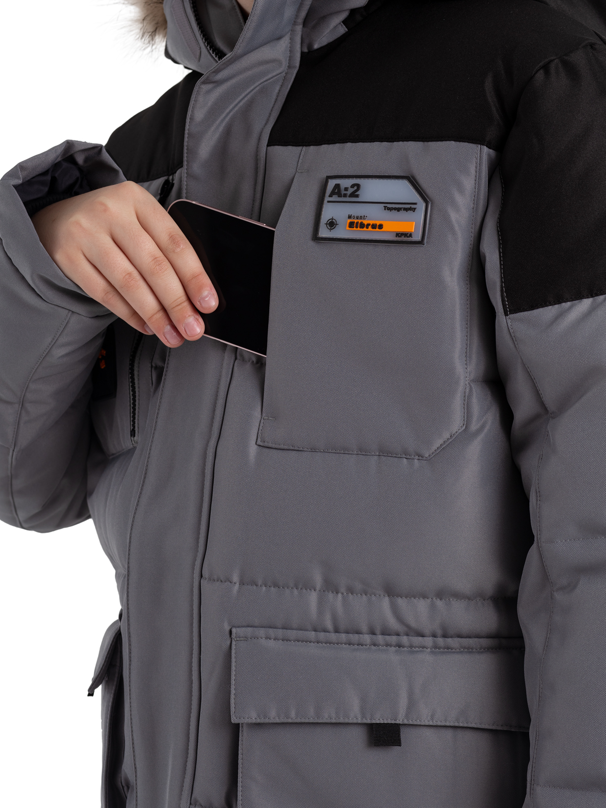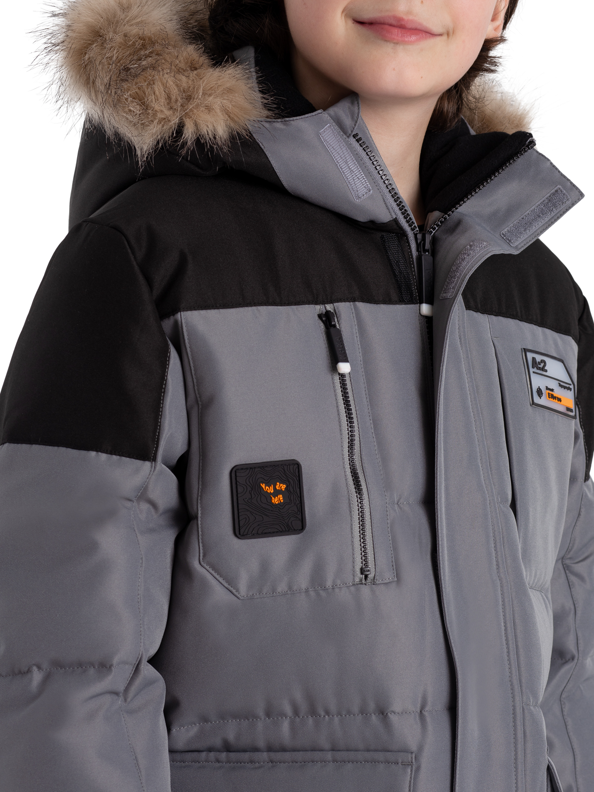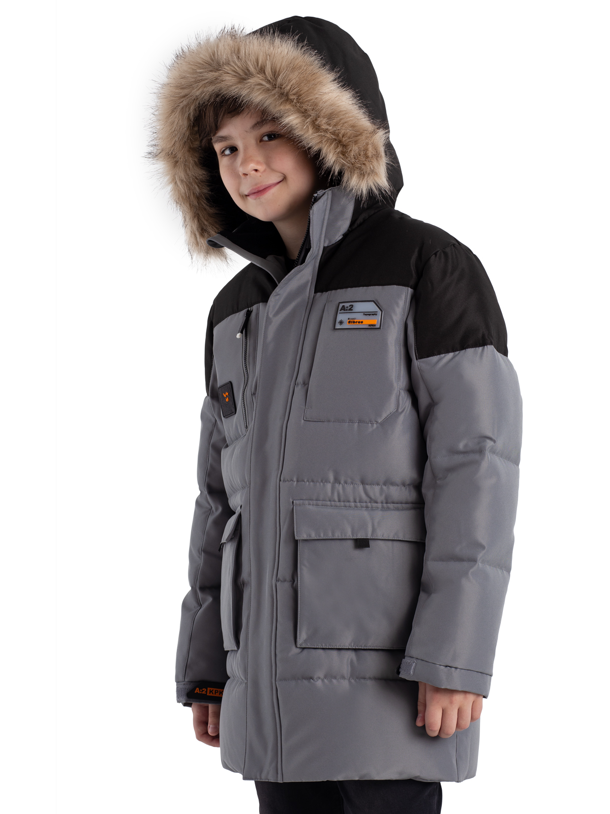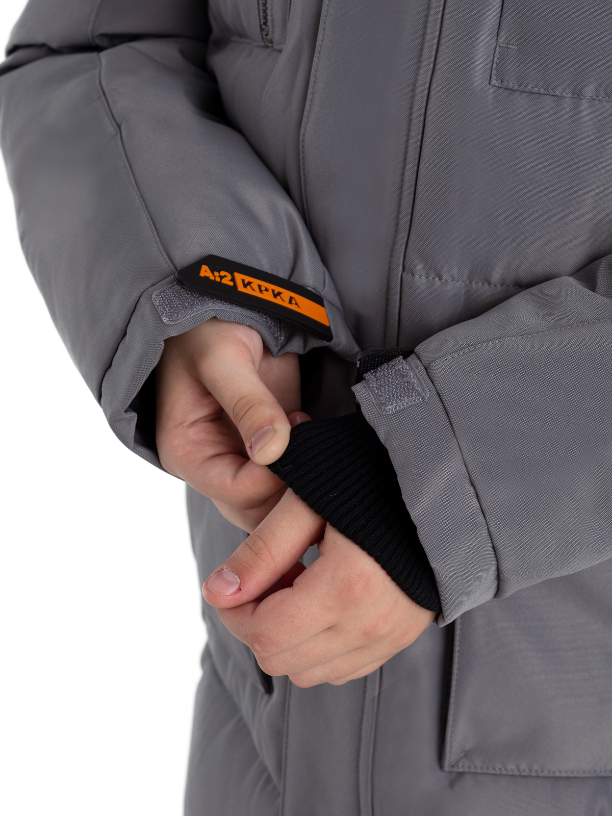 Зимняя двухцветная удлиненная куртка для мальчика-подростка из влагозащитной, грязеотталкивающей, не продуваемой мембранной ткани 5000мм/5000г/м2/24ч, имеет утеплитель - искусственный пух 300г/м2. Съемный капюшон имеет регулируемую кулису по краю, и декорирован отстегивающимся мехом. Высокий воротник, манжеты из риба и ветрозащитная планка на липучках надежно защищают от ветра. Куртка имеет два накладных кармана, функциональные карманы на груди, и дополнена декоративными силиконовыми патчами.