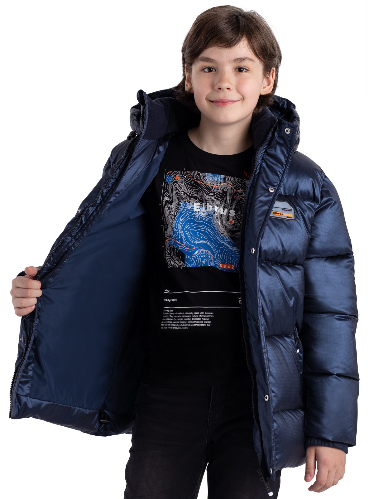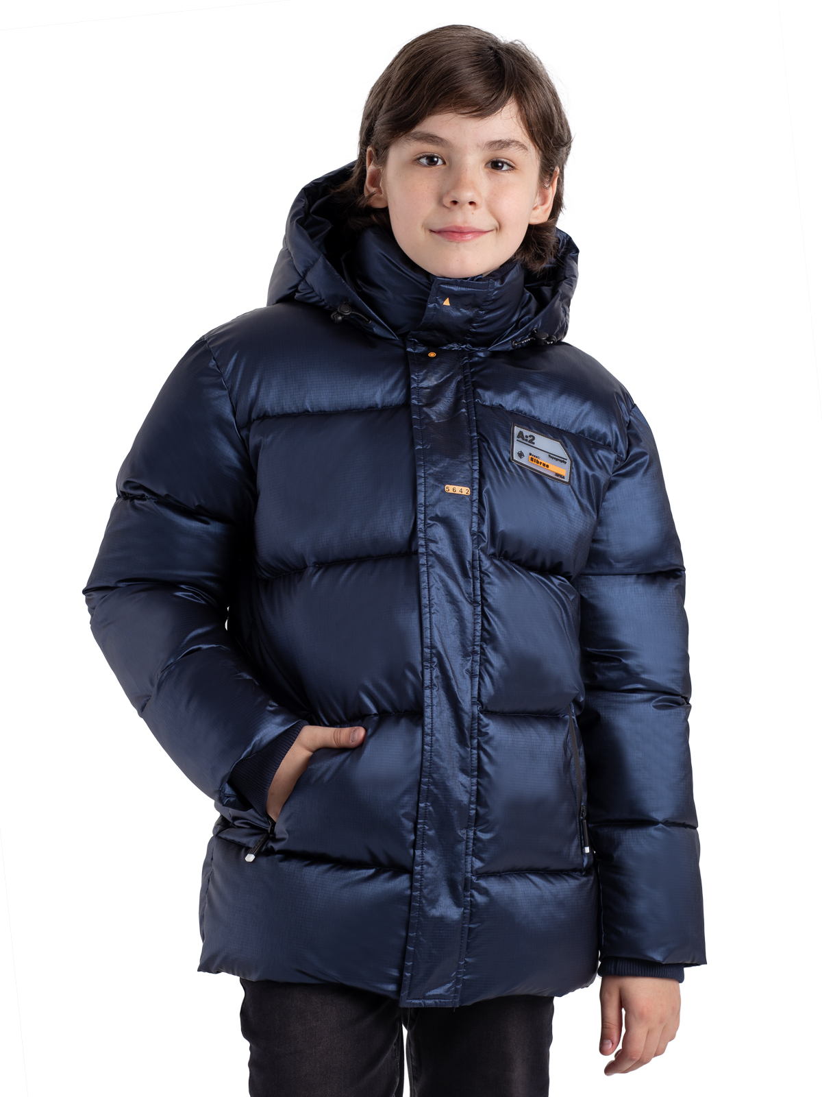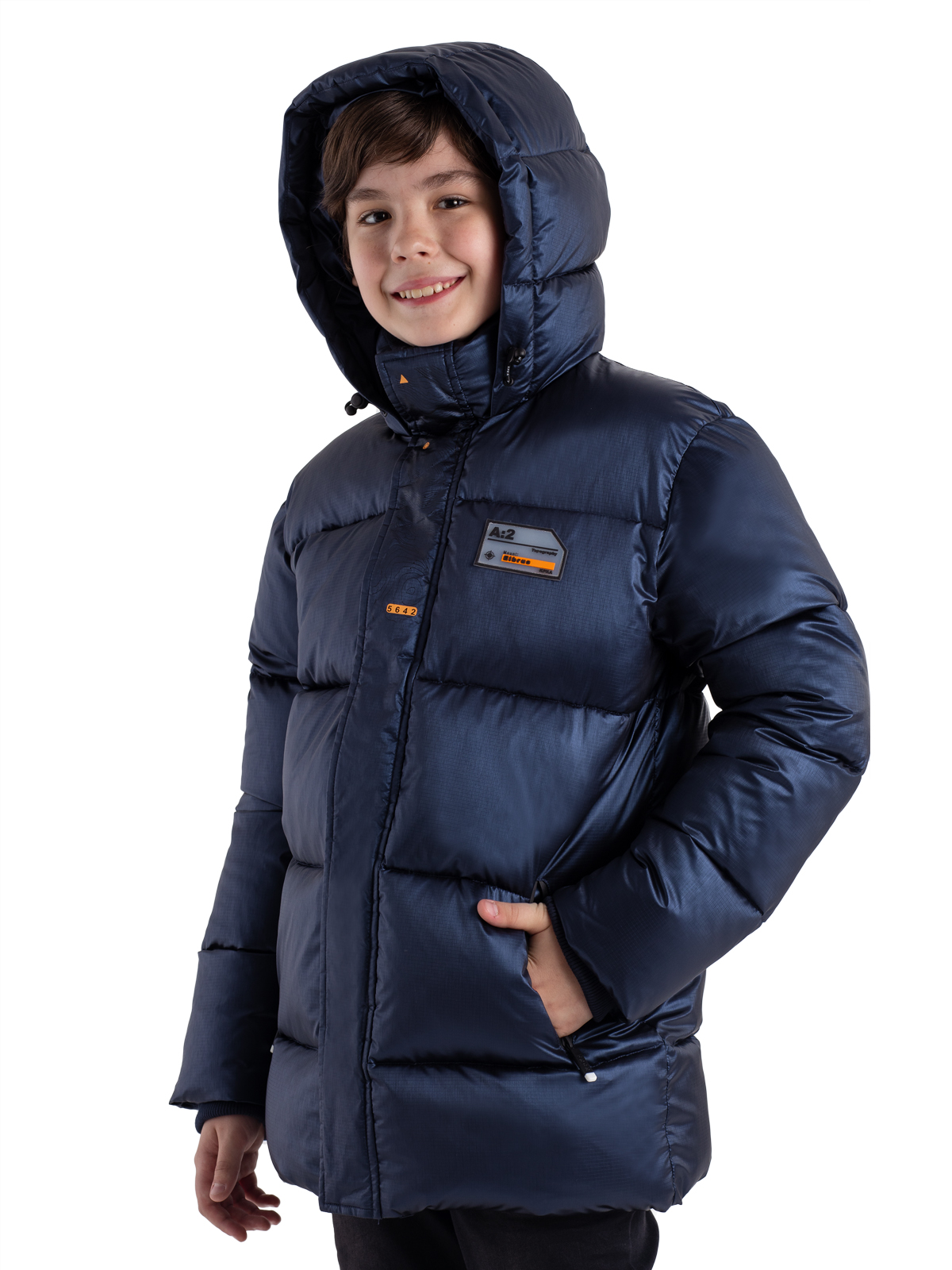 Зимняя куртка-пуховик темно-синего цвета в ткани рипстоп имеет утеплитель искусственный пух весом 300г/м2. Капюшон несъемный, по краю капюшона регулируемая кулиса, воротник изнутри утеплен флисом. Ветрозащитная планка на кнопках и манжеты из риба обеспечивает дополнительную защиту от ветра. Функциональные карманы по бокам закрываются на молнии. Куртка дополнена тематическими принтами по планке, брендированной фурнитурой и стильным силиконовым патчем на груди.