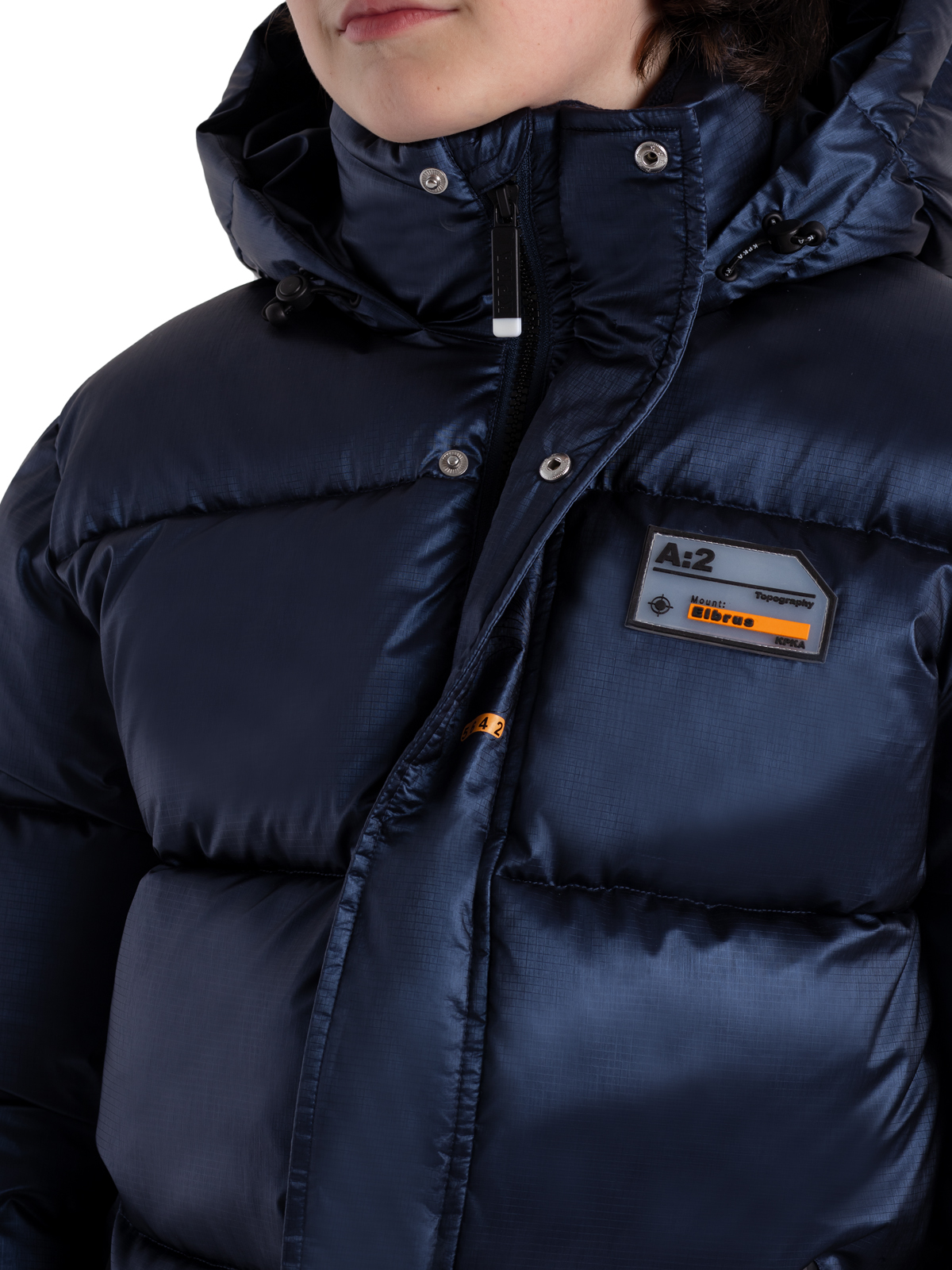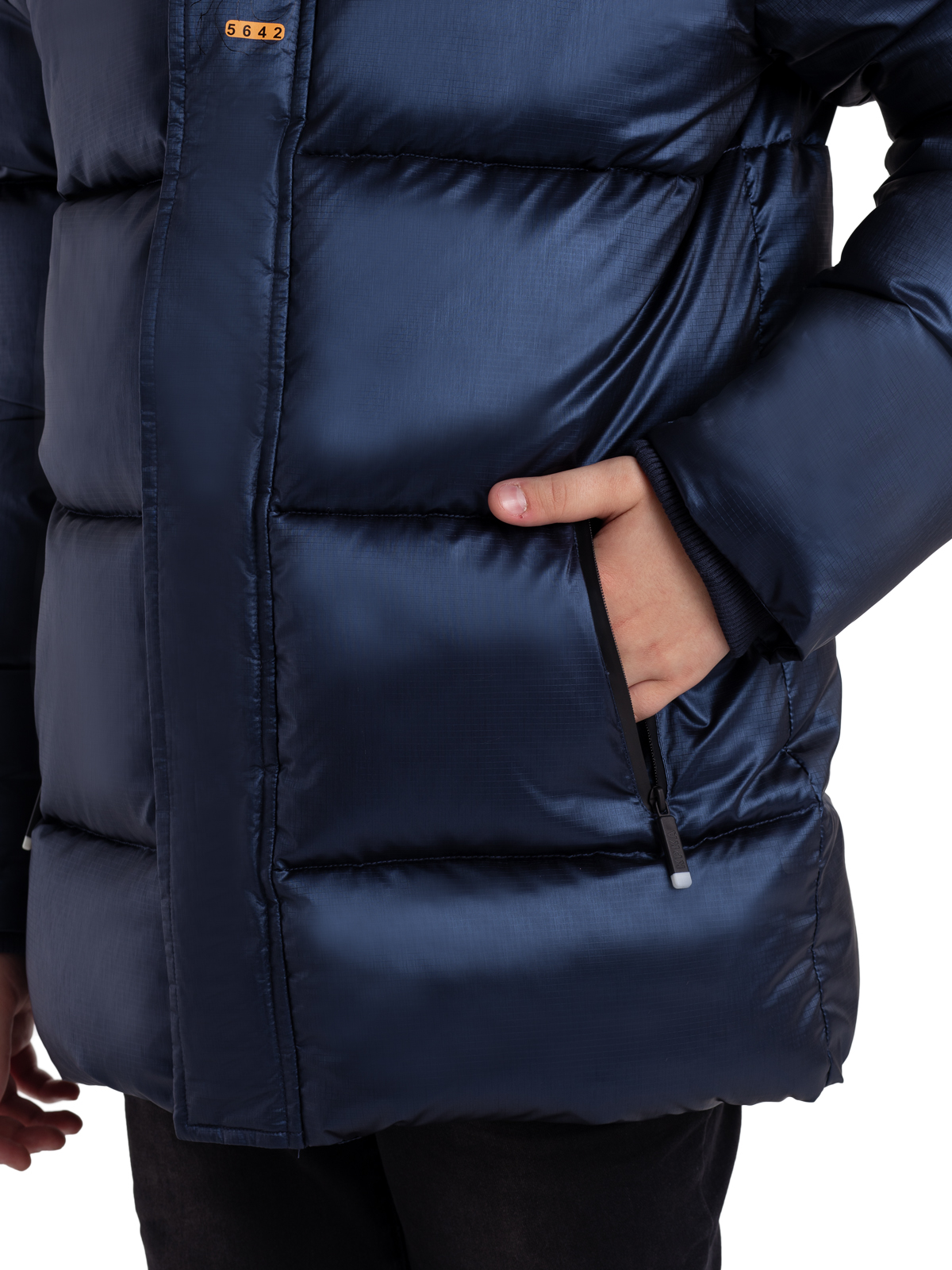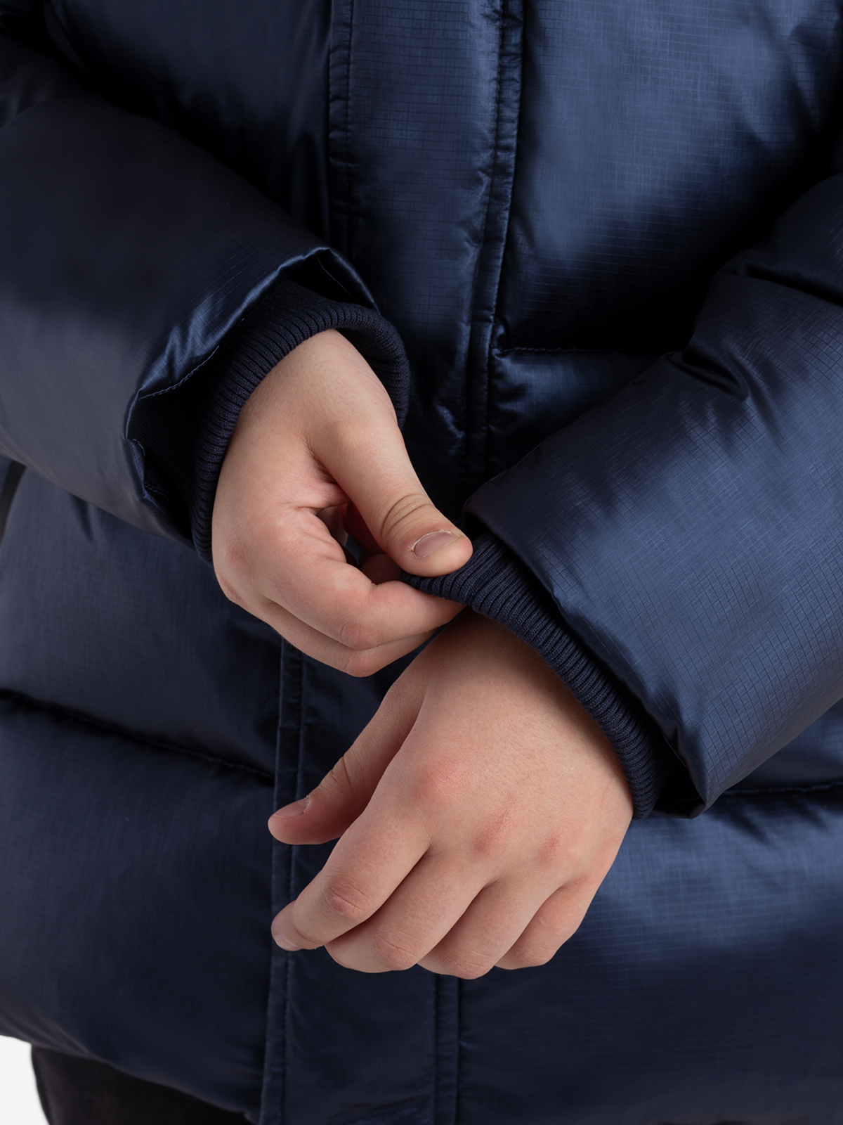Зимняя куртка-пуховик темно-синего цвета в ткани рипстоп имеет утеплитель искусственный пух весом 300г/м2. Капюшон несъемный, по краю капюшона регулируемая кулиса, воротник изнутри утеплен флисом. Ветрозащитная планка на кнопках и манжеты из риба обеспечивает дополнительную защиту от ветра. Функциональные карманы по бокам закрываются на молнии. Куртка дополнена тематическими принтами по планке, брендированной фурнитурой и стильным силиконовым патчем на груди.