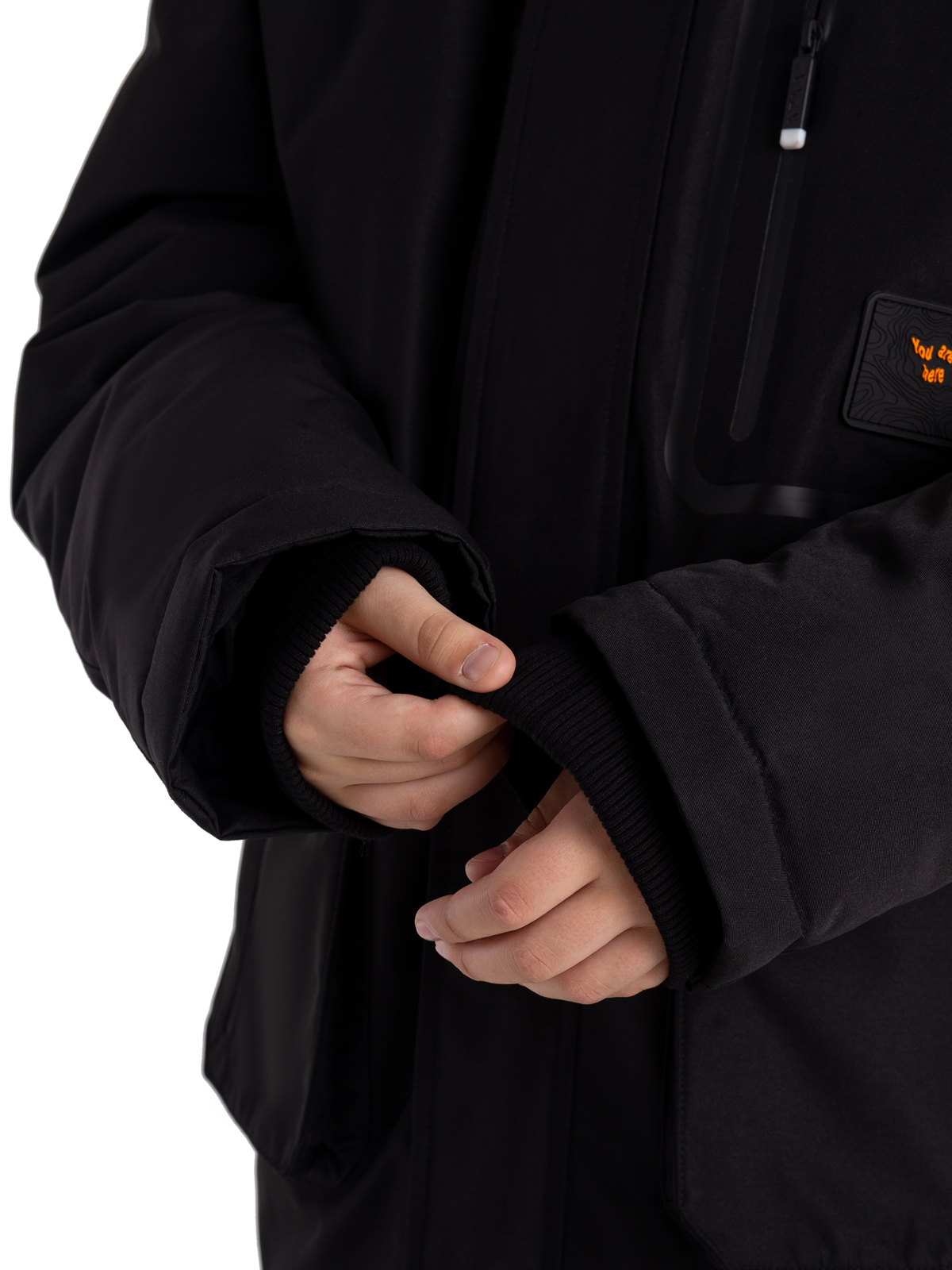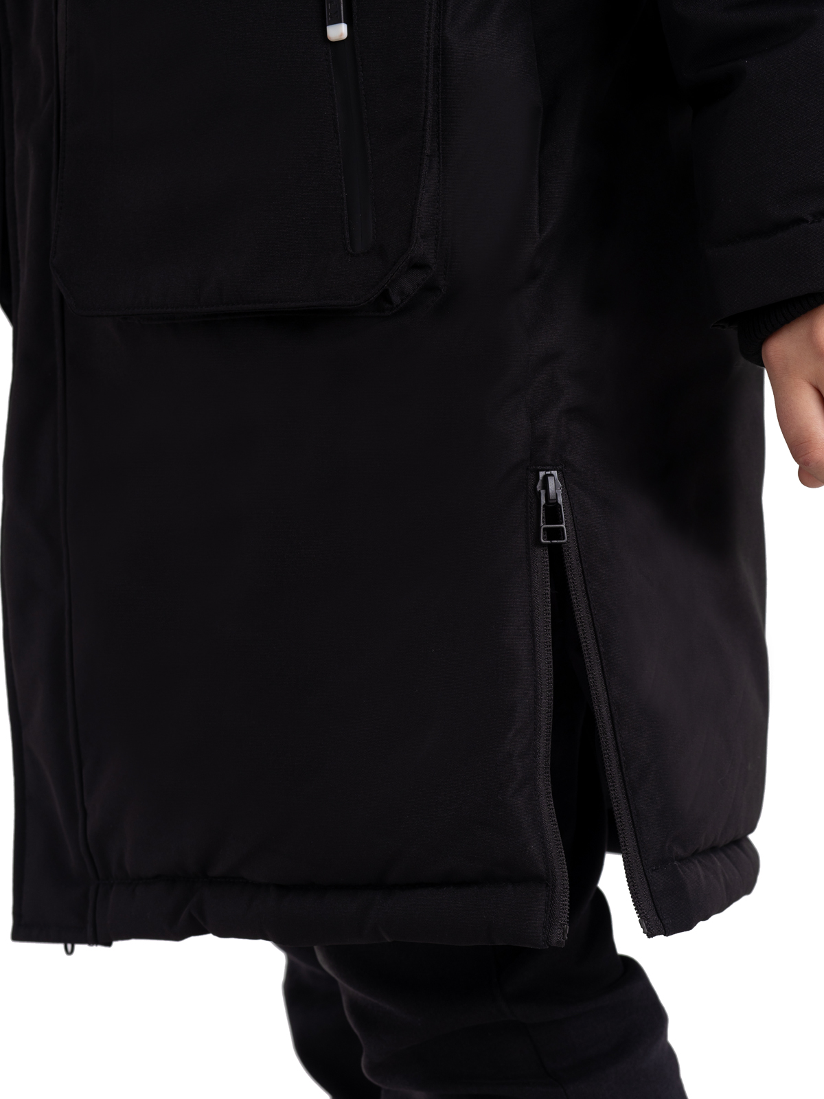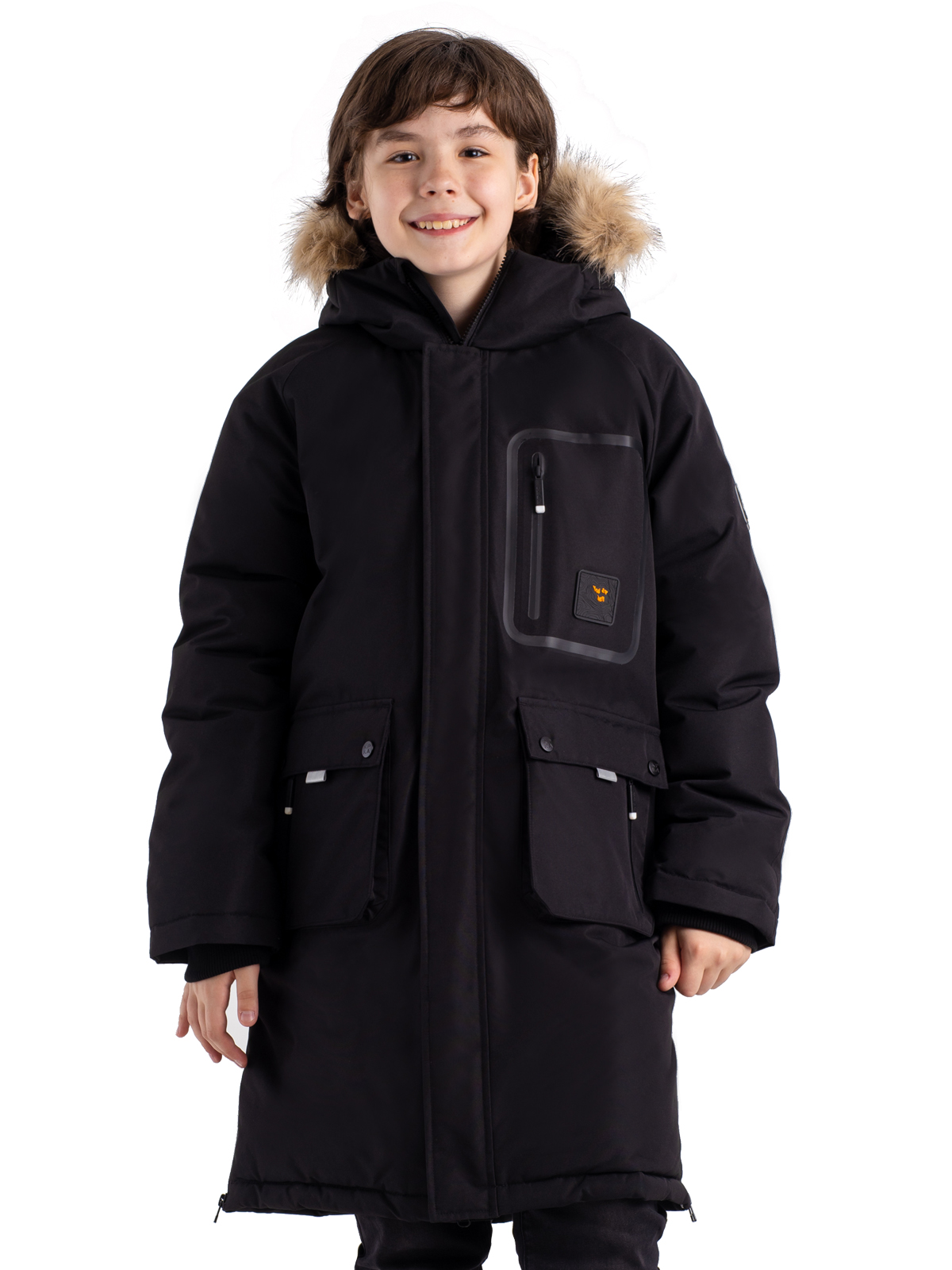 Зимний удлиненный пуховик для для мальчика-подростка из влагозащитной, грязеотталкивающей, не продуваемой мембранной ткани 5000мм/5000г/м2/24ч, имеет утеплитель - искусственный пух 300г/м2. Съемный капюшон имеет регулируемую кулису по краю, и декорирован отстегивающимся мехом. Высокий воротник, манжеты из риба и ветрозащитная планка на липучках надежно защищают от ветра. Молнии по низу изделия для регулировки ширины - добавляют удобства. Куртка имеет два накладных кармана, функциональный карман на груди, и дополнена декоративными силиконовыми патчами.